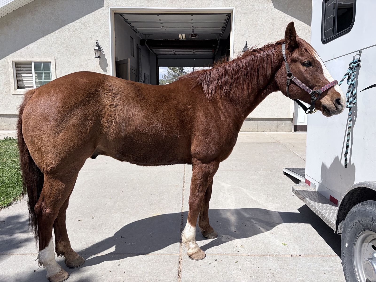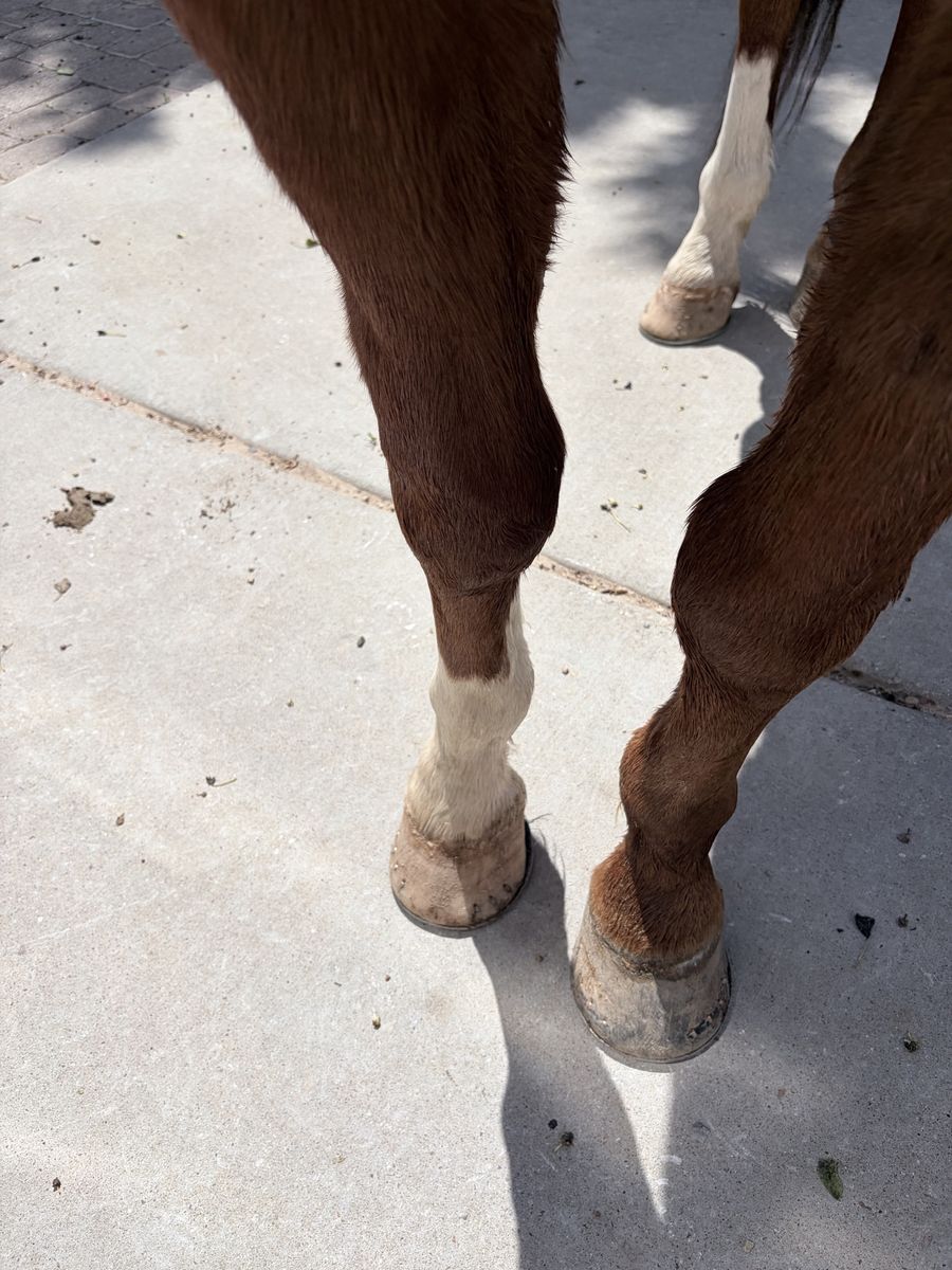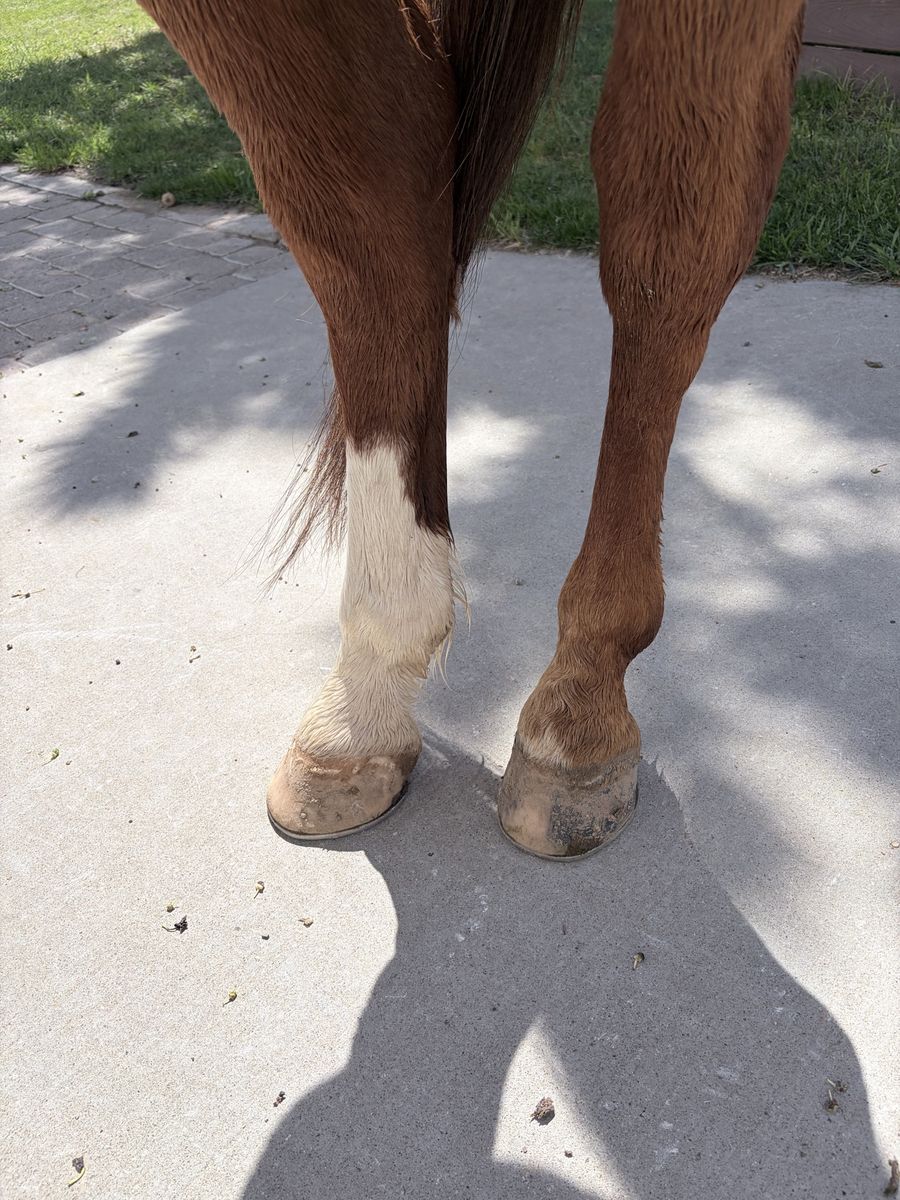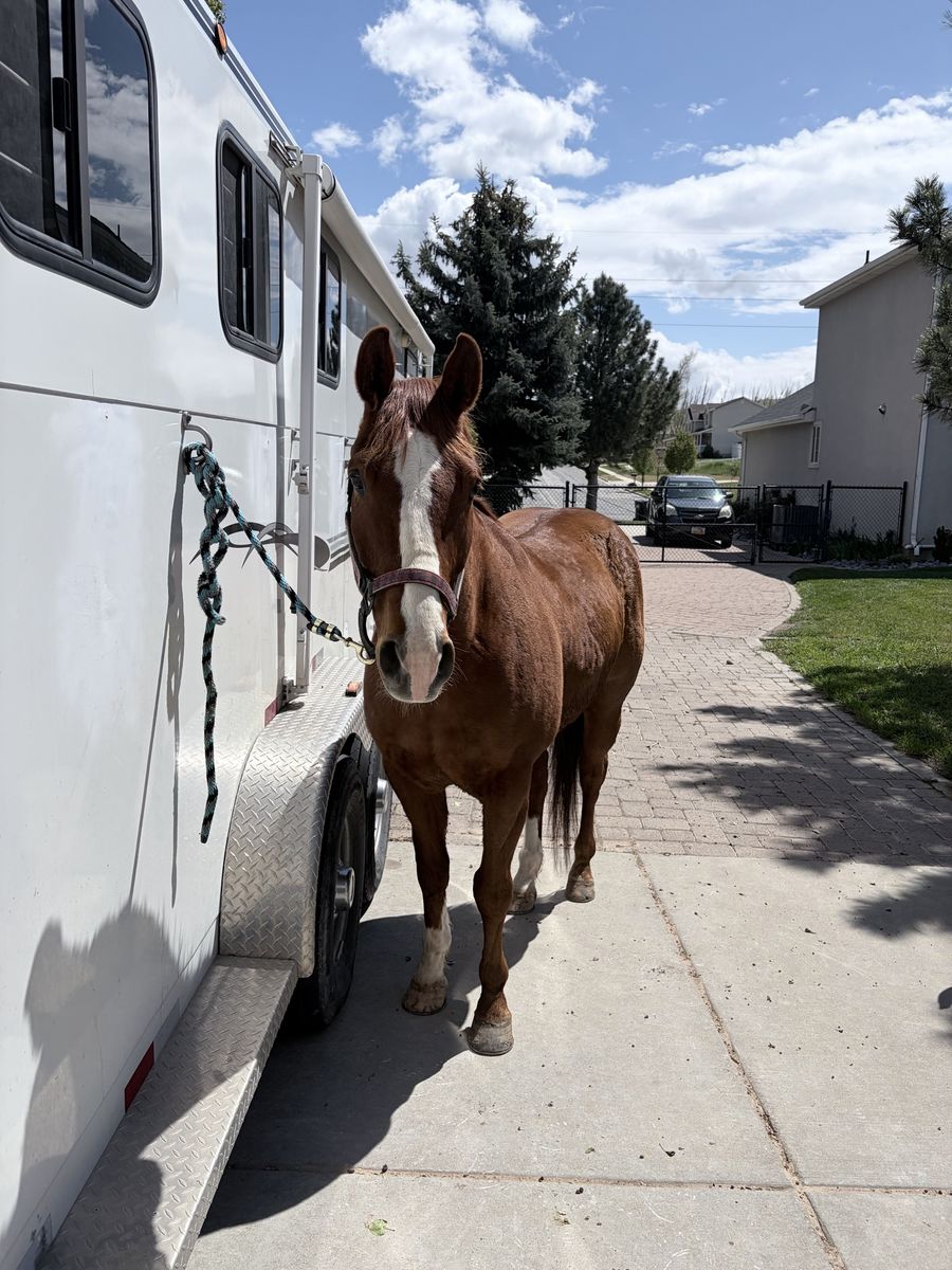 Rooster stands for experienced farriers and is currently in “EGG BAR” shoes. Rooster loads and unloads independently. Daily exercise, and turnout is recommended. Rooster thrives when competing, but requires ongoing maintenance, consistent conditioning, and rest time after events.