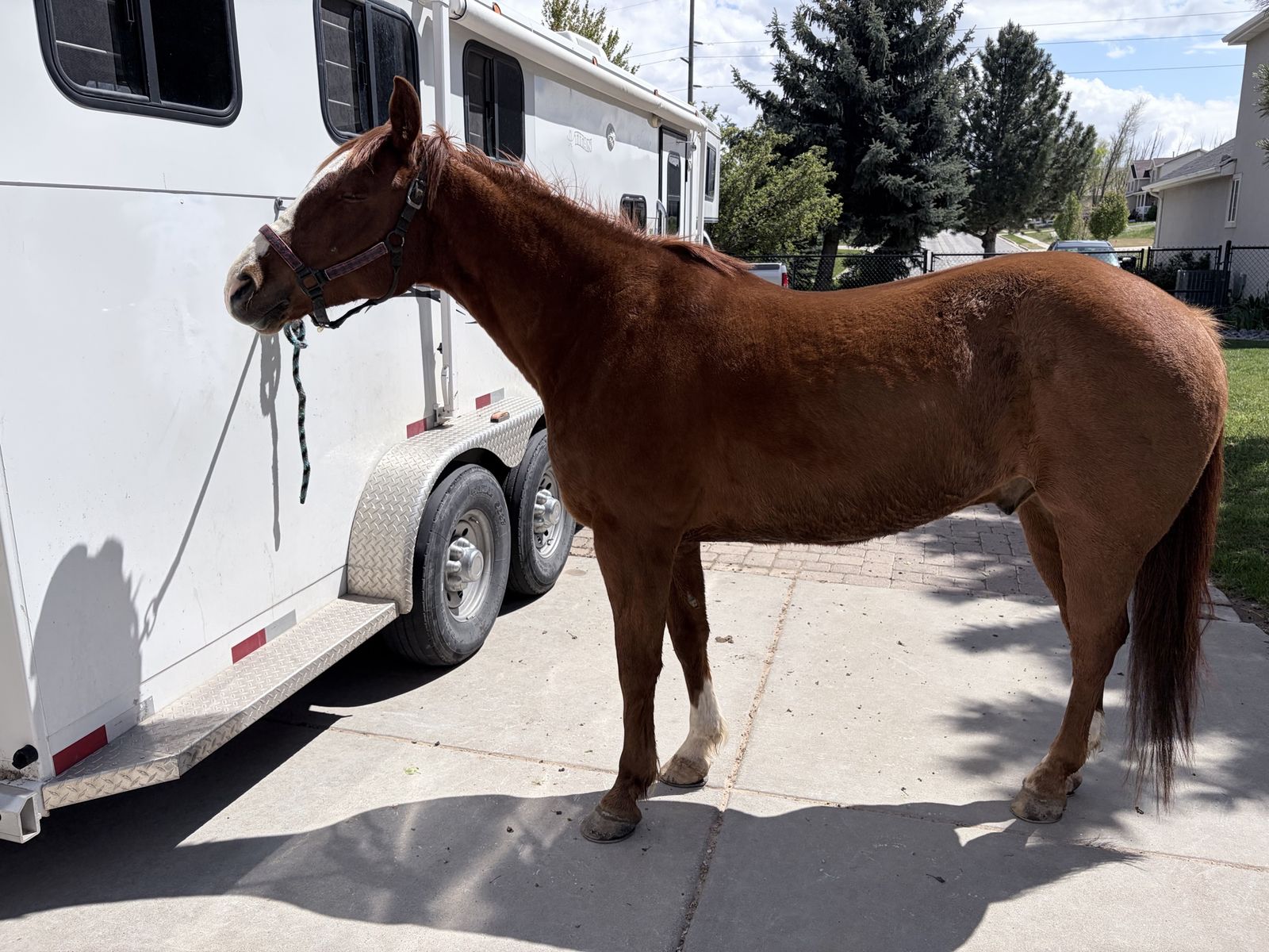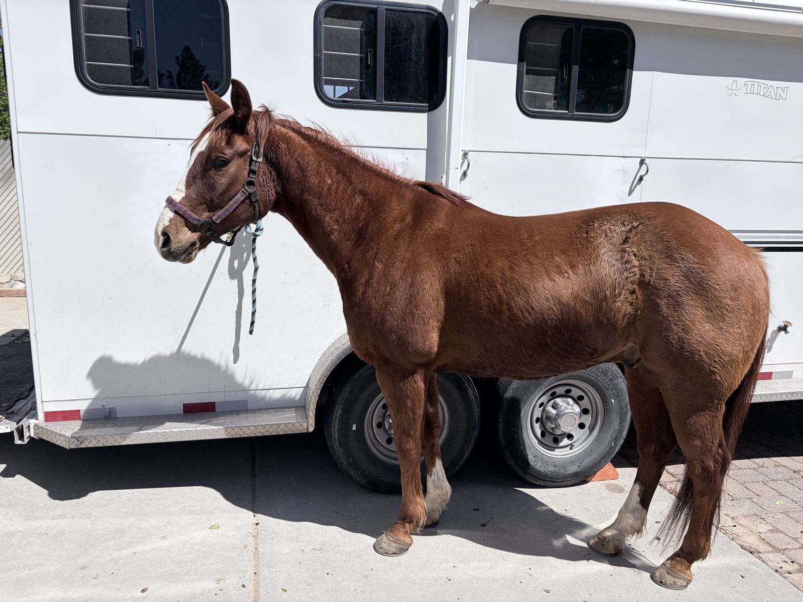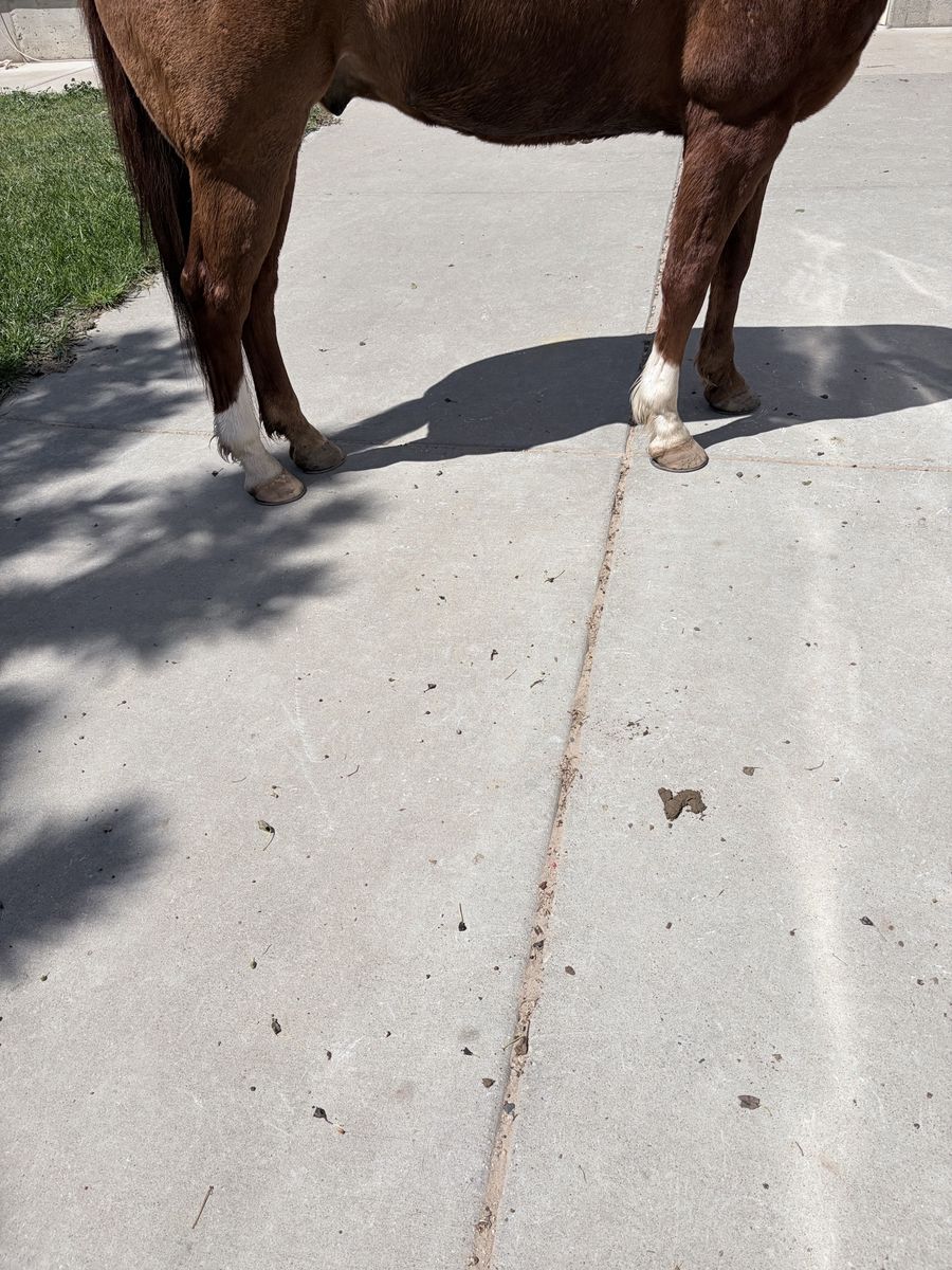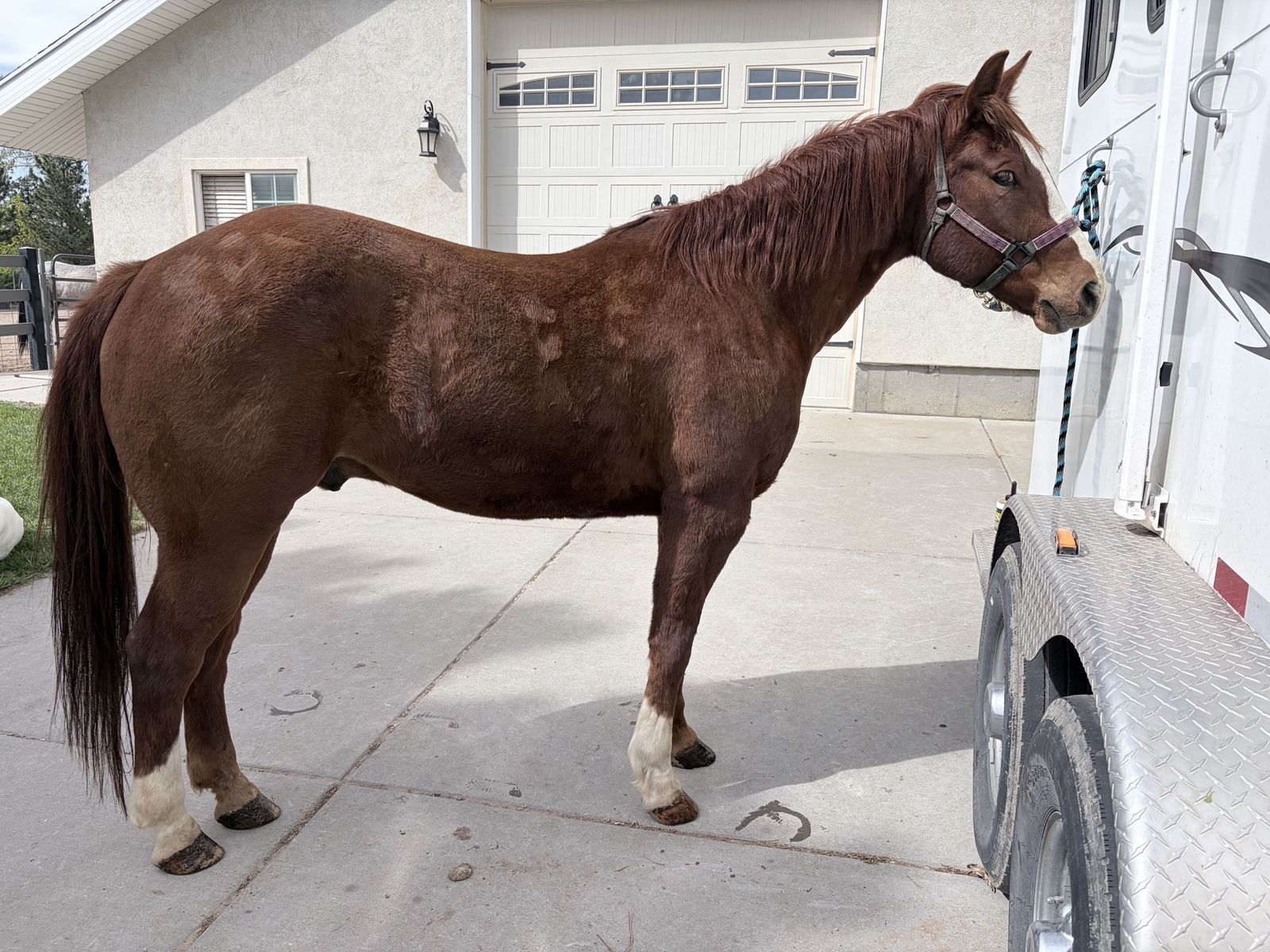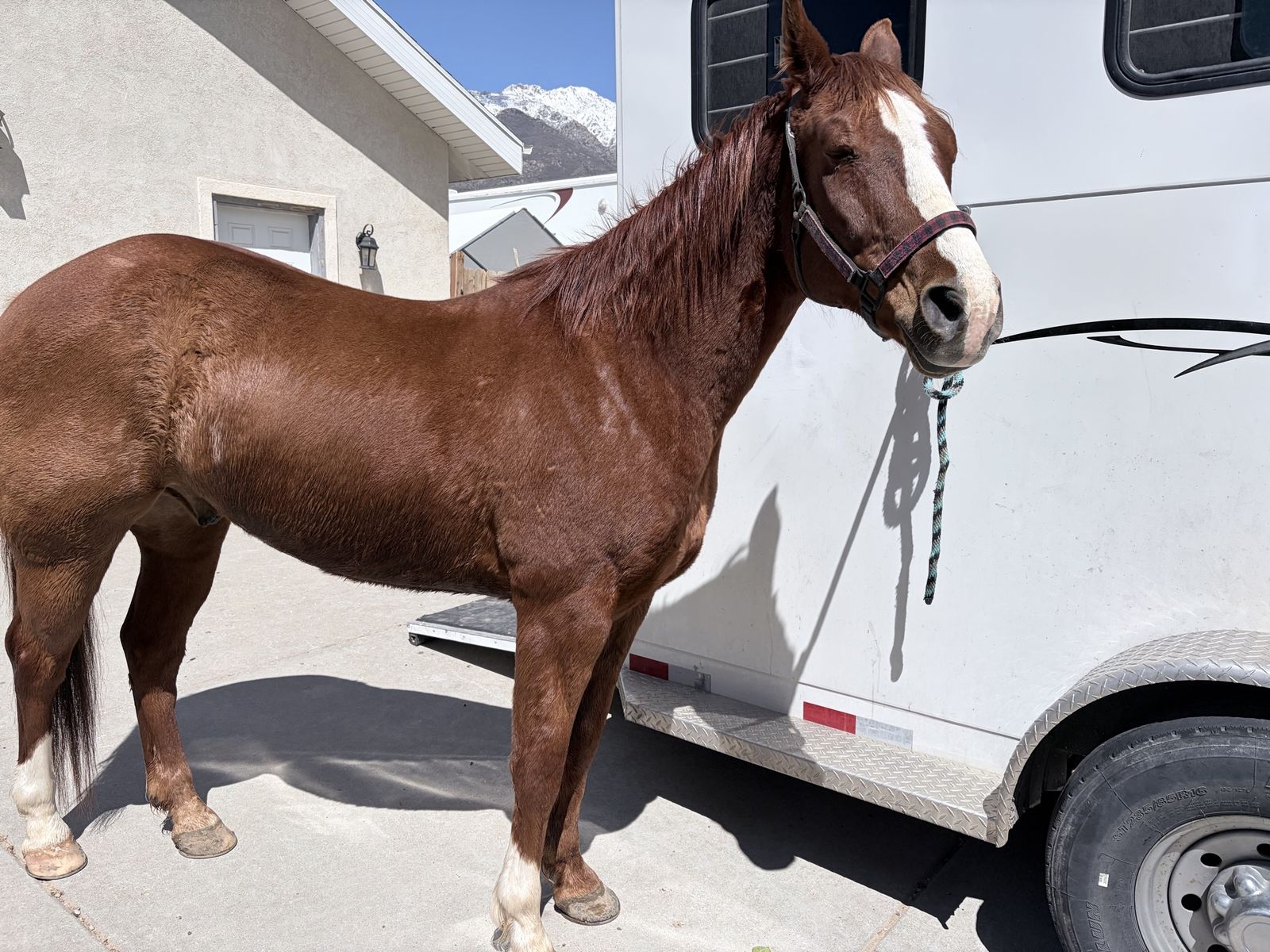 Rooster stands for experienced farriers and is currently in “EGG BAR” shoes. Rooster loads and unloads independently. Daily exercise, and turnout is recommended. Rooster thrives when competing, but requires ongoing maintenance, consistent conditioning, and rest time after events.