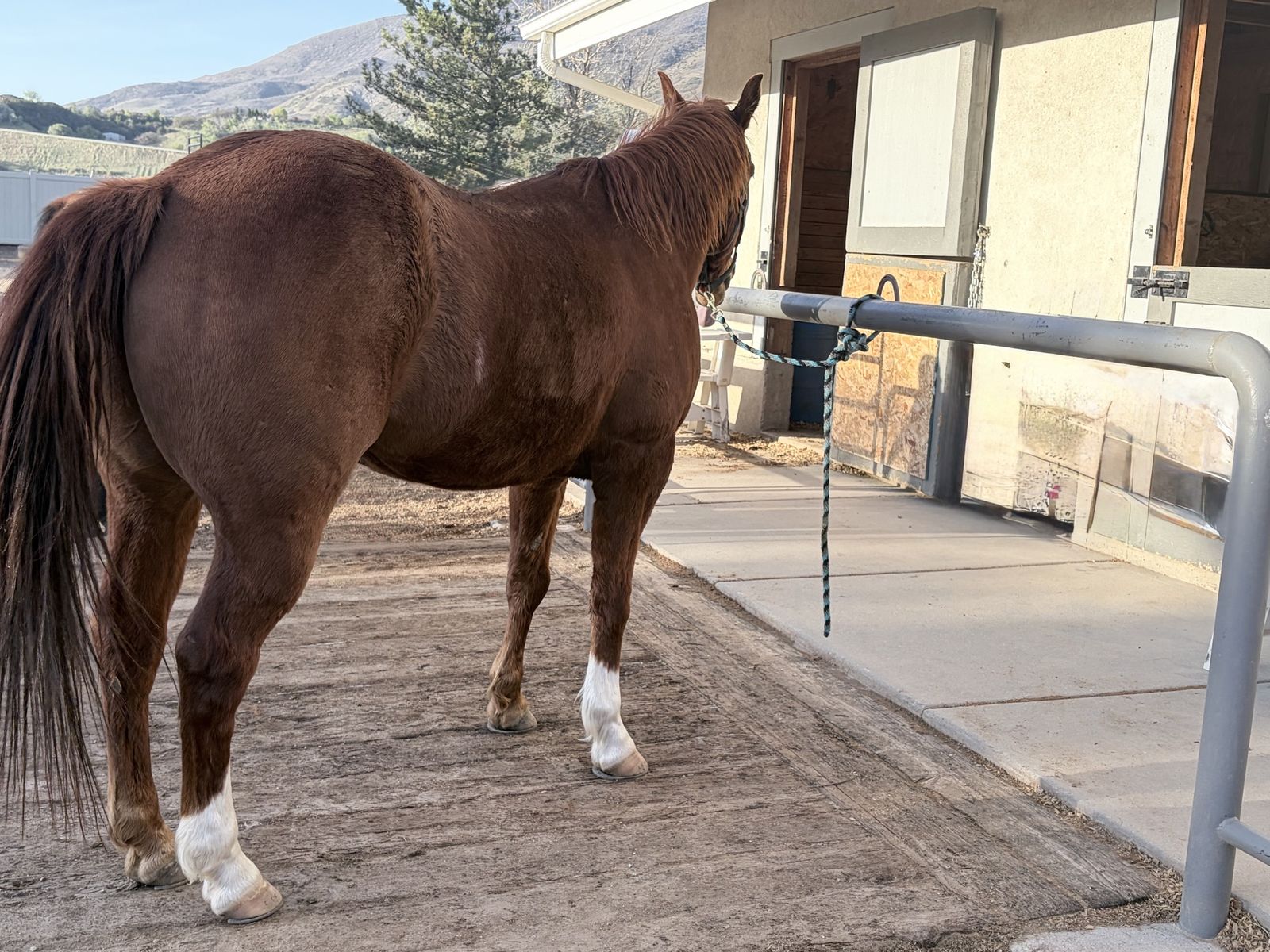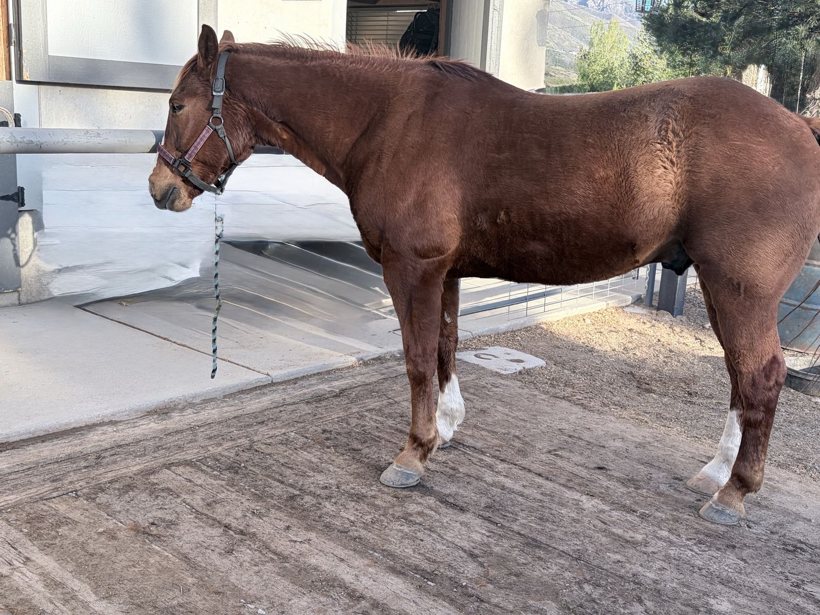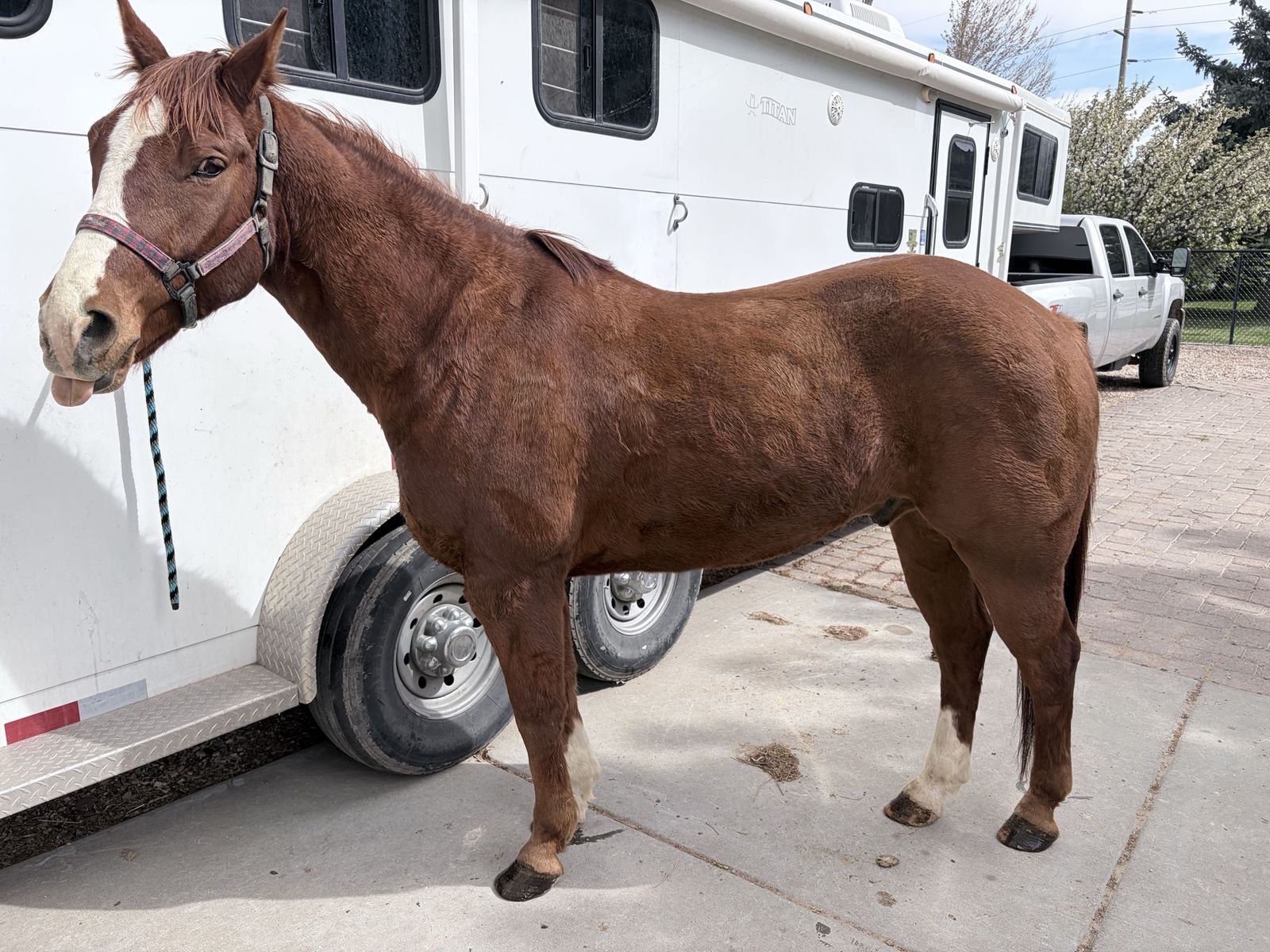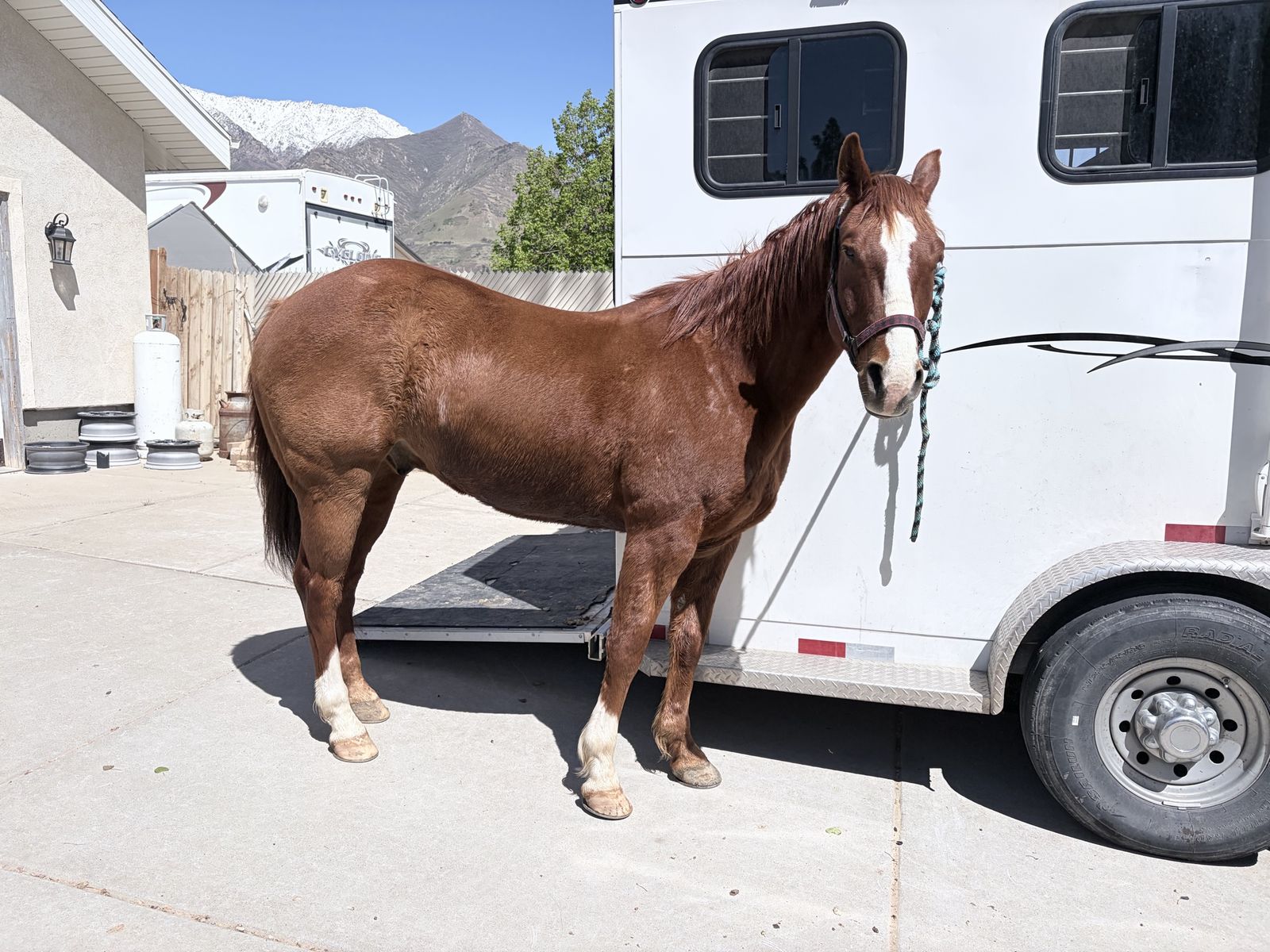 Rooster stands for experienced farriers and is currently in “EGG BAR” shoes. Rooster loads and unloads independently. Daily exercise, and turnout is recommended. Rooster thrives when competing, but requires ongoing maintenance, consistent conditioning, and rest time after events.
