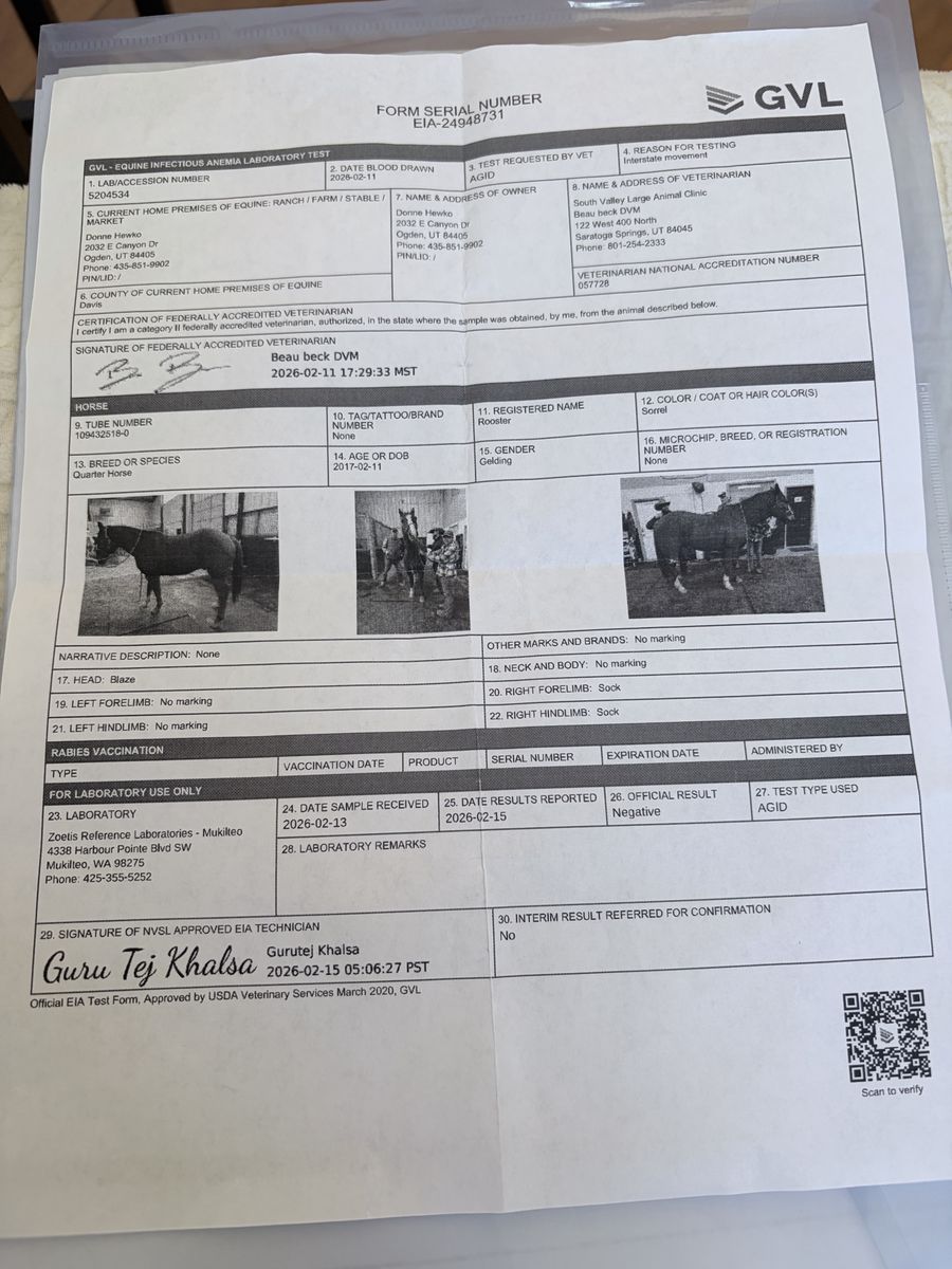 Updated veterinary records are available as of February, 11, 2026, current on immunizations, \
