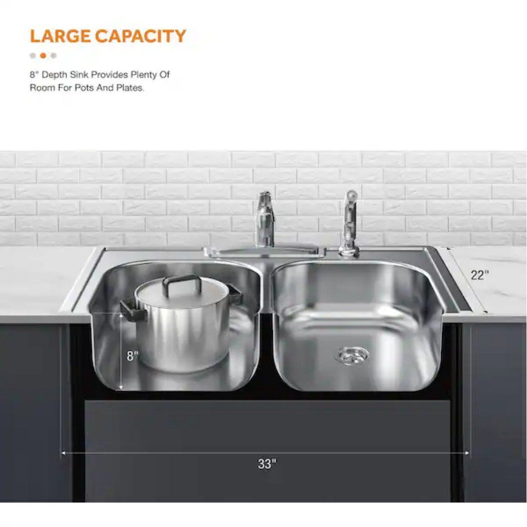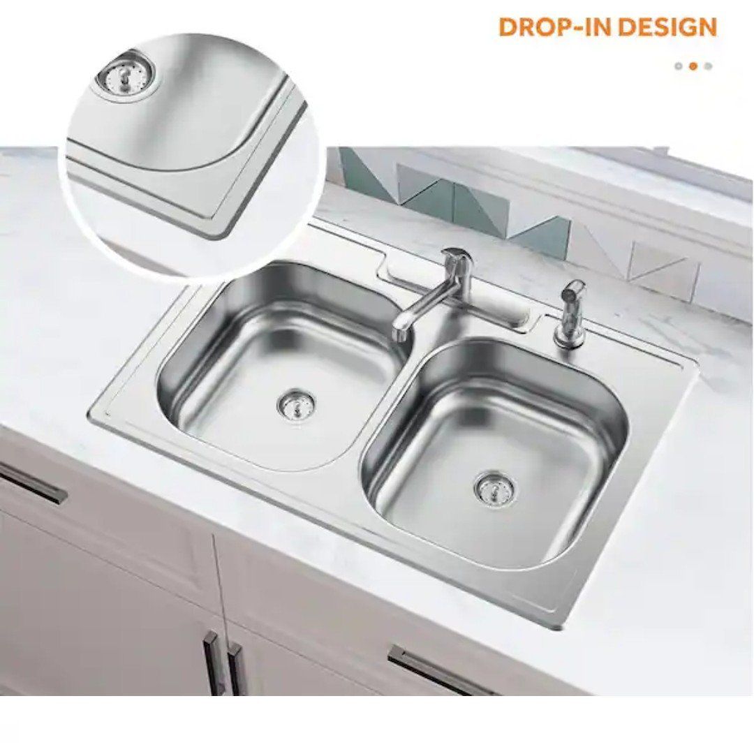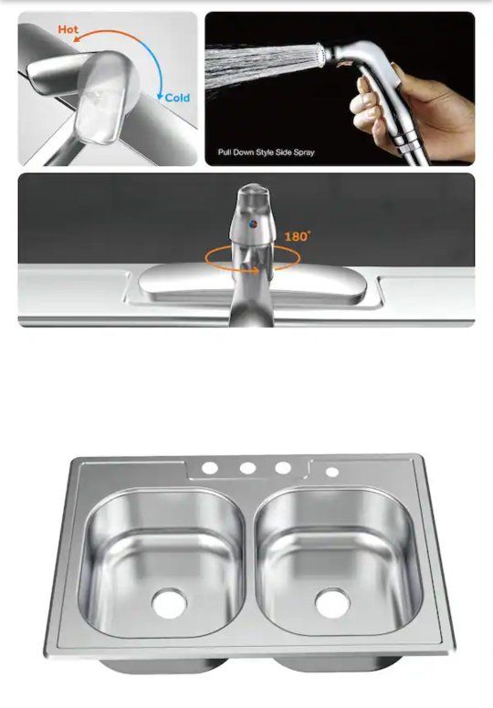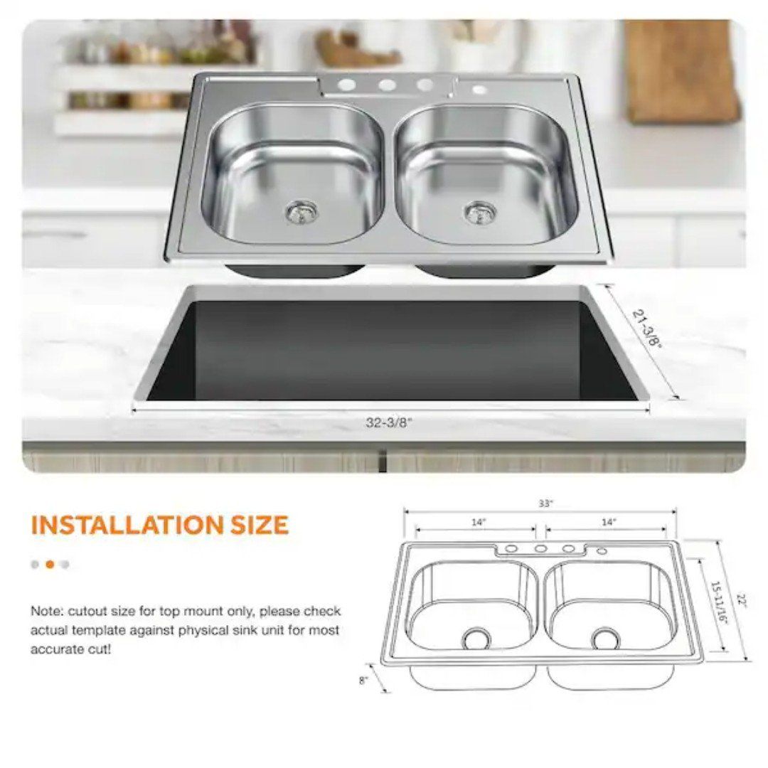 Top Mount All-in-One 33 in. x 22 in. Double Bowl Kitchen Sink features 2-generous basins of equal size to allow for multiple uses at once to help you maximize your workspace. The thick, durable stainless steel has a satin finish for added durability to withstand repeated use. Each basin is fully undercoated to reduce noise and condensation and to maintain water temperature in the sink to keep dishwater warm. For added convenience, pre-drilled faucet holes are ready to accept the faucet included with the sink.