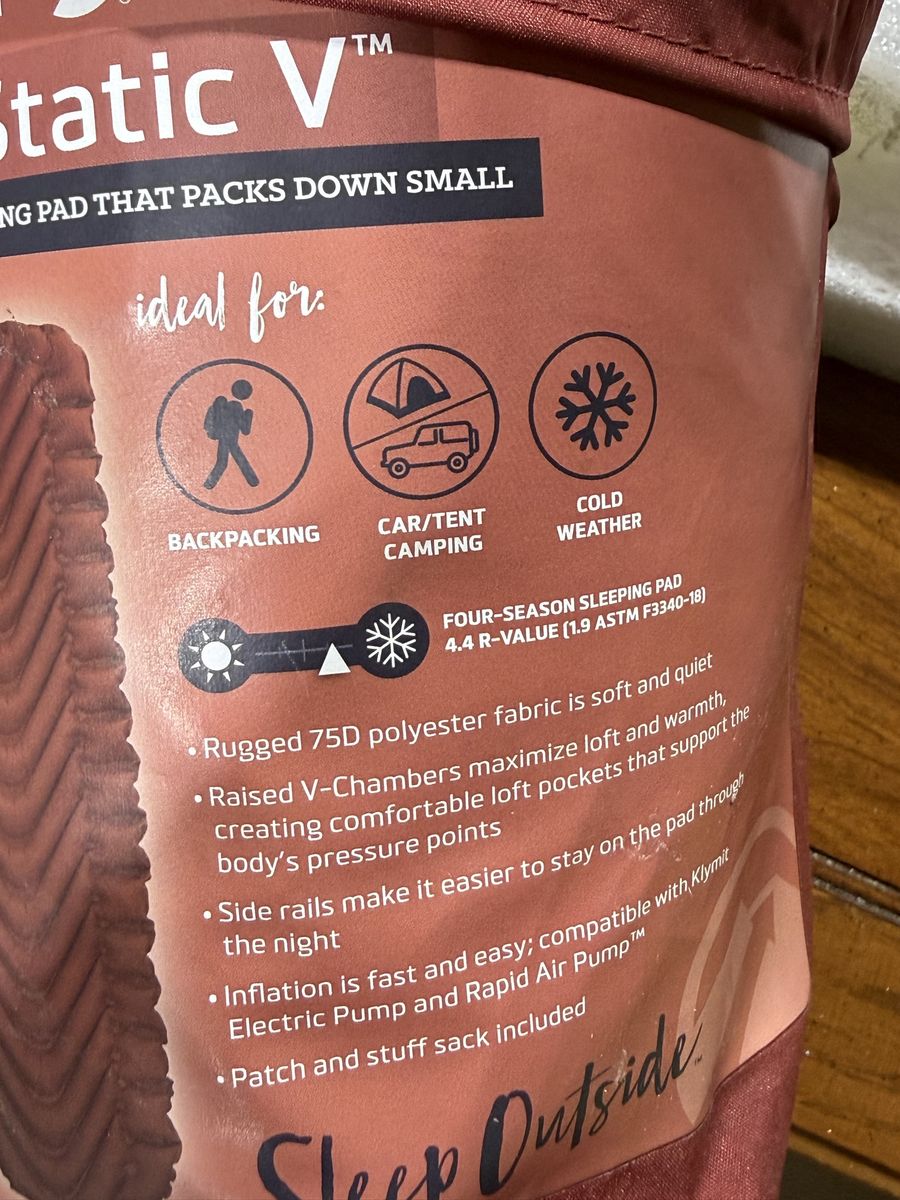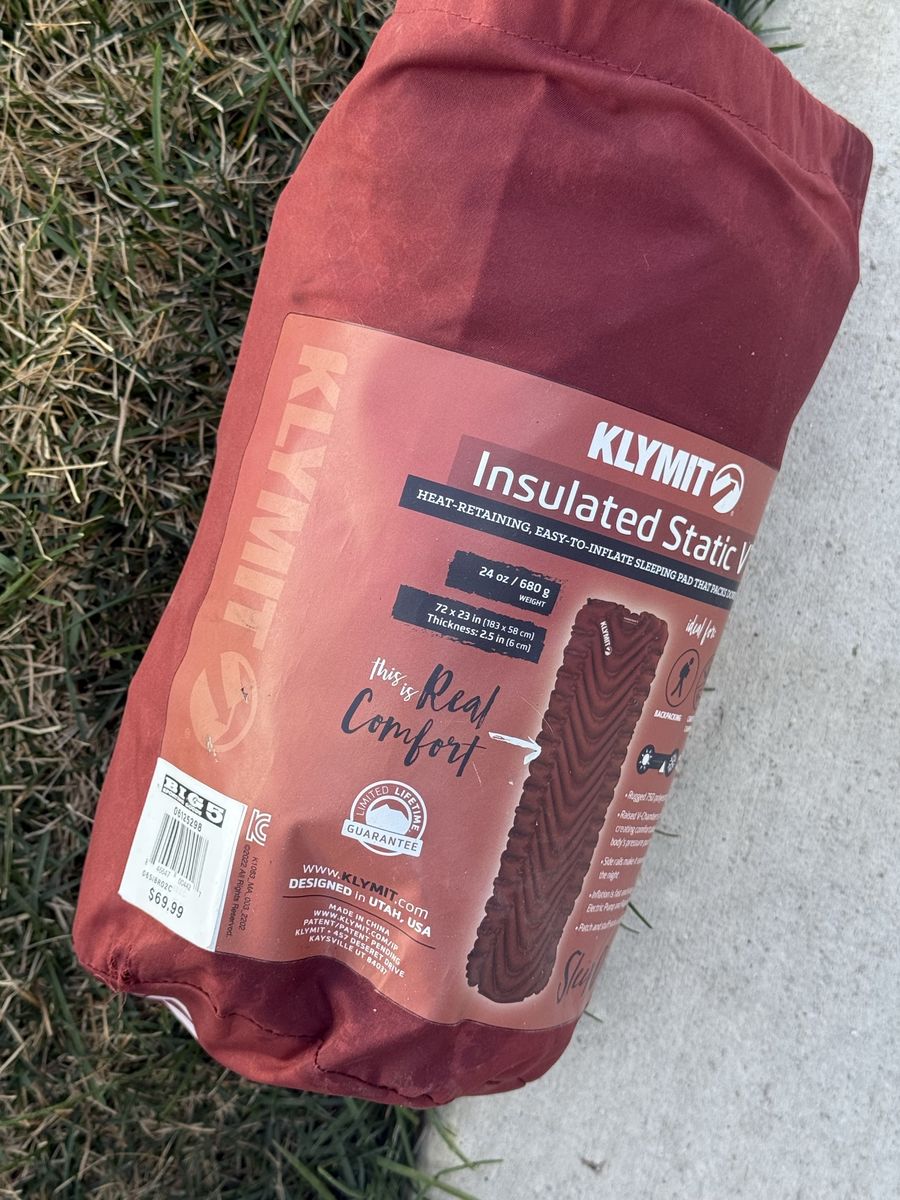 ApplePayInsulated Klymit Static V sleeping pad is red. Lightweight 24 oz pad has 72 x 23 inch dimensions. Thickness is 2.5 inches. Material is rugged 75D polyester. Includes stuff sack.