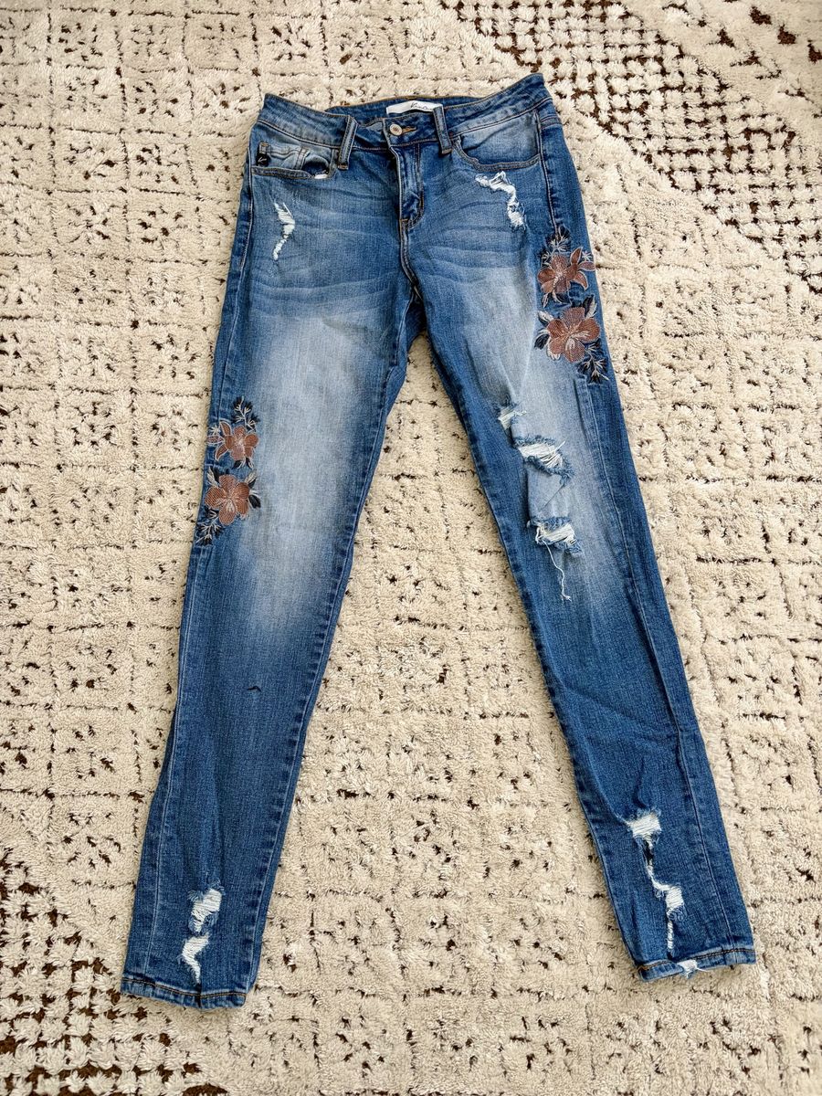 VenmoSelling these gently worn, KanCan dark wash skinny jeans with cute flower patches on each leg. Distressed look. Size 27. They are in excellent condition. Smoke free home. Asking $20.