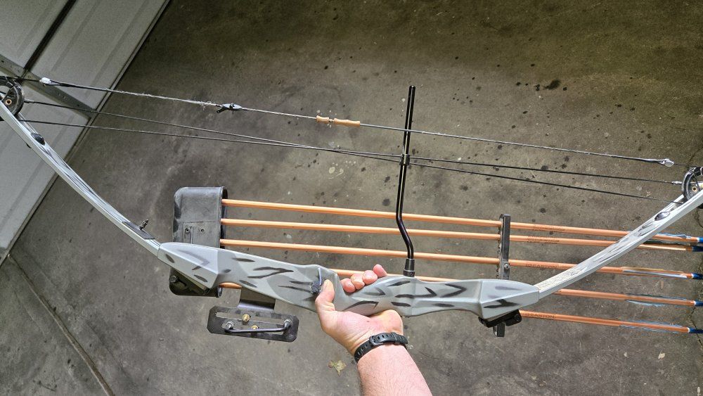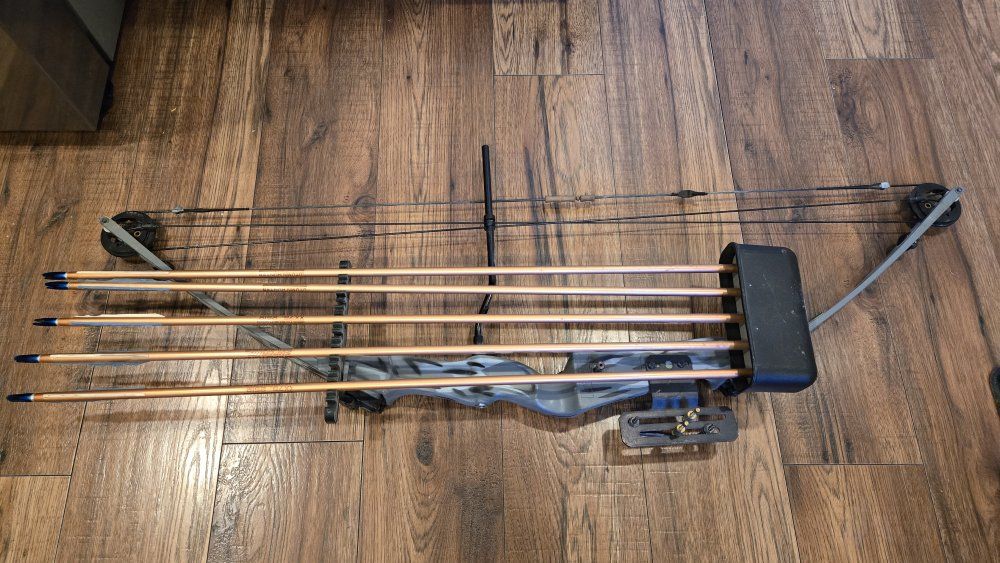 I've had this bow for some time and it just sits. Not sure exactly how old it is but would probably be a decent target bow. Comes with the arrows seen though the fletchings are all toast. Draw weight looks to be between 55-70 and feels strong pulling it back. Has some sights. I don't have any other accessories to go with it. Not totally sure what it's worth but if you're interested, we can discuss.
