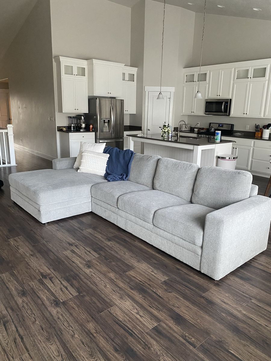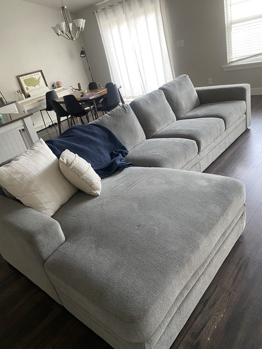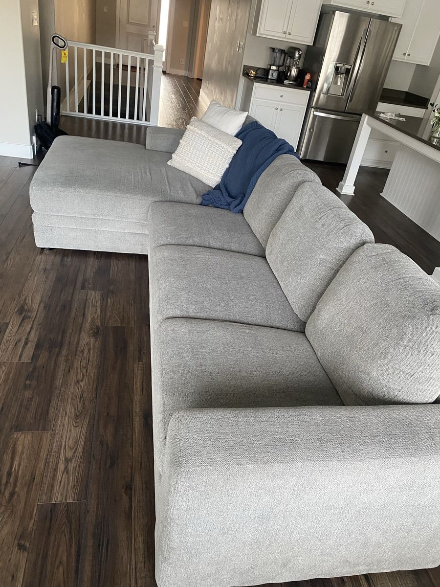 ApplePayComfy couch bought from costco. In great quality and fits a large space. 136x38in chaise is 67in