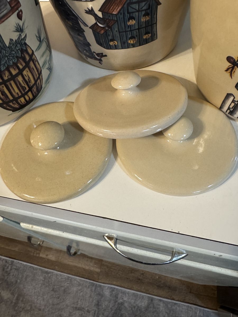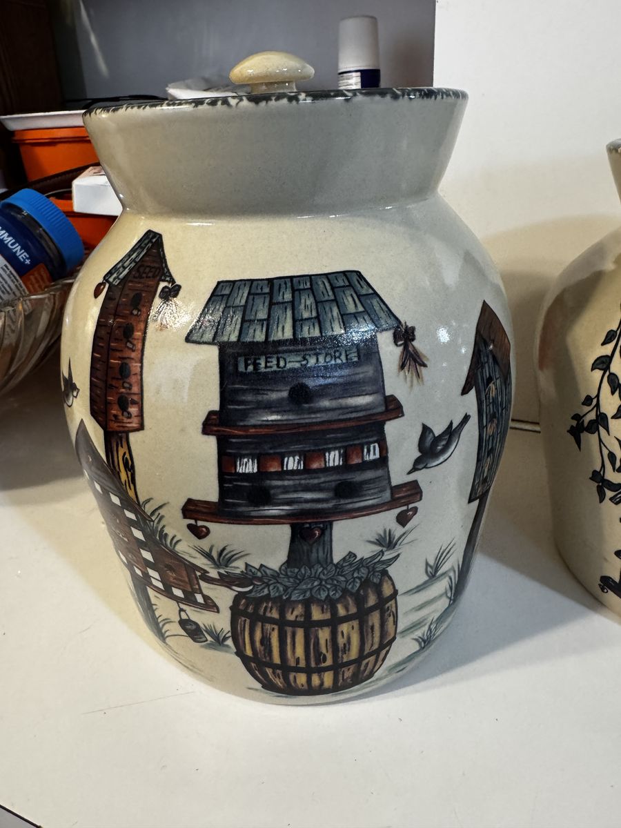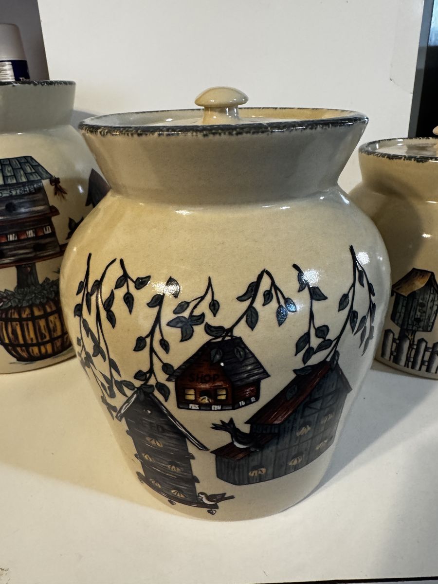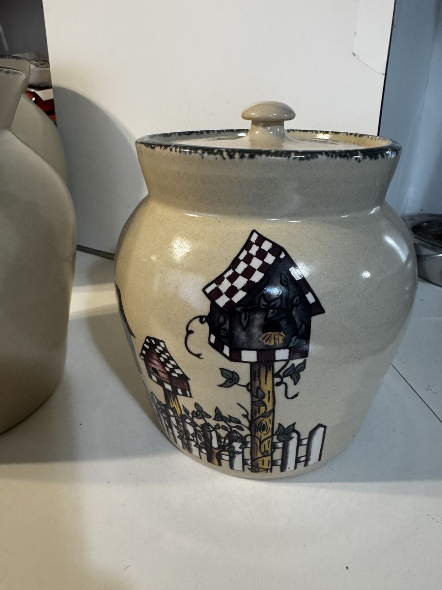 VenmoSet of 3 ceramic canisters decorated with bird houses. No cracks or chips on any of them. All the canisters and lids are in excellent condition. they measure 9", 8" & 6.5" and are 5.5" diameter.