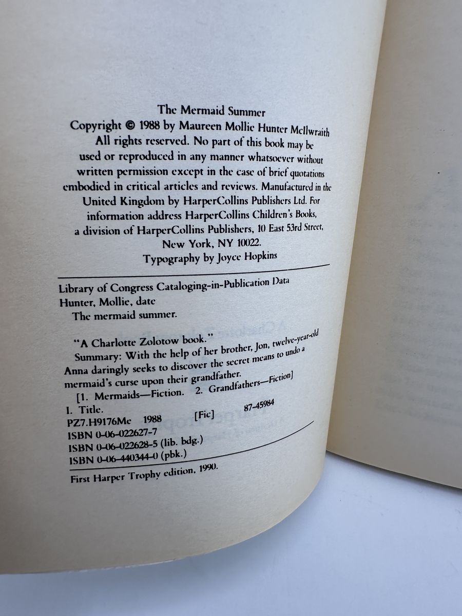 ApplePayDive into a classic children’s fantasy with The Mermaid Summer by Mollie Hunter. This enchanting tale follows siblings Jon and Anna as they uncover the mystery of a powerful sea mermaid and attempt to save their grandfather. A beloved Harper Trophy edition, this vintage paperback blends folklore, adventure, and magic—perfect for collectors of classic children’s literature or fans of mermaid stories.