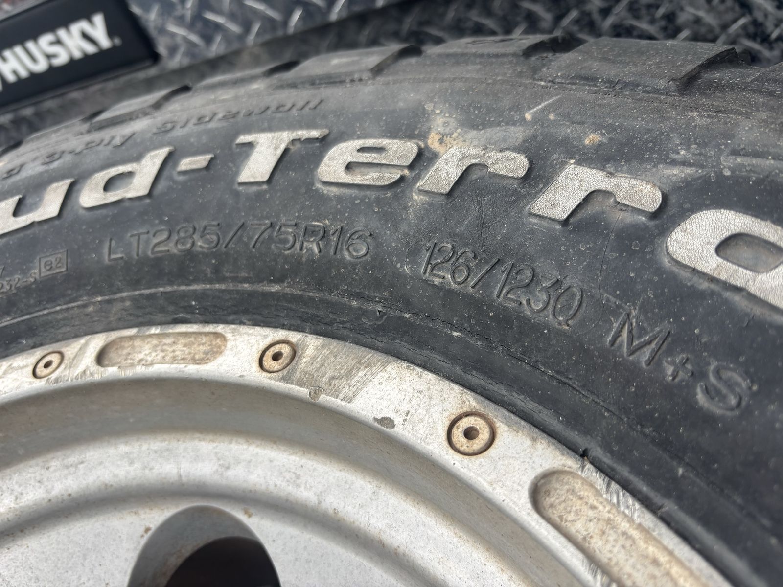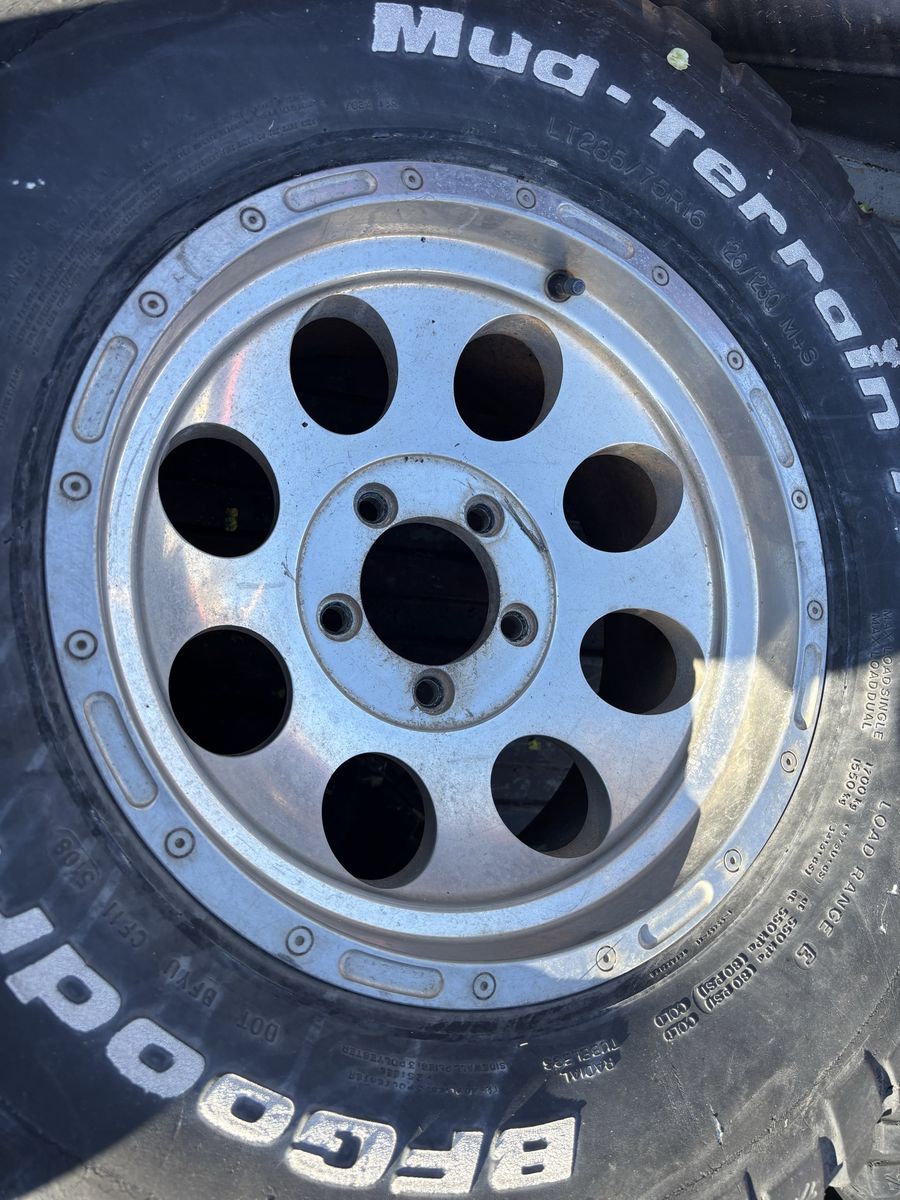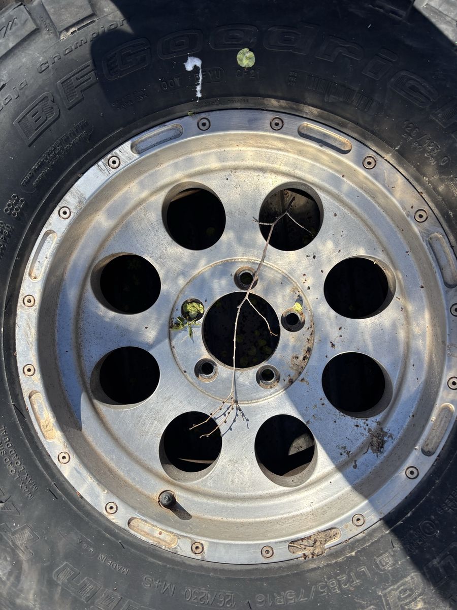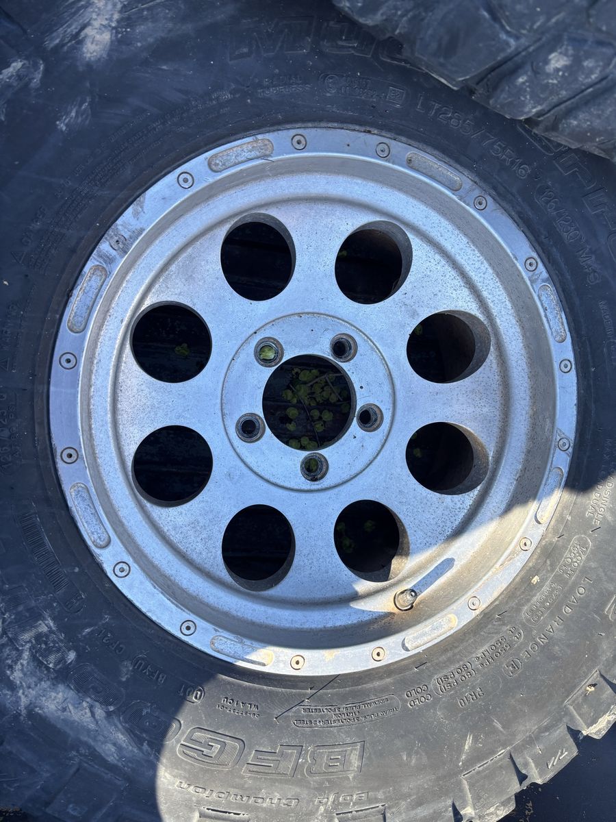 Came with my Chevy truck 285-75-16 tires are in rough condition but hold air. Wheels see in each picture