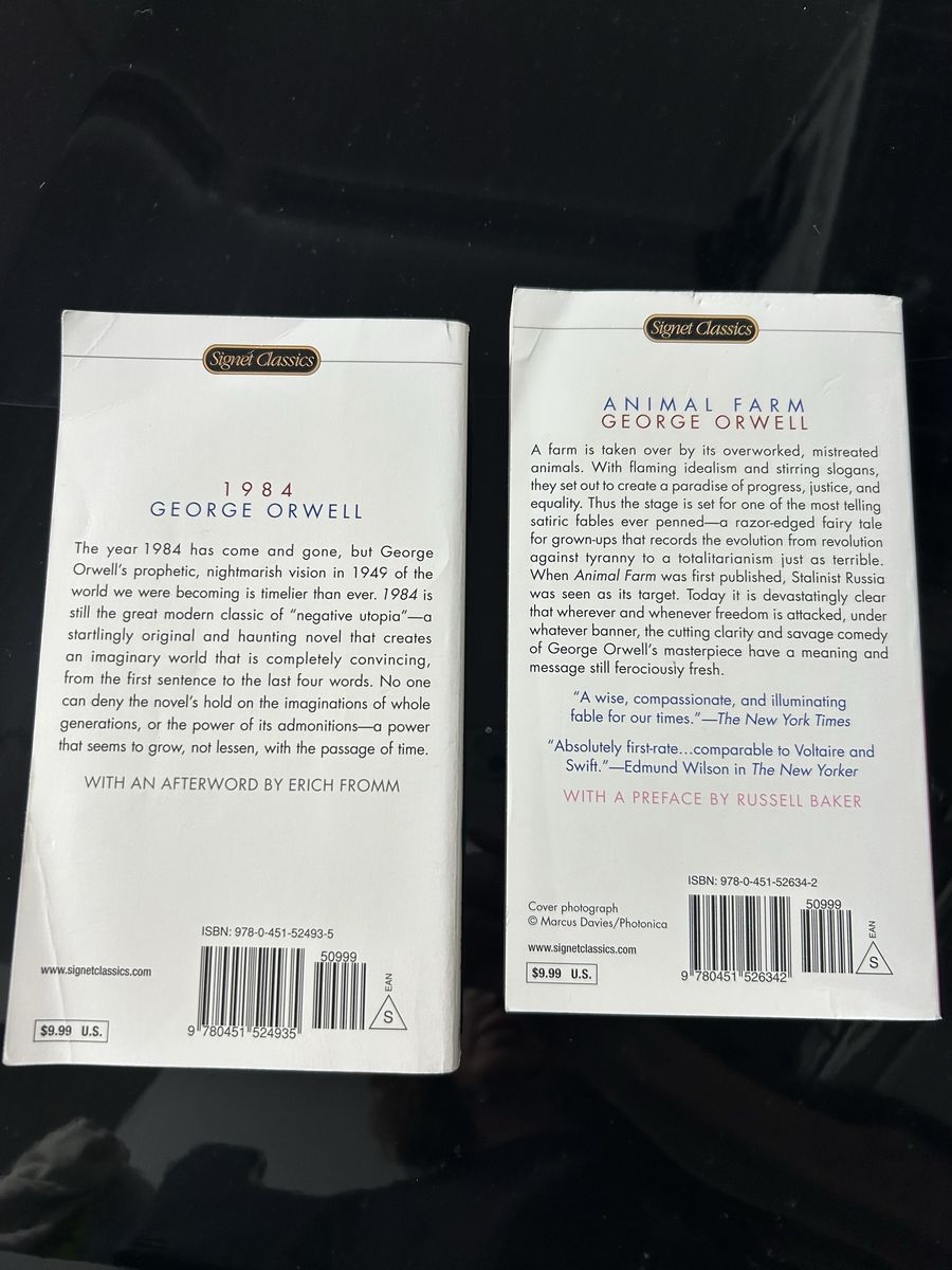 VenmoSet of two Animal Farm and 1984 by George Orwell. Must reads by everyone. Paperback. Clean smoke free. Cash or Venmo. Both for $5. Located in and picked up from Alpine.