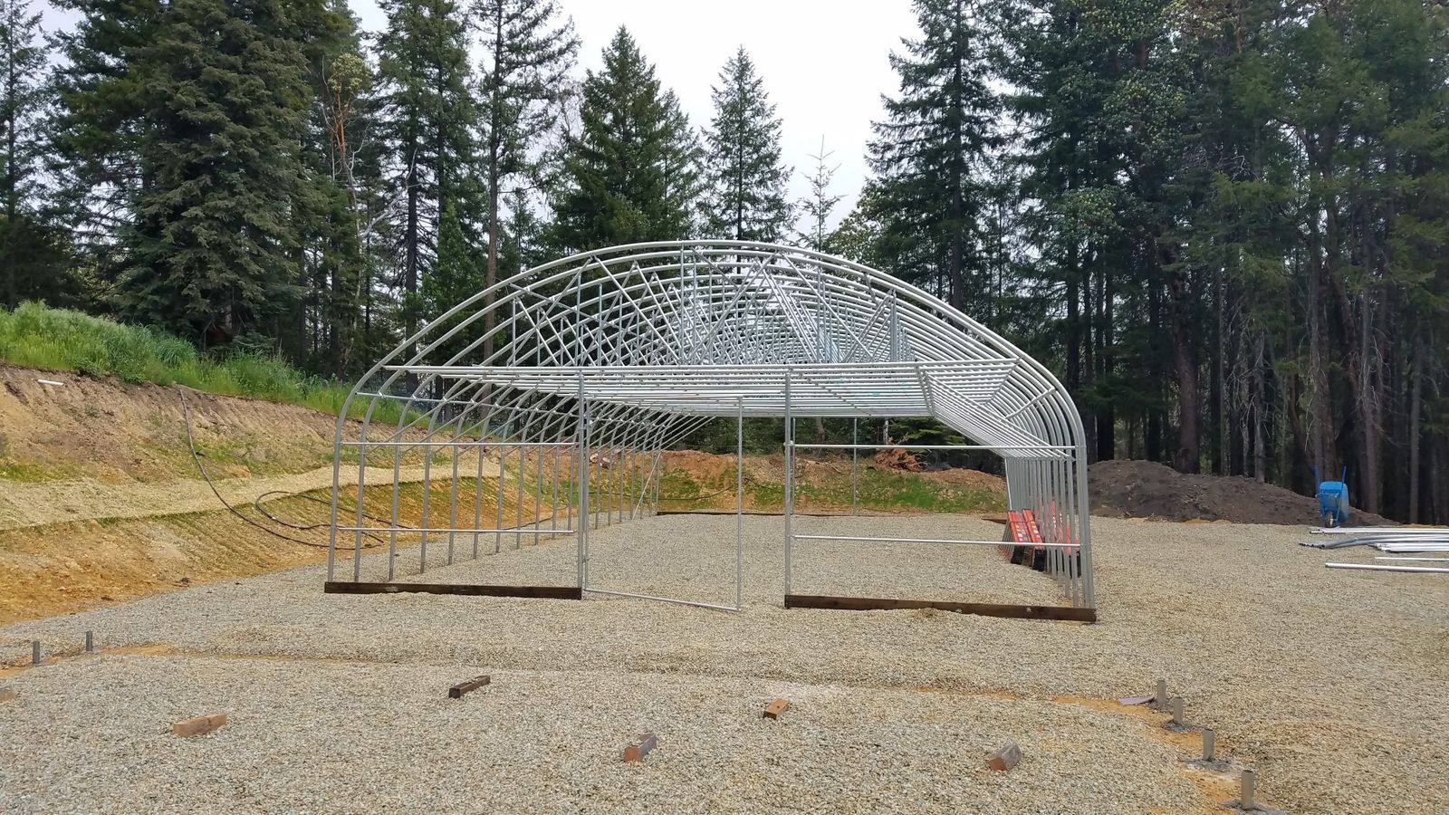 2.375” x 13 gauge steel frame for hoops, end wall frames one with 8’x8’ tractor door purlins,channel and wiggle wire, ground sleeves, roll up sides, 10mil string reinfoced greenhouse plastic.
