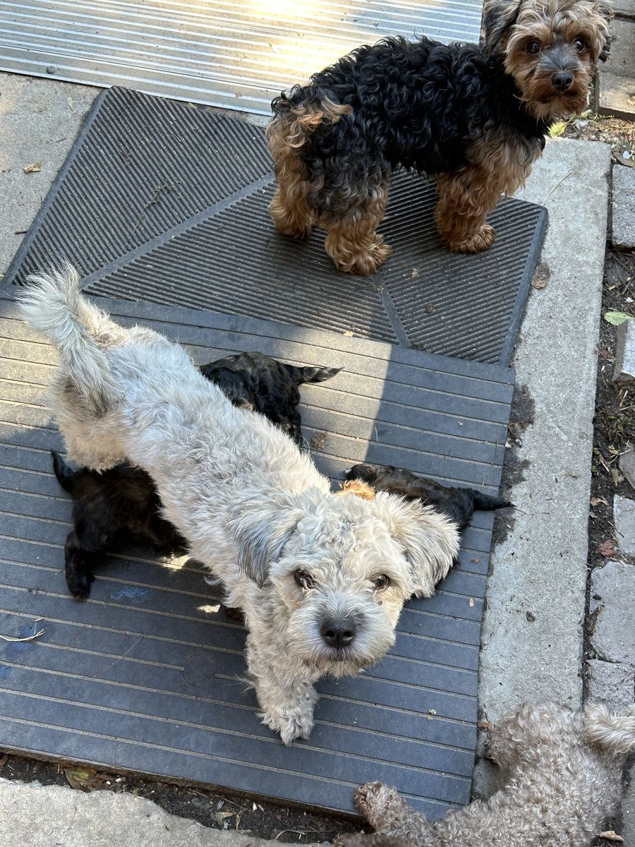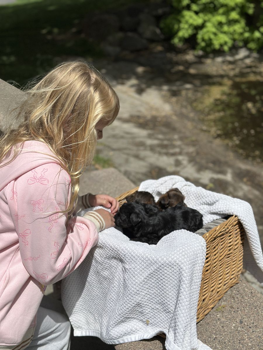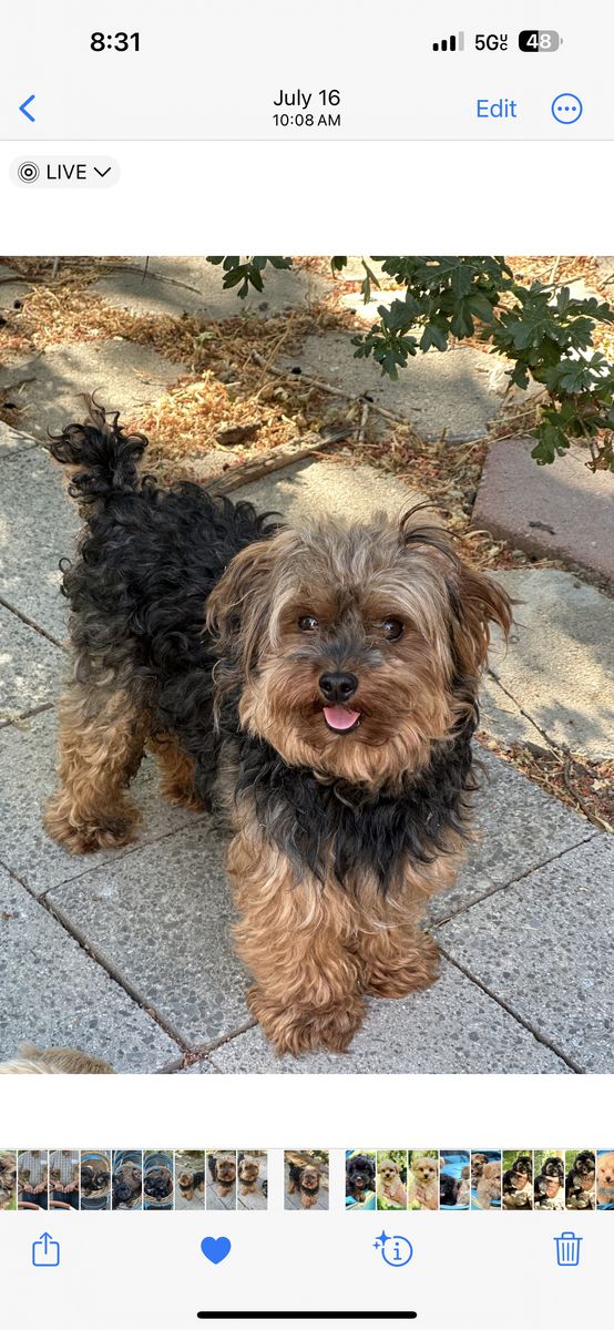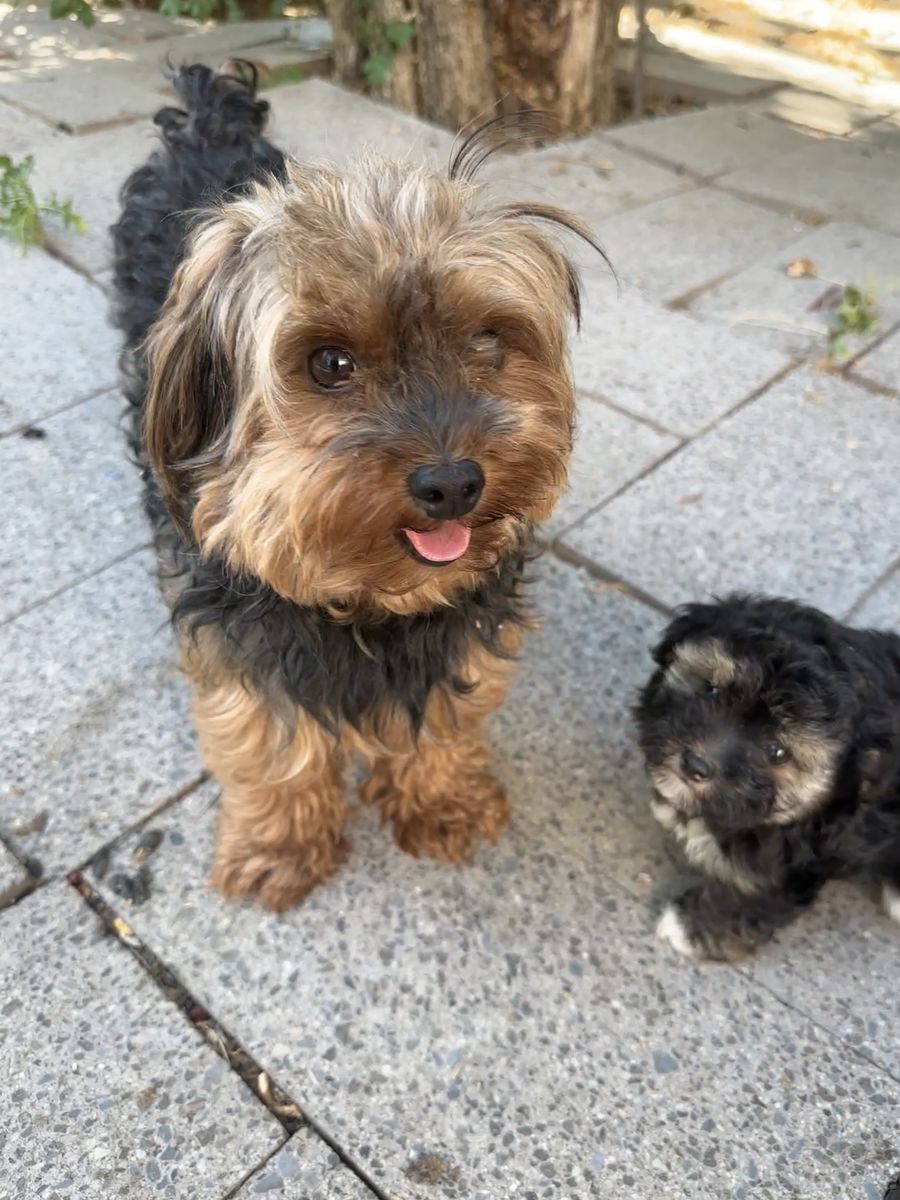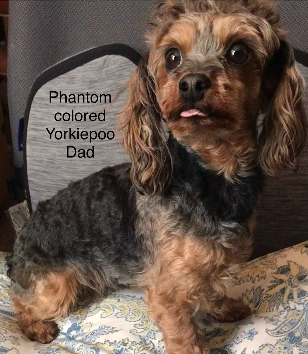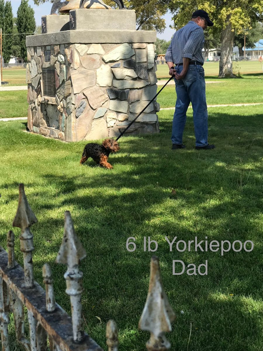 Dad is a 7lb red and black Yorkiepoo. He is a happy little boy with his cute pink tongue hanging out. Mom is a 12lb grey merle YorkieShihPoo. She loves to play with balls. Parent pictures at end of roll.