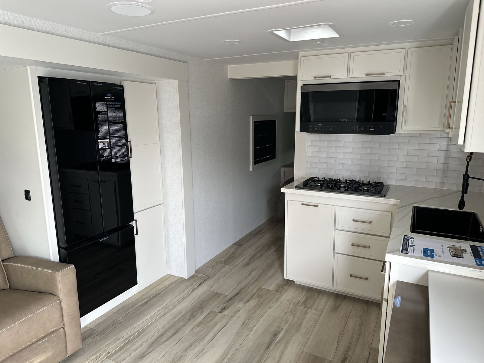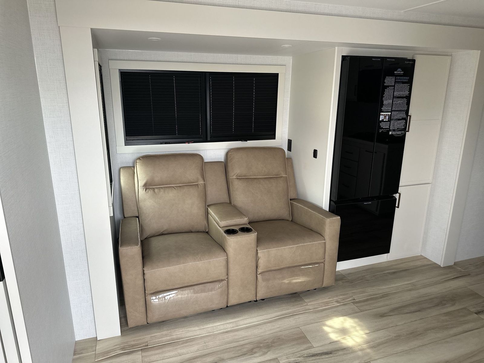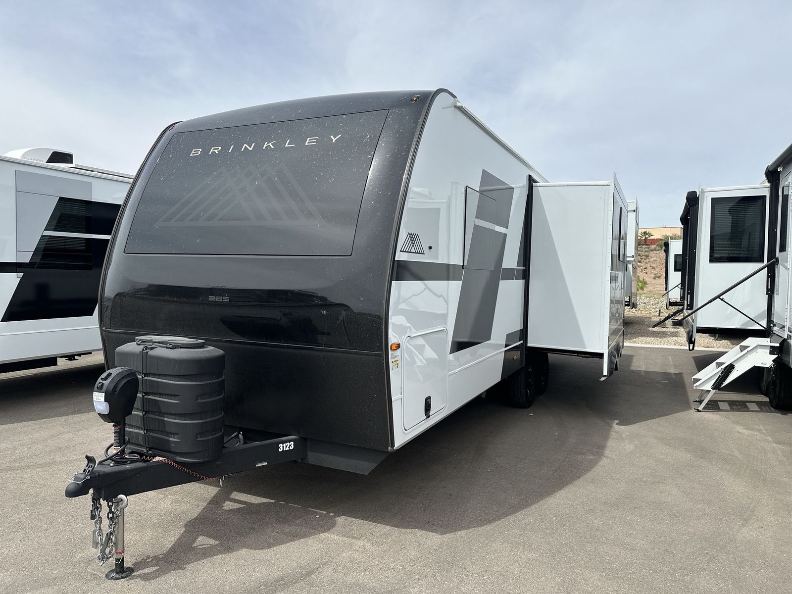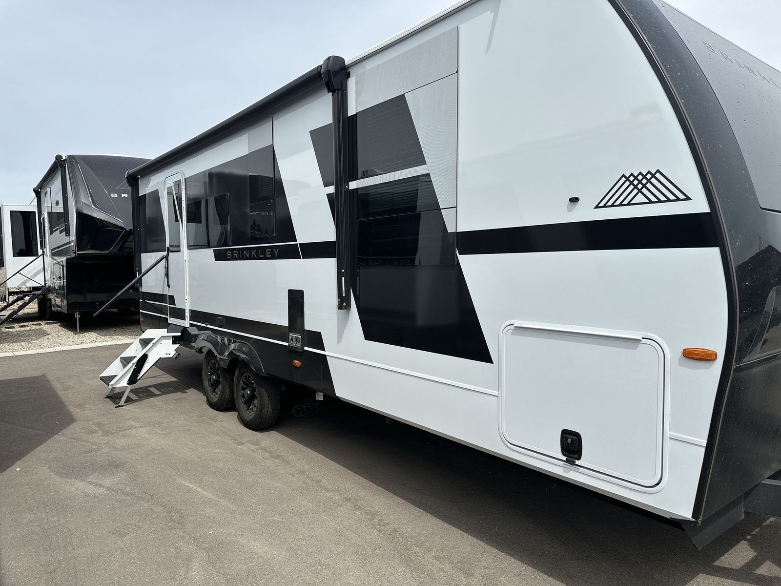 Brinkley Model I travel trailer 265 highlights: Theater Seating Slide Pull-Out Dining Table King Bed LED Chassis Lighting Drop-Frame Pass-Thru Storage One look at this travel trailer and you'll be sold! The full rear bath features a spacious 42" x 30" shower with a built-in seat and Maxxair fan to name a few comforts. The front private bedroom features a 66" x 80" king bed with a MaxSpace Split-Level Wardrobe underneath to store shoes, clothes, and more! A slide out in the combined living area and kitchen makes your space more open, and you'll enjoy relaxing on the theater seating here in the evenings. The full kitchen includes a three burner stovetop, residential 30" convection microwave, 12 cu. ft. 12V refrigerator, plus a trash bin and Stow N' Go paper towel holder for added convenience. You can choose to eat outdoors under the 18' electric awning with LED lights or stay inside to dine at the pull-out dining table with a drawer for added storage! And if you're needing more sleeping space, just choose the optional tri-fold sofa in place of the theater seating! The lightweight Model I travel trailer by Brinkley is the perfect choice for those looking for an easy tow and at-home comforts! There is a drop-frame chassis, high-performance Road Armor suspension equalizer system, and Demco EZ Latch trailer coupler that automatically latches when dropped onto a hitch ball without the need of a safety pin. Additional exterior features include square Euro frameless windows, automotive-grade paint, full-width LED strip lighting in the pass-thru, and a pet & property security campside tie-down to keep your gear and furry friends safe. Inside, you'll be wowed by Brinkley's CraftSense wood trim construction, residential solid surface kitchen countertops, dimmable bedroom lights, and marine-grade neon LED shower lighting to name a few stand-out features!