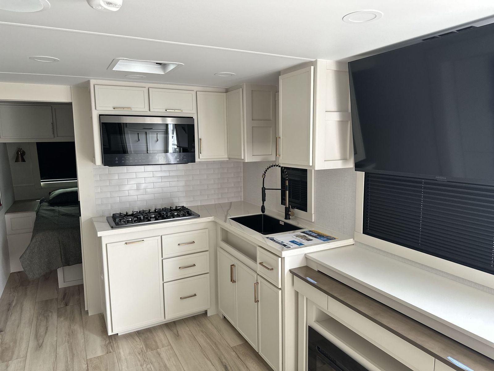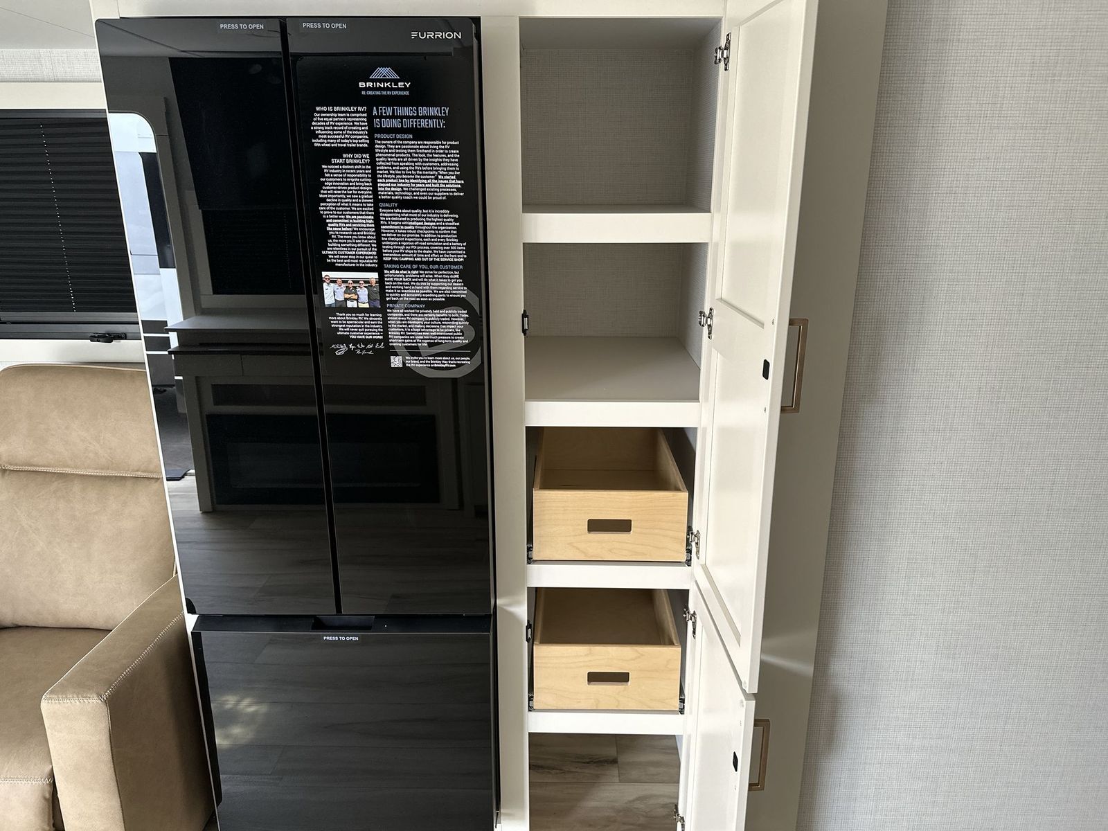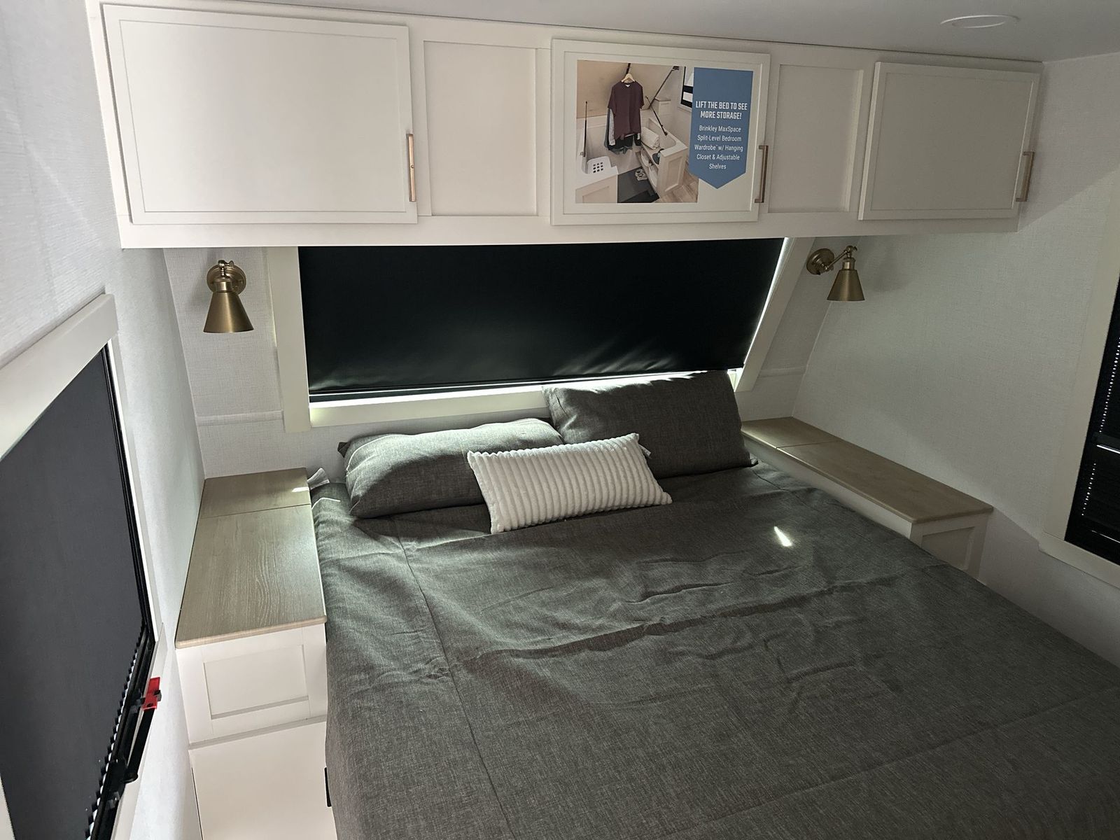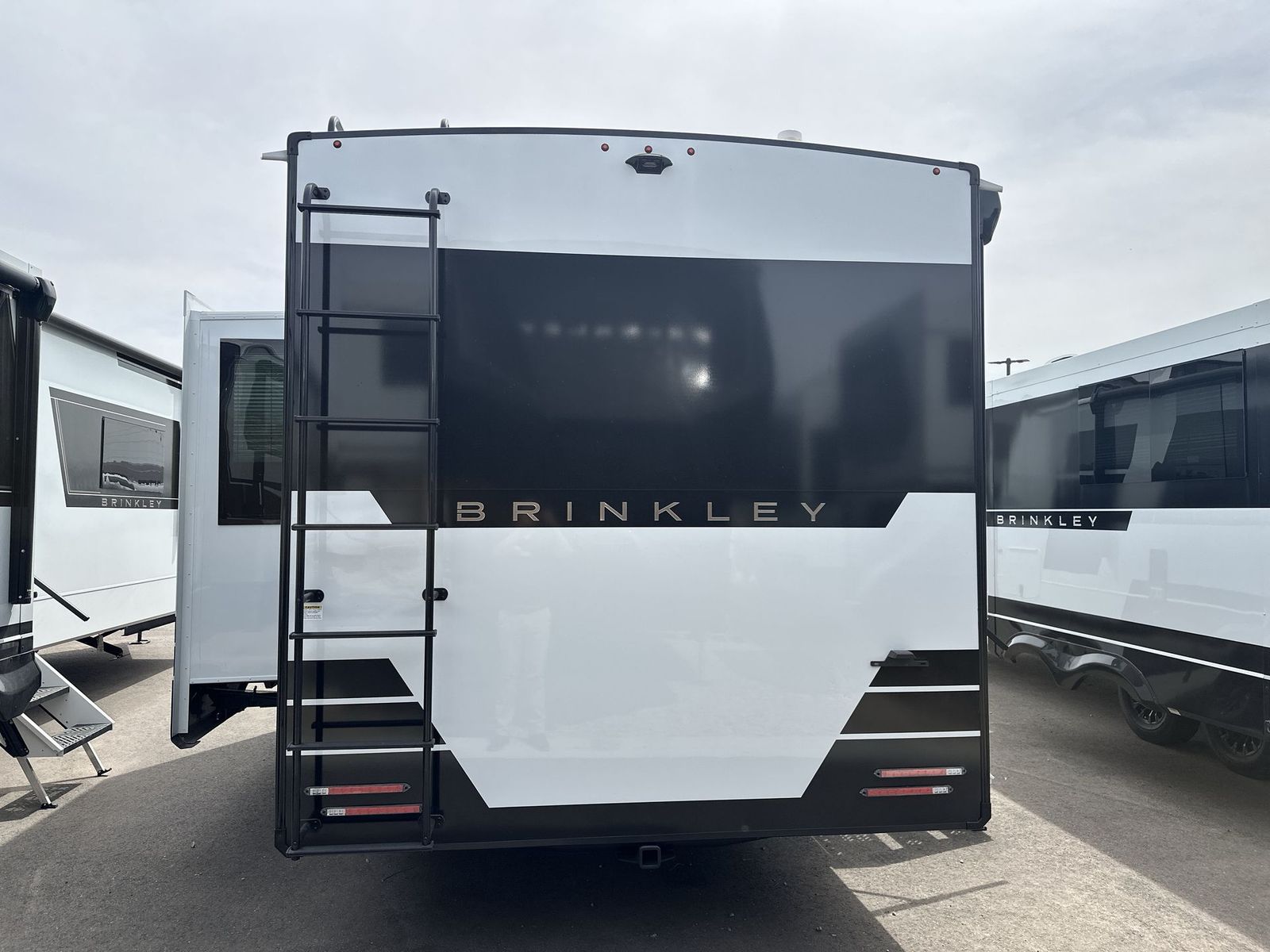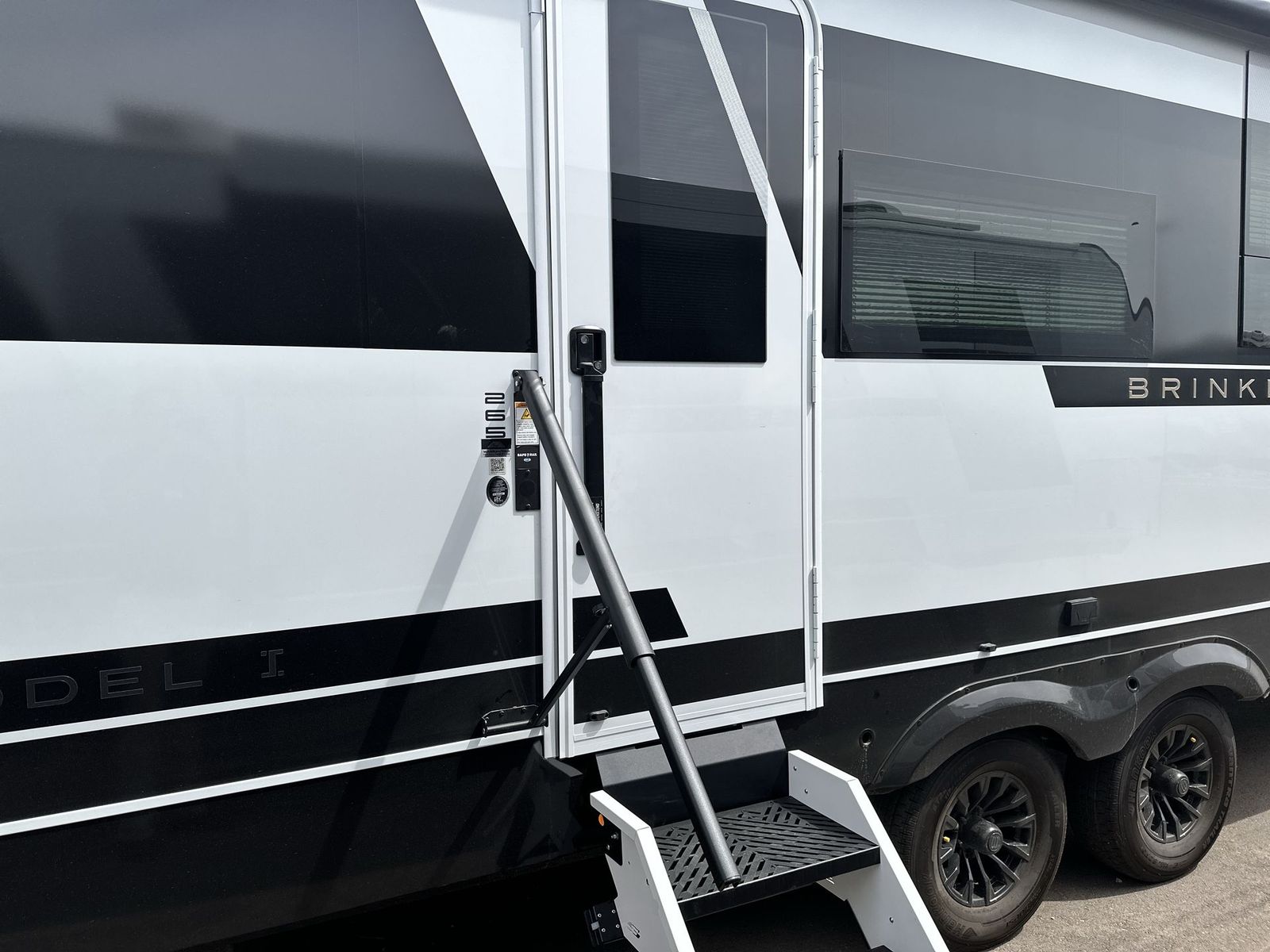 Brinkley Model I travel trailer 265 highlights: Theater Seating Slide Pull-Out Dining Table King Bed LED Chassis Lighting Drop-Frame Pass-Thru Storage One look at this travel trailer and you'll be sold! The full rear bath features a spacious 42" x 30" shower with a built-in seat and Maxxair fan to name a few comforts. The front private bedroom features a 66" x 80" king bed with a MaxSpace Split-Level Wardrobe underneath to store shoes, clothes, and more! A slide out in the combined living area and kitchen makes your space more open, and you'll enjoy relaxing on the theater seating here in the evenings. The full kitchen includes a three burner stovetop, residential 30" convection microwave, 12 cu. ft. 12V refrigerator, plus a trash bin and Stow N' Go paper towel holder for added convenience. You can choose to eat outdoors under the 18' electric awning with LED lights or stay inside to dine at the pull-out dining table with a drawer for added storage! And if you're needing more sleeping space, just choose the optional tri-fold sofa in place of the theater seating! The lightweight Model I travel trailer by Brinkley is the perfect choice for those looking for an easy tow and at-home comforts! There is a drop-frame chassis, high-performance Road Armor suspension equalizer system, and Demco EZ Latch trailer coupler that automatically latches when dropped onto a hitch ball without the need of a safety pin. Additional exterior features include square Euro frameless windows, automotive-grade paint, full-width LED strip lighting in the pass-thru, and a pet & property security campside tie-down to keep your gear and furry friends safe. Inside, you'll be wowed by Brinkley's CraftSense wood trim construction, residential solid surface kitchen countertops, dimmable bedroom lights, and marine-grade neon LED shower lighting to name a few stand-out features!
