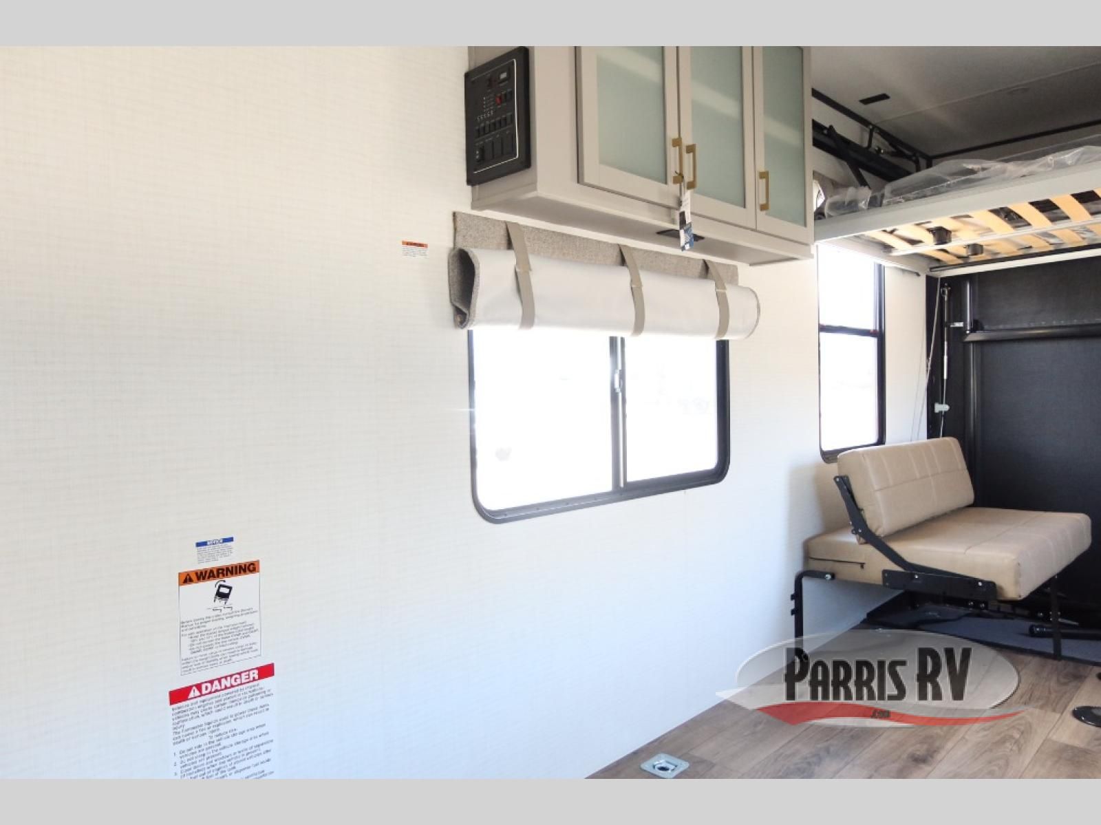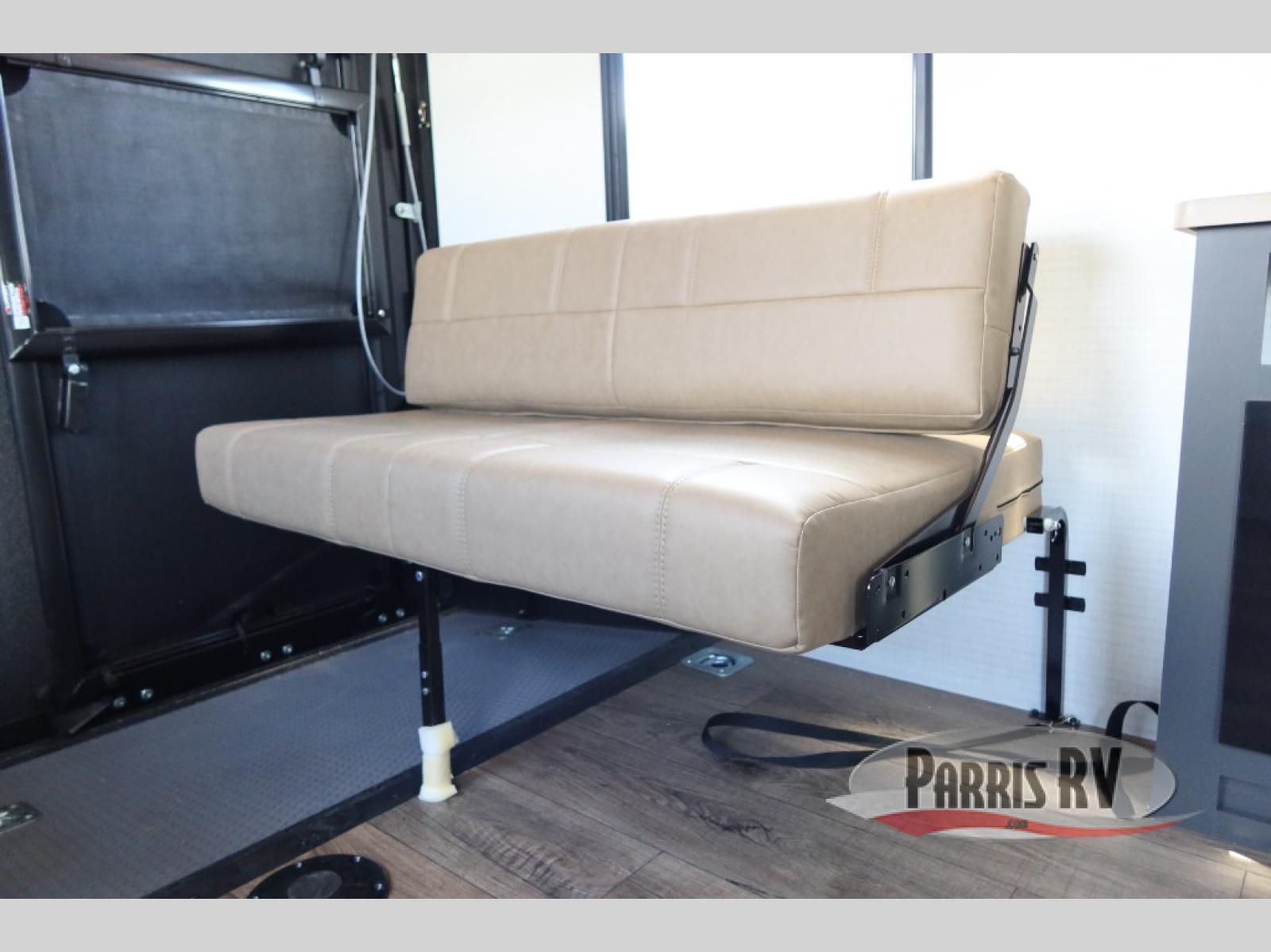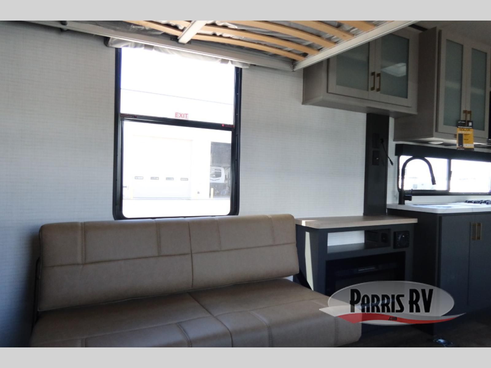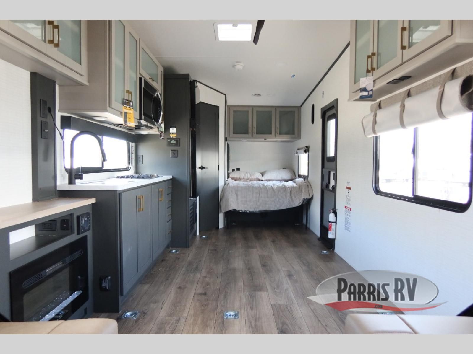 Designed to give you the flexibility to haul your gear while still enjoying the comforts of home. The front corner bedroom features a versatile Murphy bed, allowing you to easily transition from a comfortable sleeping space to a functional living area during the day. In the back, the entertainment center provides a convenient place for a TV and media components, making it easy to relax after a long day of adventure. The trailer also includes a practical galley kitchen equipped with a microwave, overhead cabinetry, and a 10 cu. ft. refrigerator, giving you everything you need to prepare meals while on the road. In the rear cargo area, the open layout allows you to bring along your favorite toys, while the outside storage compartments provide additional space to keep camping gear, tools, and travel essentials organized and easily accessible.