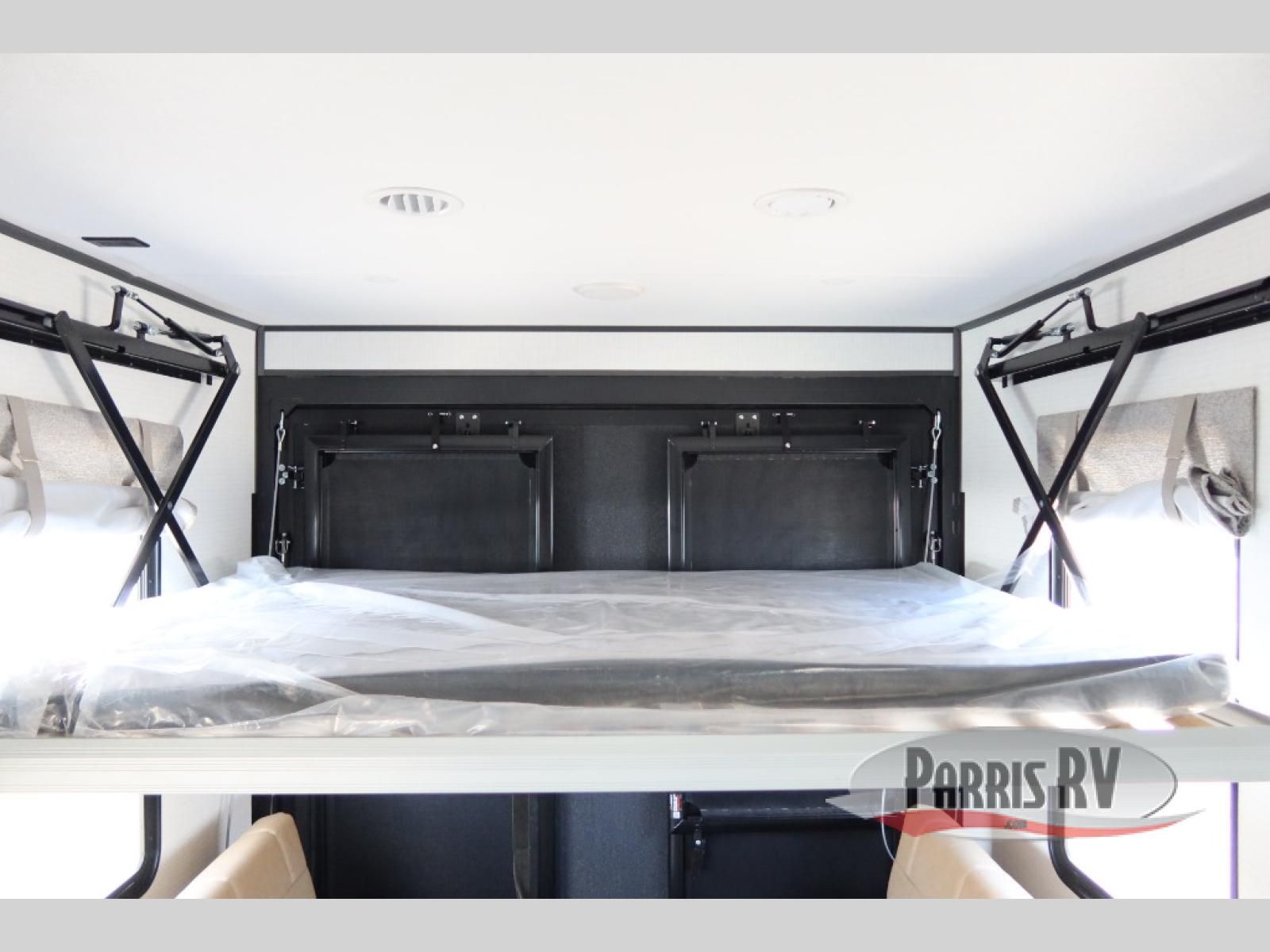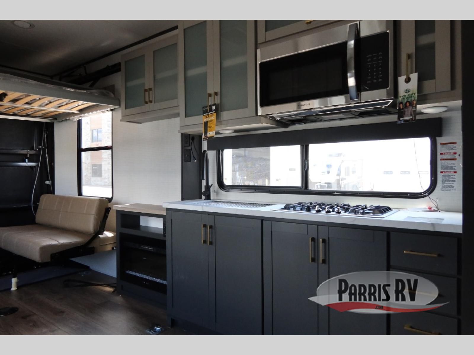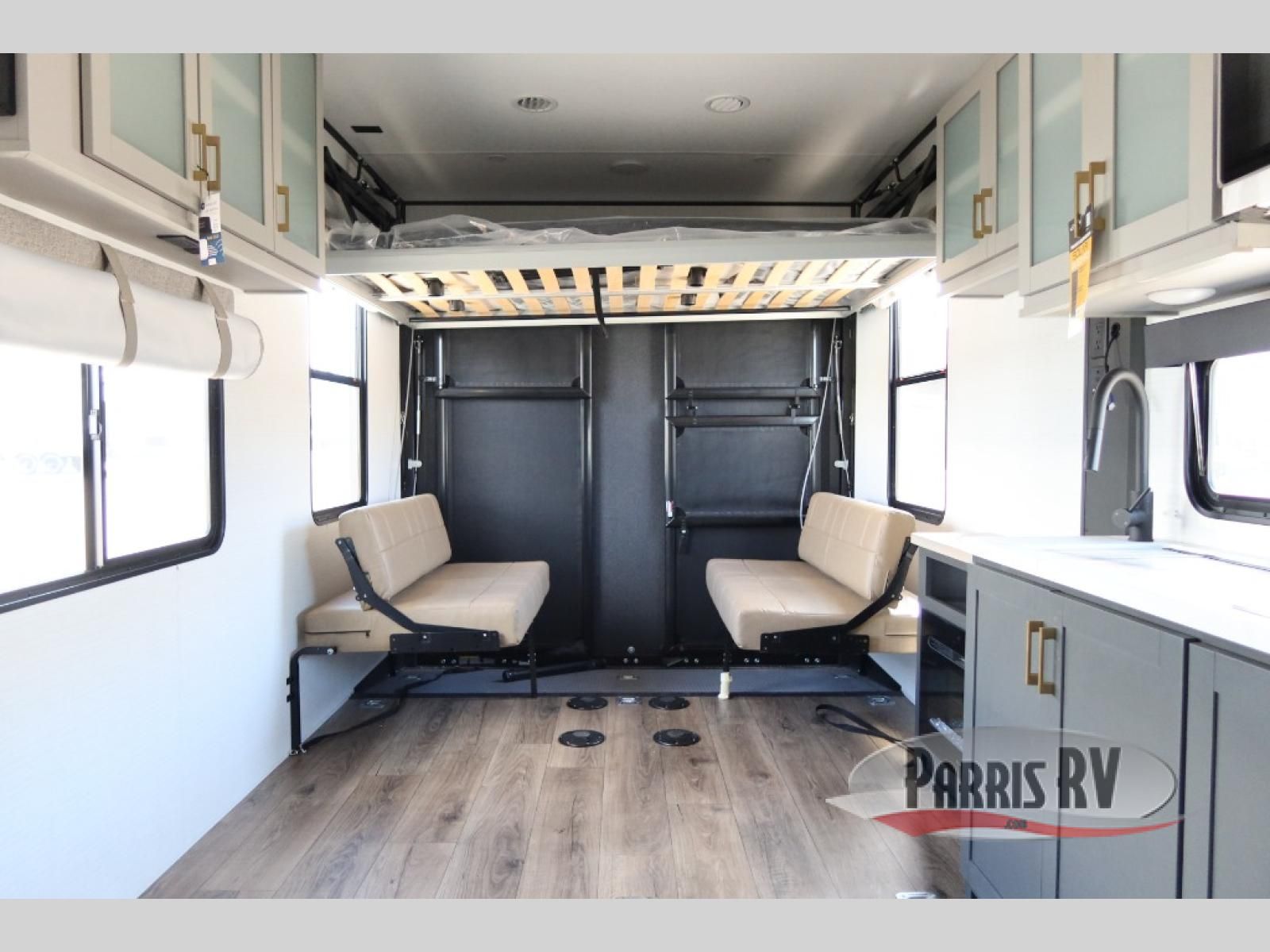 Designed to give you the flexibility to haul your gear while still enjoying the comforts of home. The front corner bedroom features a versatile Murphy bed, allowing you to easily transition from a comfortable sleeping space to a functional living area during the day. In the back, the entertainment center provides a convenient place for a TV and media components, making it easy to relax after a long day of adventure. The trailer also includes a practical galley kitchen equipped with a microwave, overhead cabinetry, and a 10 cu. ft. refrigerator, giving you everything you need to prepare meals while on the road. In the rear cargo area, the open layout allows you to bring along your favorite toys, while the outside storage compartments provide additional space to keep camping gear, tools, and travel essentials organized and easily accessible.