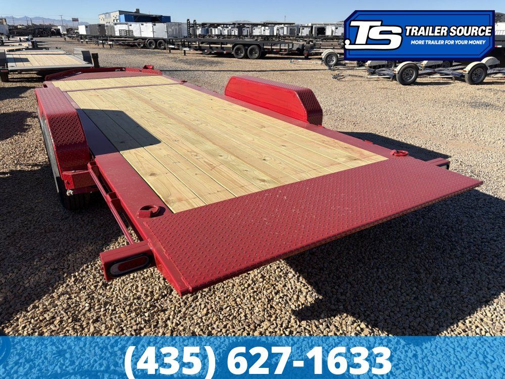 The trailer features a gravity tilt bed equipped with a Hydraulic Dampening Cylinder and valve control. This ensures a "silky smooth" transition when tilting the bed up or down, preventing the deck from crashing against the frame during loading and unloading.