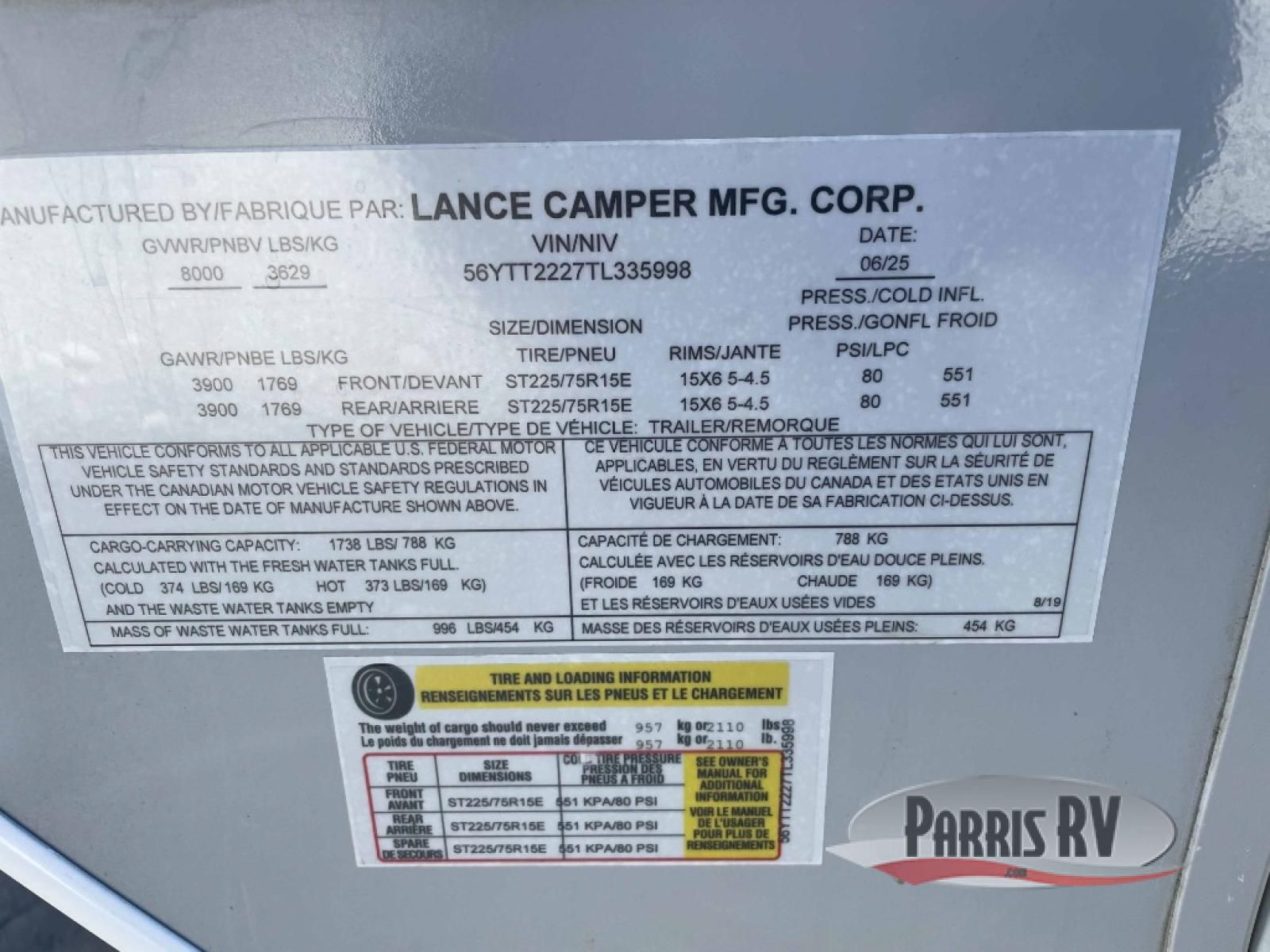 The line-up for the Lance travel trailers centers around three gorgeous interior décor options, a lengthy list of product enhancements, and simplification of ordering with many optional features being made standard. Some of the stand out features you'll want to take note of are the Keyed-Alike storage compartment doors for all of your camping essentials, the dual layer Azdel composite to prevent your unit from rotting, and the durable one-piece roof. The interior includes Euro overhead cabinetry designs, a pop-up electrical/charging tower, and a Shower Miser water system. You'll also find an innerspring mattress with a bedspread, a dual pane shower skylight, USB charging ports to keep your electronics at 100%, plus a JBL AM/FM stereo and JBL interior/exterior Bluetooth speakers to keep the party going!
