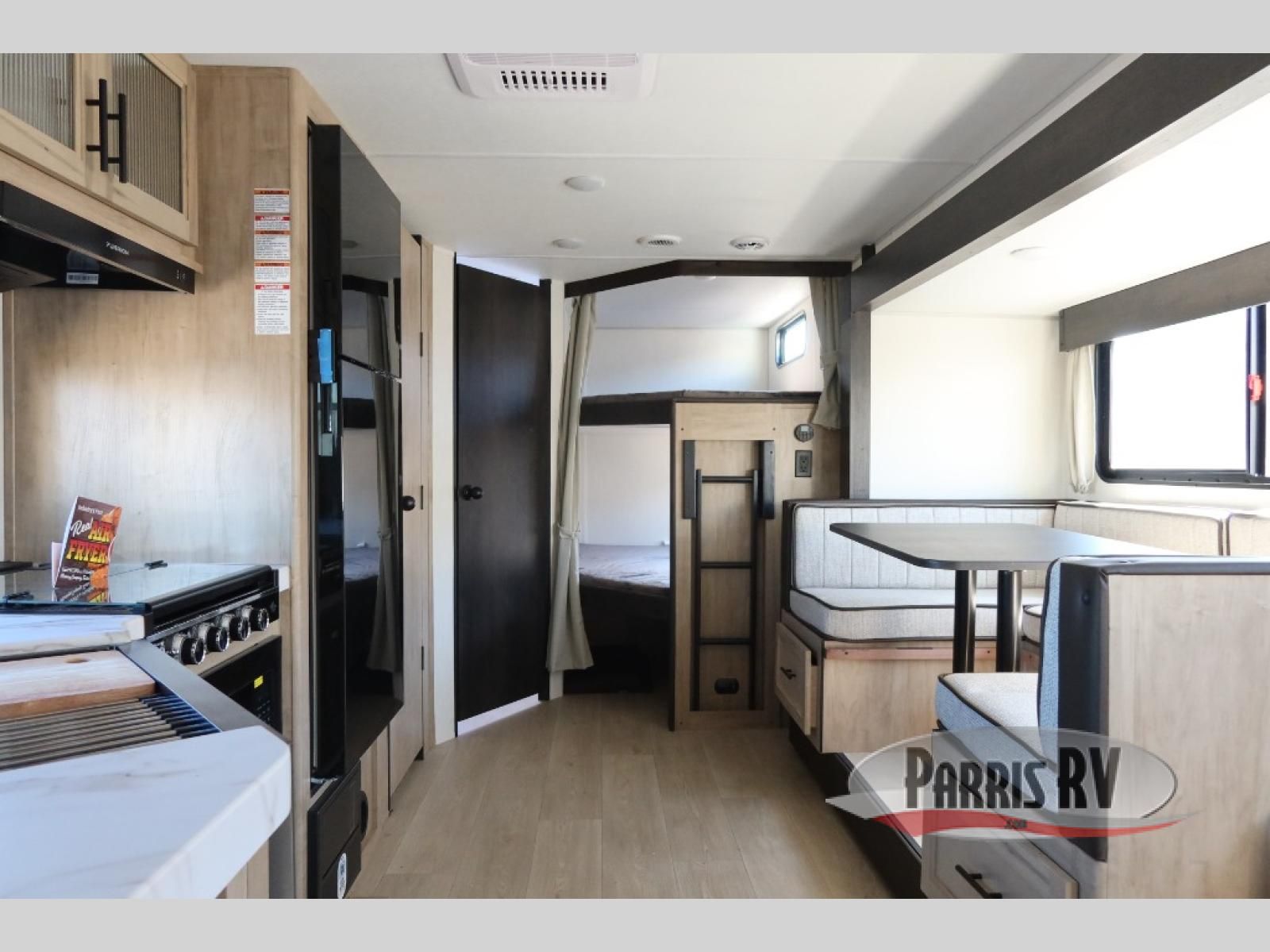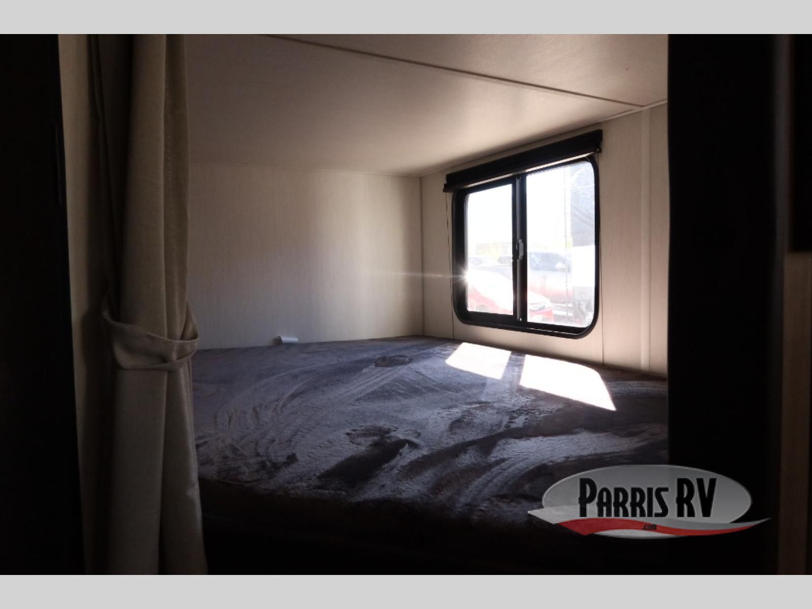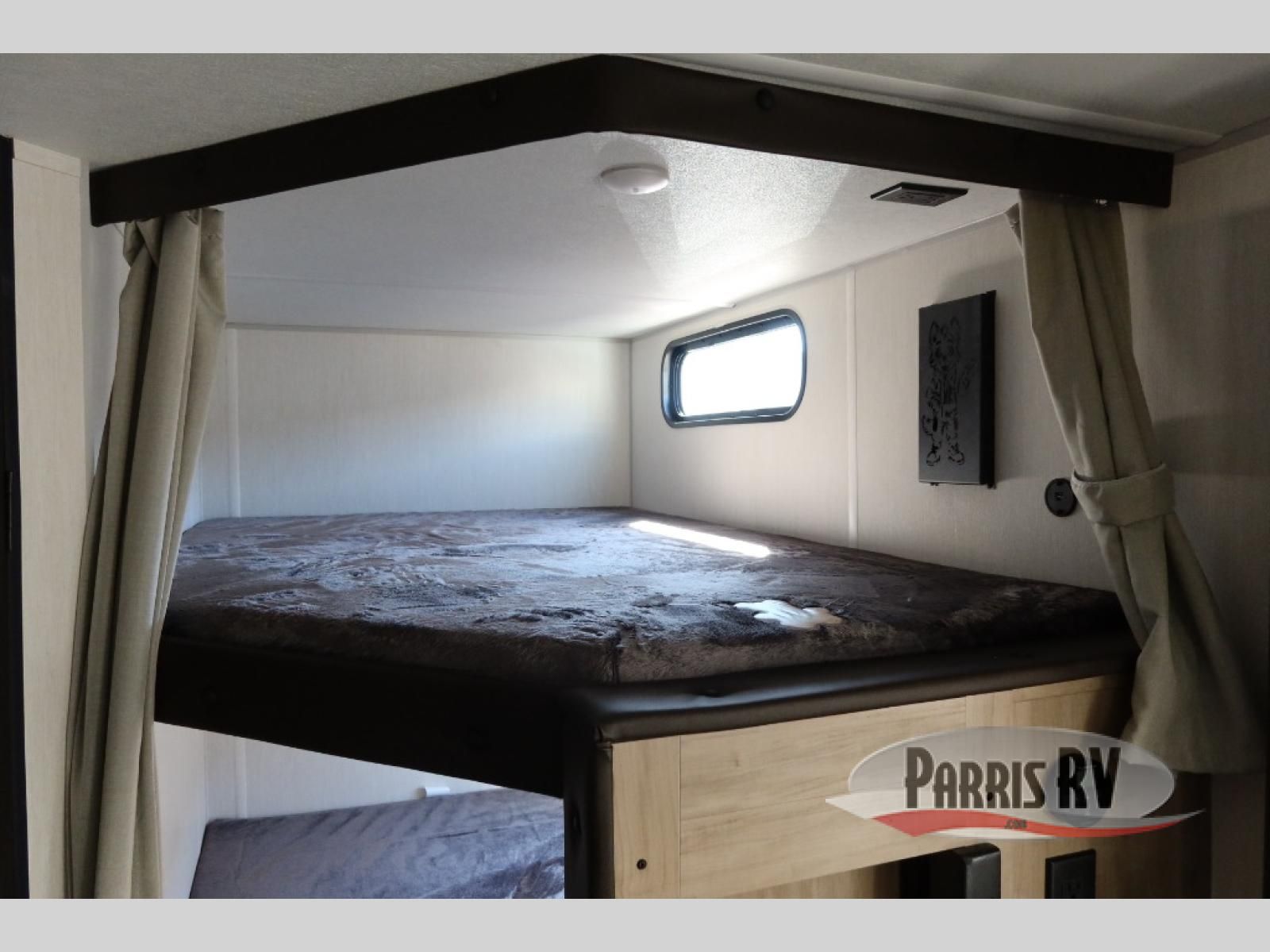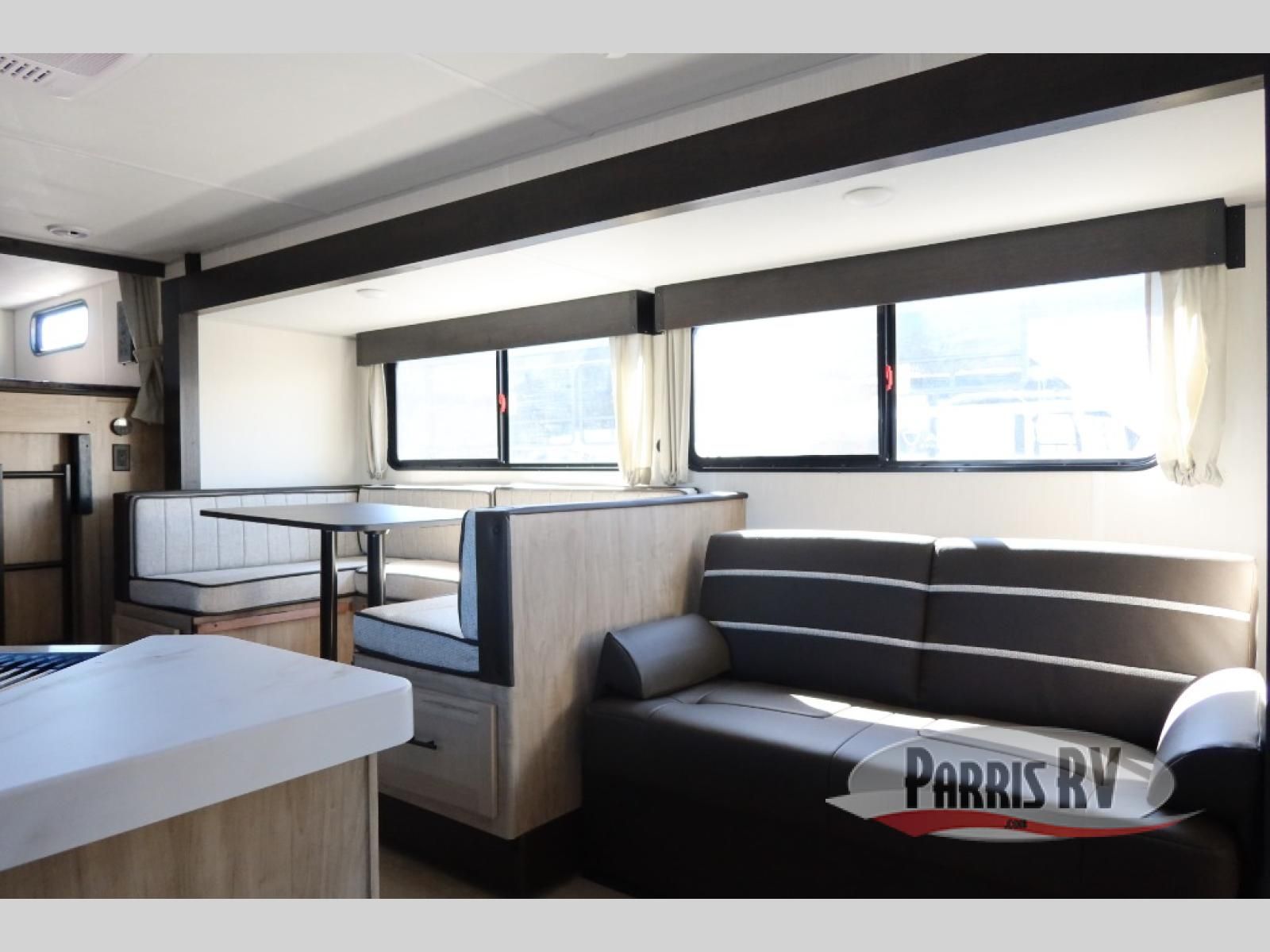 Come on inside this Cherokee Grey Wolf travel trailer and experience the convenience of a smooth flow of traffic in and out with two entry doors. The rear door leads into a full bath which is great for accessibility. Once inside, you will notice the large U-shaped dinette and the sofa which sit on the slide and create a spacious footprint for moving about, as well as great places to play games and socialize with your friends and family. A walk-in pantry provides plenty of storage allowing you to stock up on your favorite snacks and dry goods for your family adventure. At night, there is sleeping space for everyone between the double-size bunks and the RV king bed, plus the furniture.