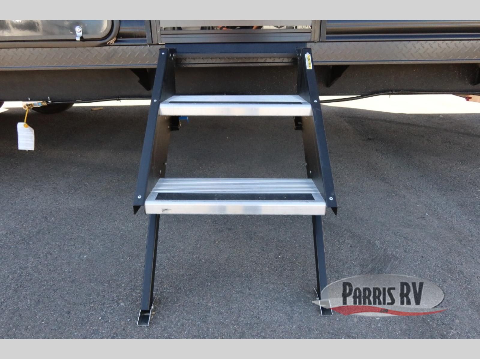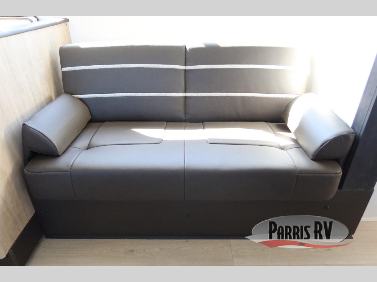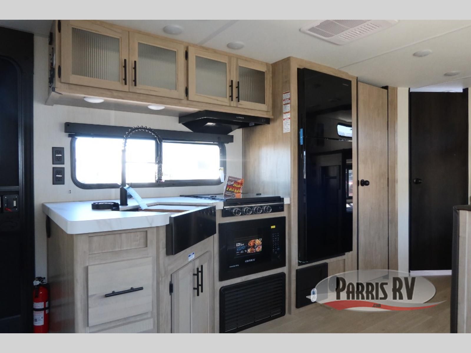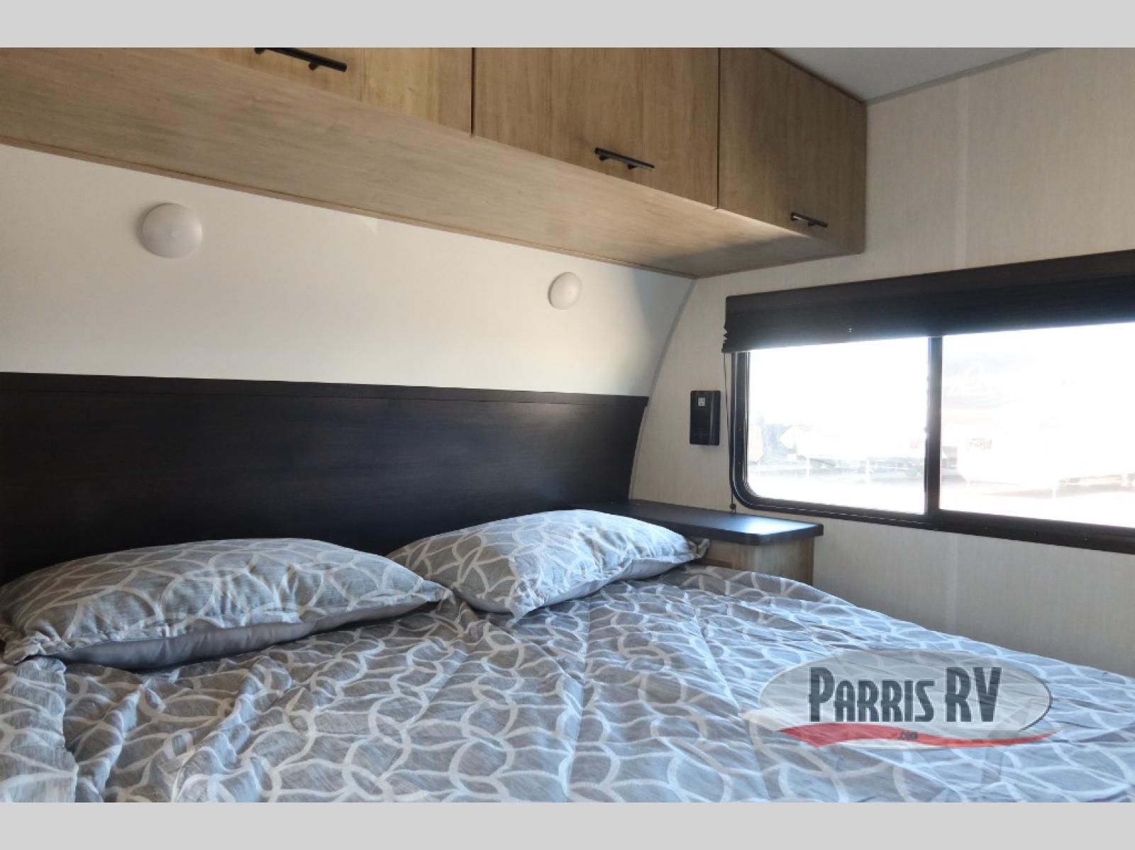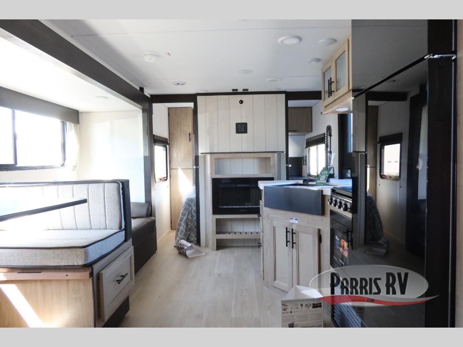 Come on inside this Cherokee Grey Wolf travel trailer and experience the convenience of a smooth flow of traffic in and out with two entry doors. The rear door leads into a full bath which is great for accessibility. Once inside, you will notice the large U-shaped dinette and the sofa which sit on the slide and create a spacious footprint for moving about, as well as great places to play games and socialize with your friends and family. A walk-in pantry provides plenty of storage allowing you to stock up on your favorite snacks and dry goods for your family adventure. At night, there is sleeping space for everyone between the double-size bunks and the RV king bed, plus the furniture.