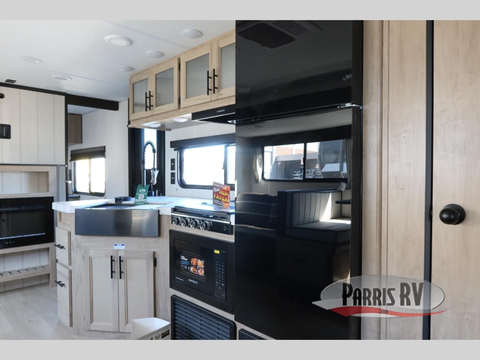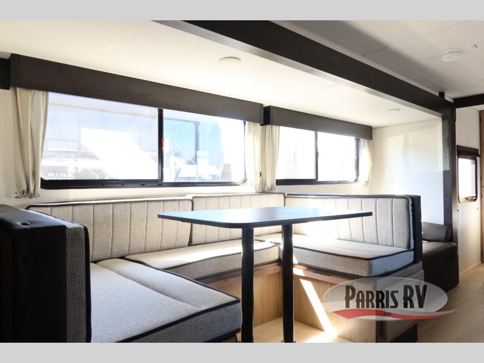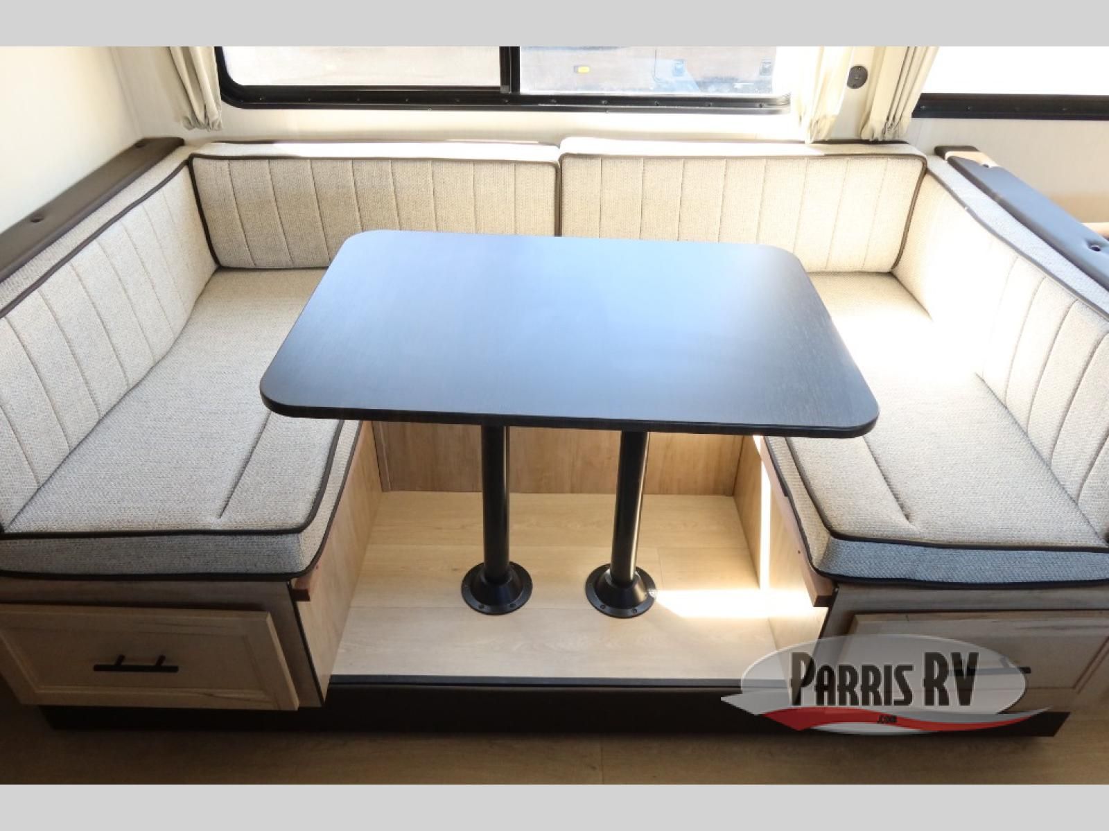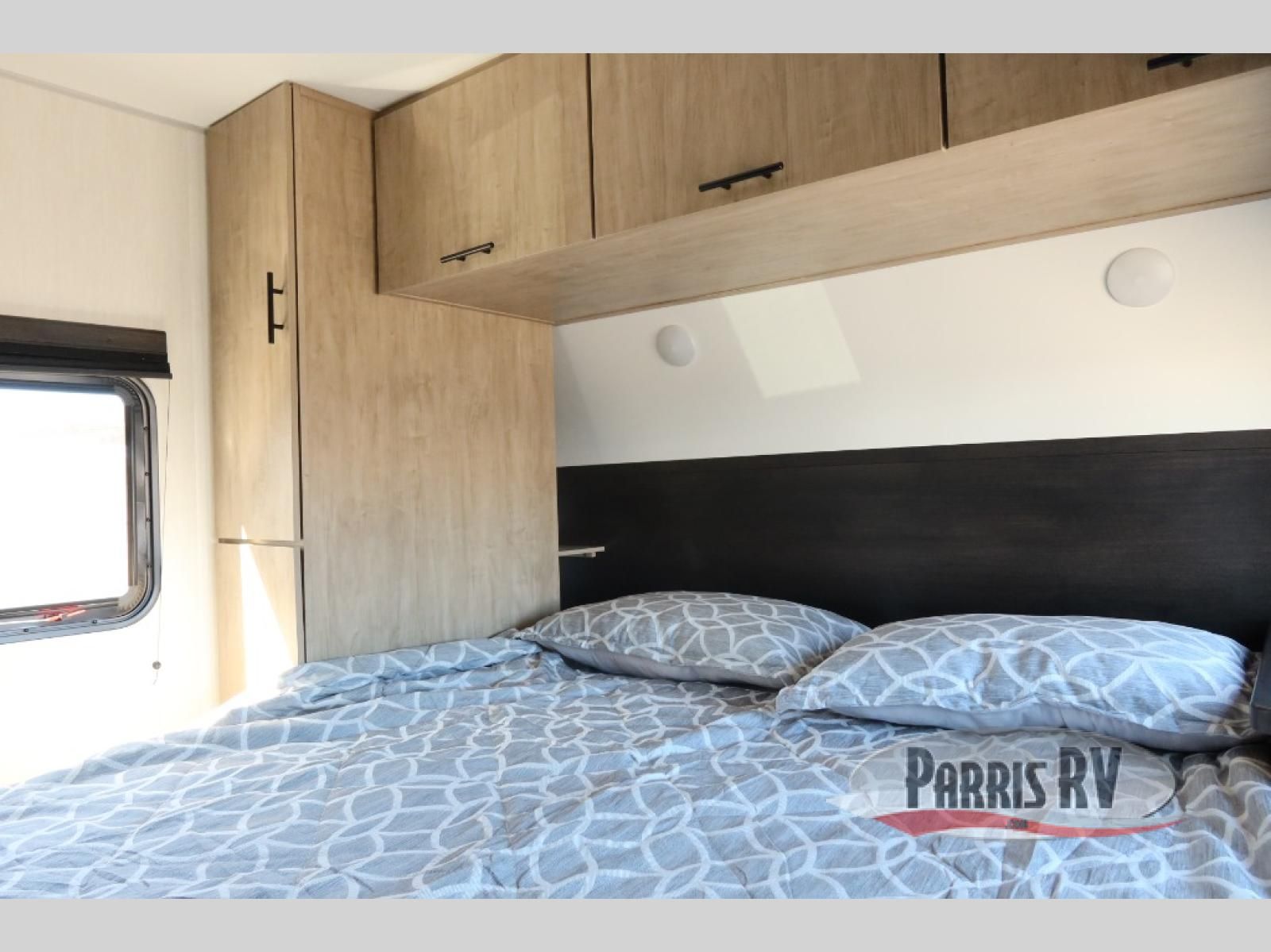 Come on inside this Cherokee Grey Wolf travel trailer and experience the convenience of a smooth flow of traffic in and out with two entry doors. The rear door leads into a full bath which is great for accessibility. Once inside, you will notice the large U-shaped dinette and the sofa which sit on the slide and create a spacious footprint for moving about, as well as great places to play games and socialize with your friends and family. A walk-in pantry provides plenty of storage allowing you to stock up on your favorite snacks and dry goods for your family adventure. At night, there is sleeping space for everyone between the double-size bunks and the RV king bed, plus the furniture.
