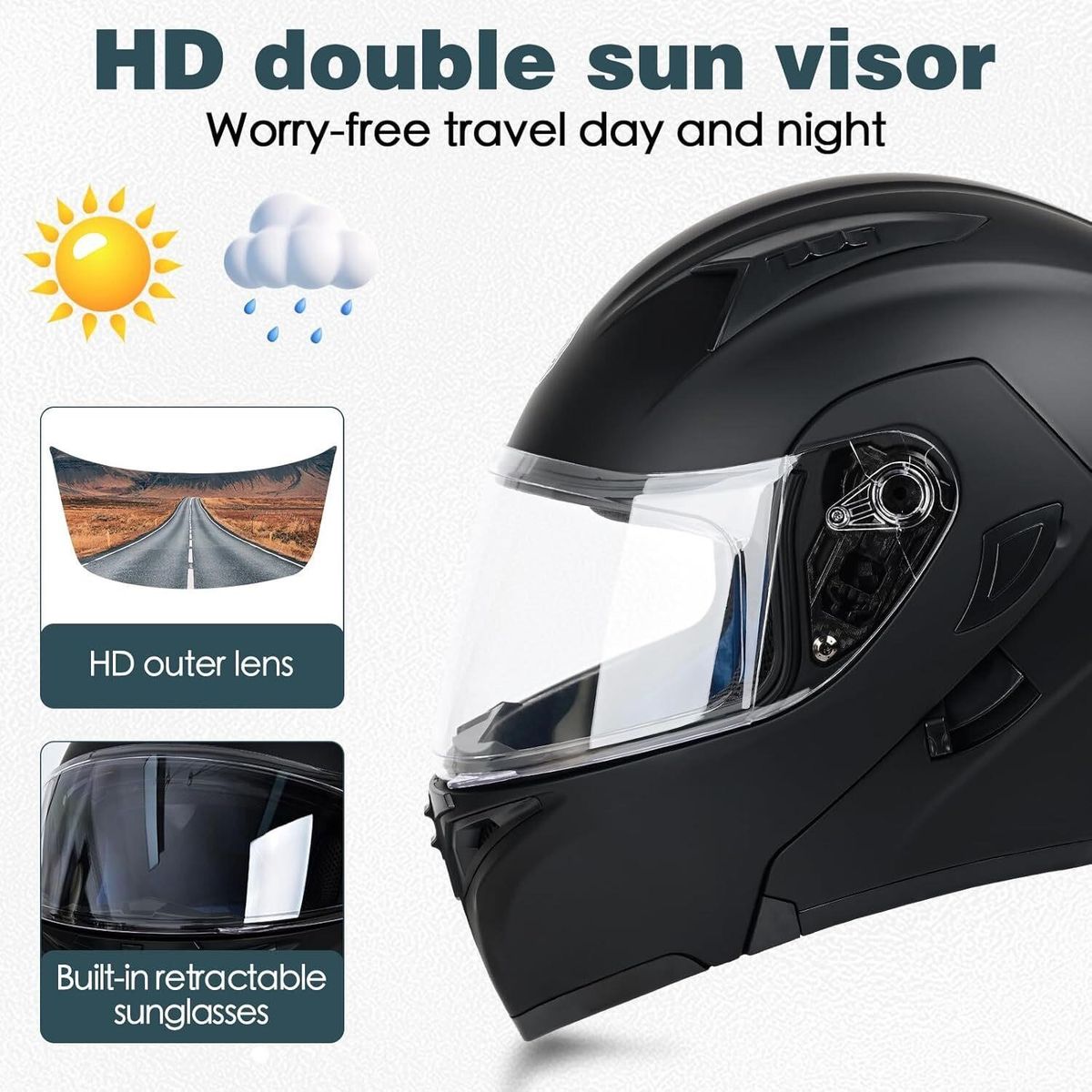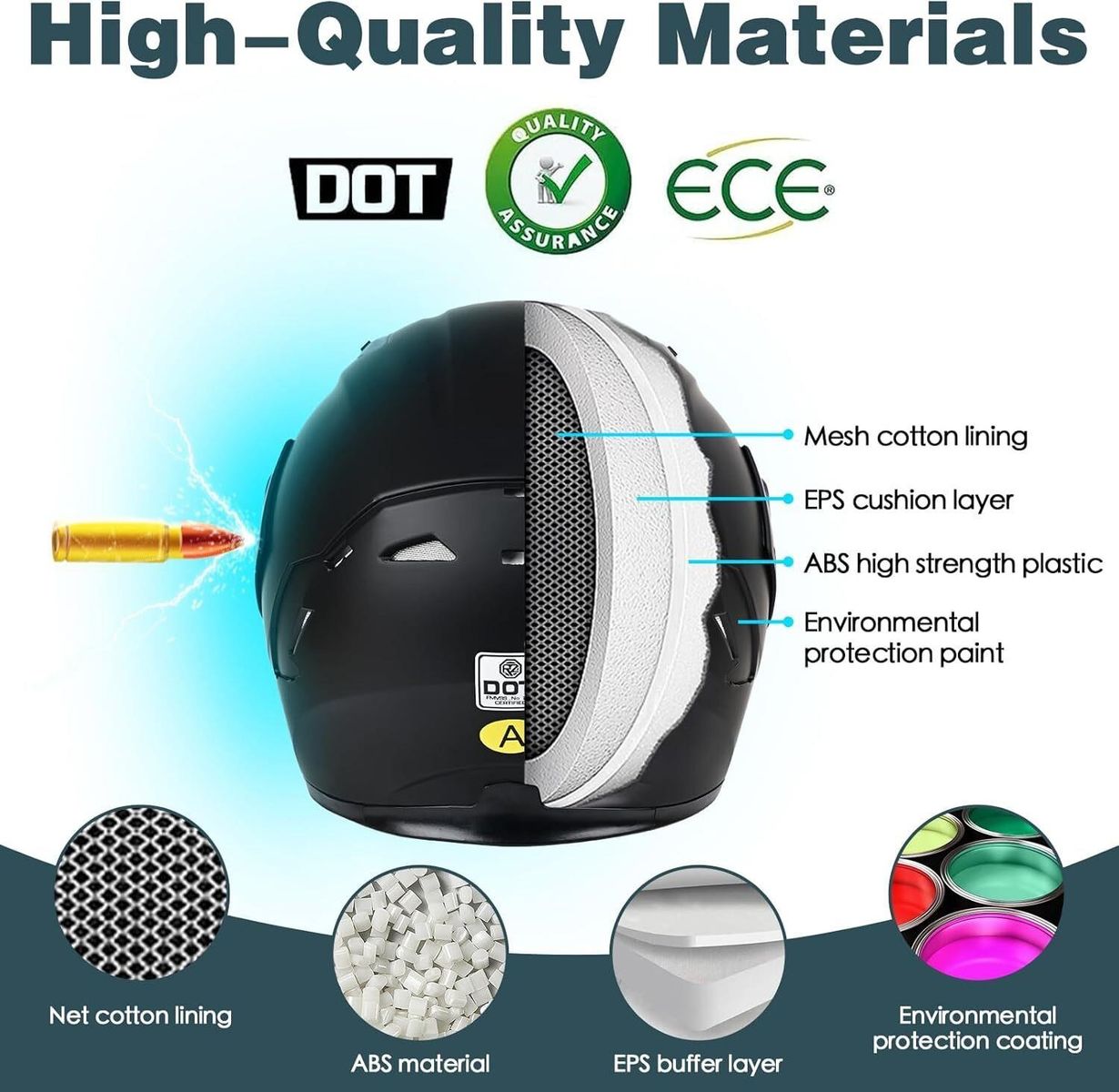 SAFETY CERTIFICATION - The Motorcycle Helmets meets the safety standard requirements of DOT FMVSS-218 This means that it has been approved for all road traffic in American. It is a very important safety tool in your outdoor life. BLUETOOTH HEADSET - The Motorcycle Bluetooth Helmet uses high-quality Bluetooth technology to provide stereo bass surround sound quality