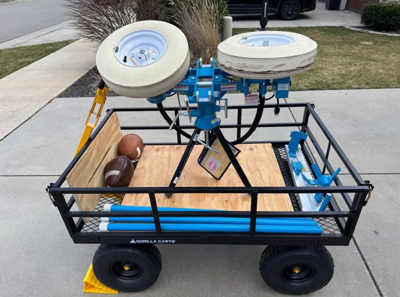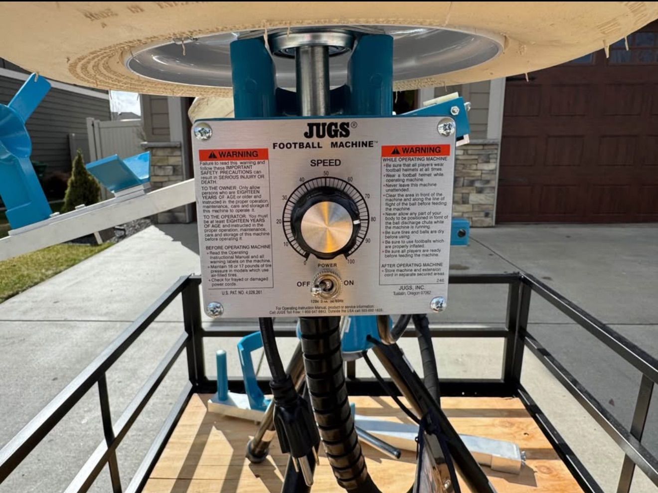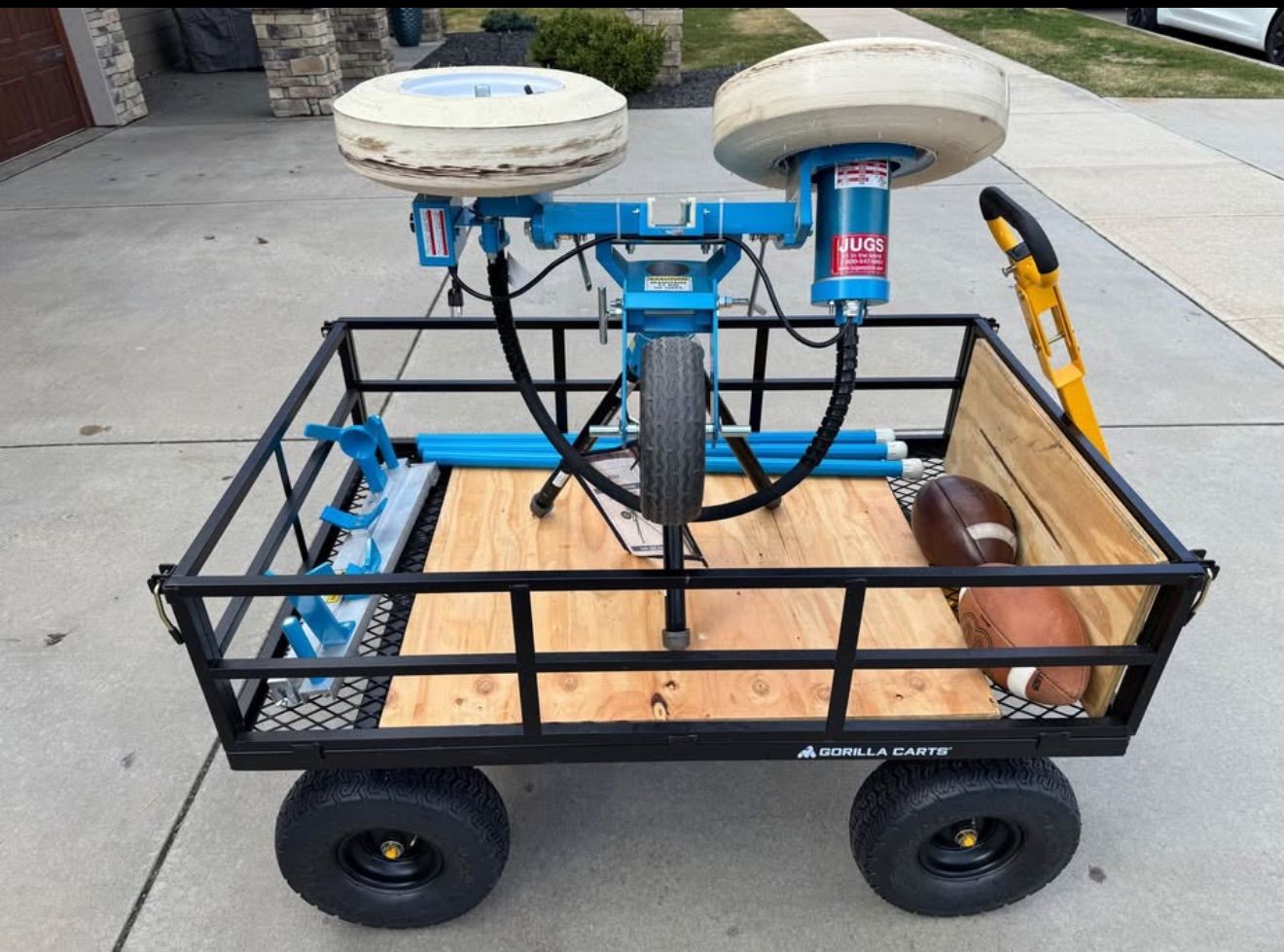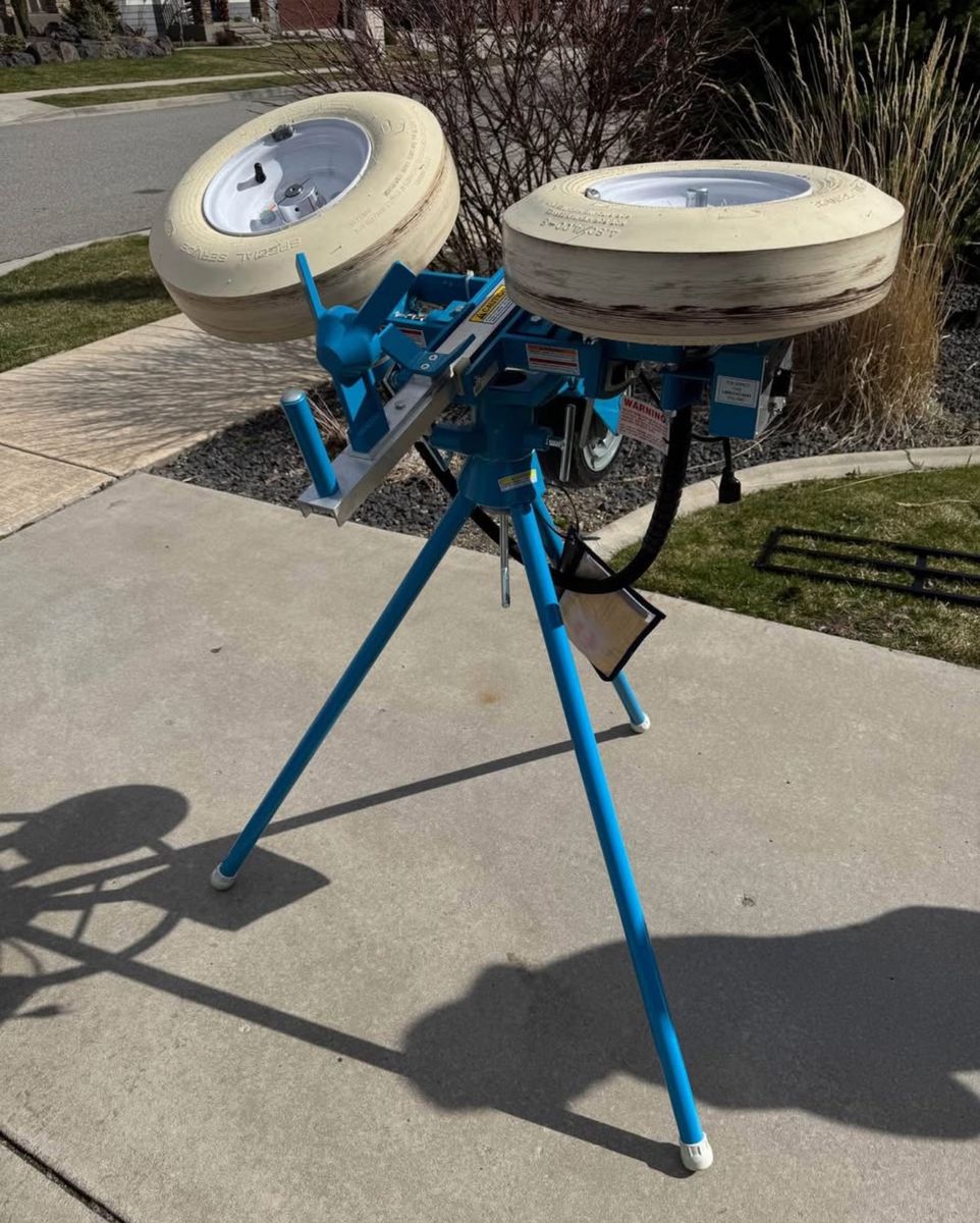 VenmoJUGS Football Pitching Machine - Model M1700 - lightly used - Jugs Machine was purchased from Dick’s Sporting Goods for $4,211.10. Will throw the football up to 100 mph or as low as you want. Purchased shorter pipes for legs to put in the wagon to haul machine to the backyard. Also have a large backdrop net and some footballs. Machine, wagon, backdrop net and shorter steel legs all for $3200.