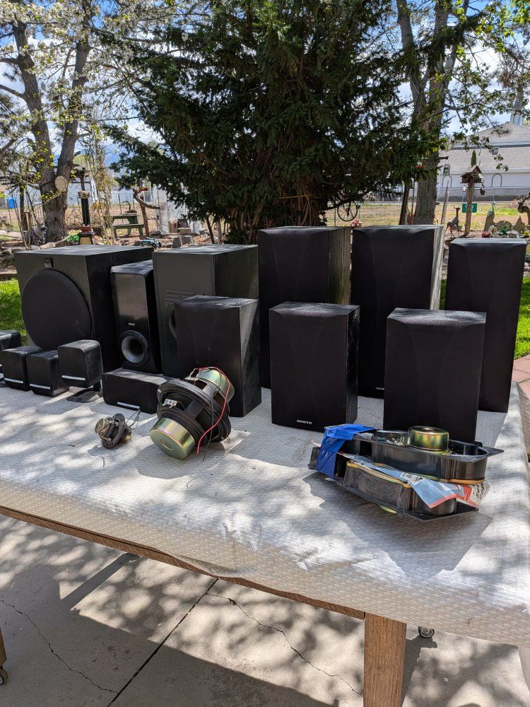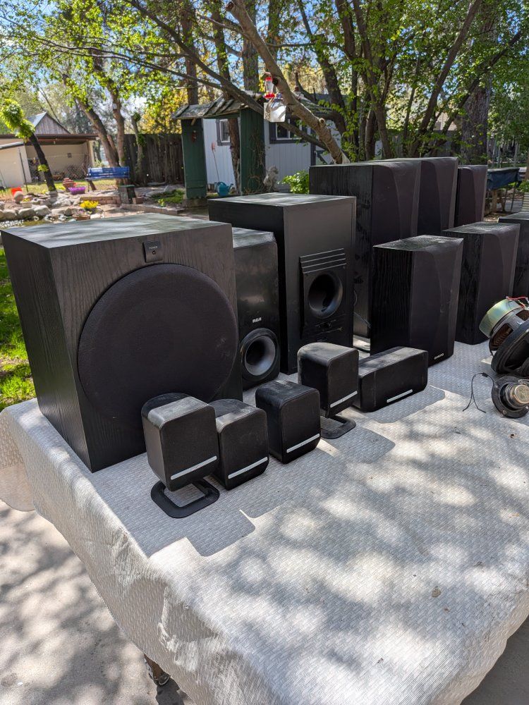 VenmoGreat speaker lot up for grabs. It has a big subwoofer, a smaller RCA subwoofer, several RCA satellite speakers, and some larger Onkyo speakers. Good for home theater setup or just extra audio.