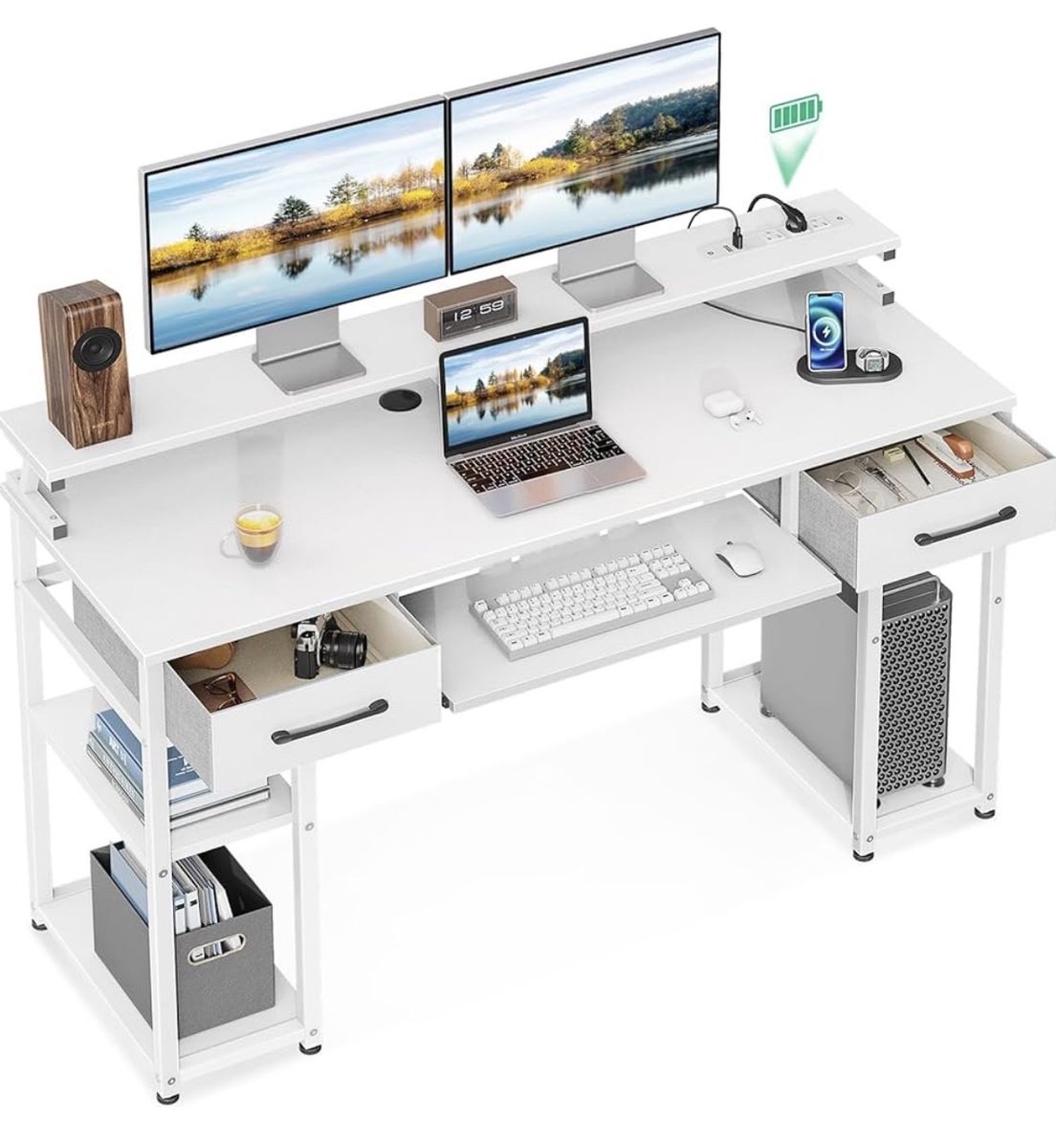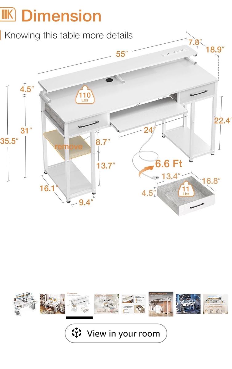 CashAppBLACK work desk with drawers, shelving, and a key board tray. Got it from Amazon about 2 years ago for $120. Then stopped working a few months later, it’s just been sitting in a closet. I don’t have any other photos of it assembled but I do have all the parts and know there aren’t any damages. The white desk is obviously a screenshot from Amazon, but it is the exact same desk. Pick up only. Serious inquiries only. Message for any questions. Desk is 55’ long (all dimensions included in photo