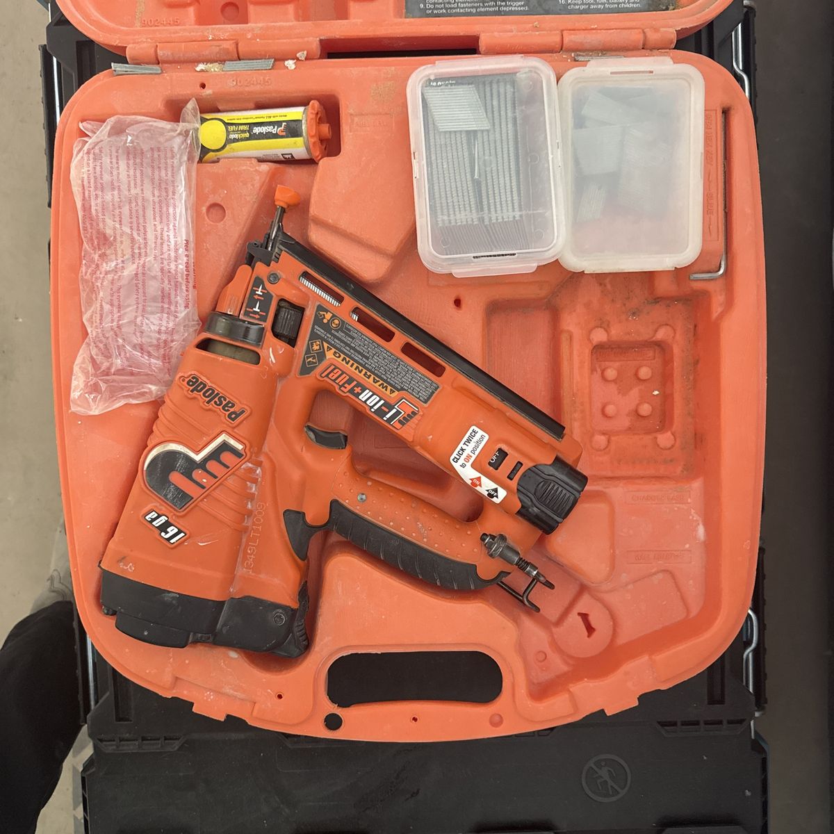 ApplePayPaslode 16 Gauge Angled Finish Nailer cordless, includes nailgun, battery, charger, and case. Available if listing is still up.