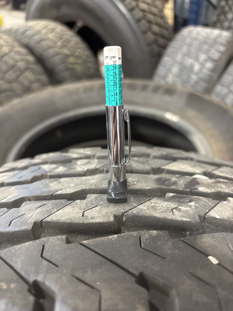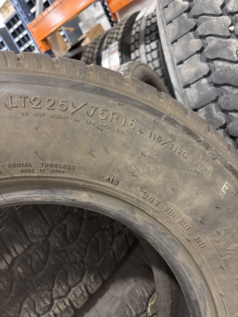 Single Goodyear LT225/75R16 115/112Q load E. Tread is at 8/32