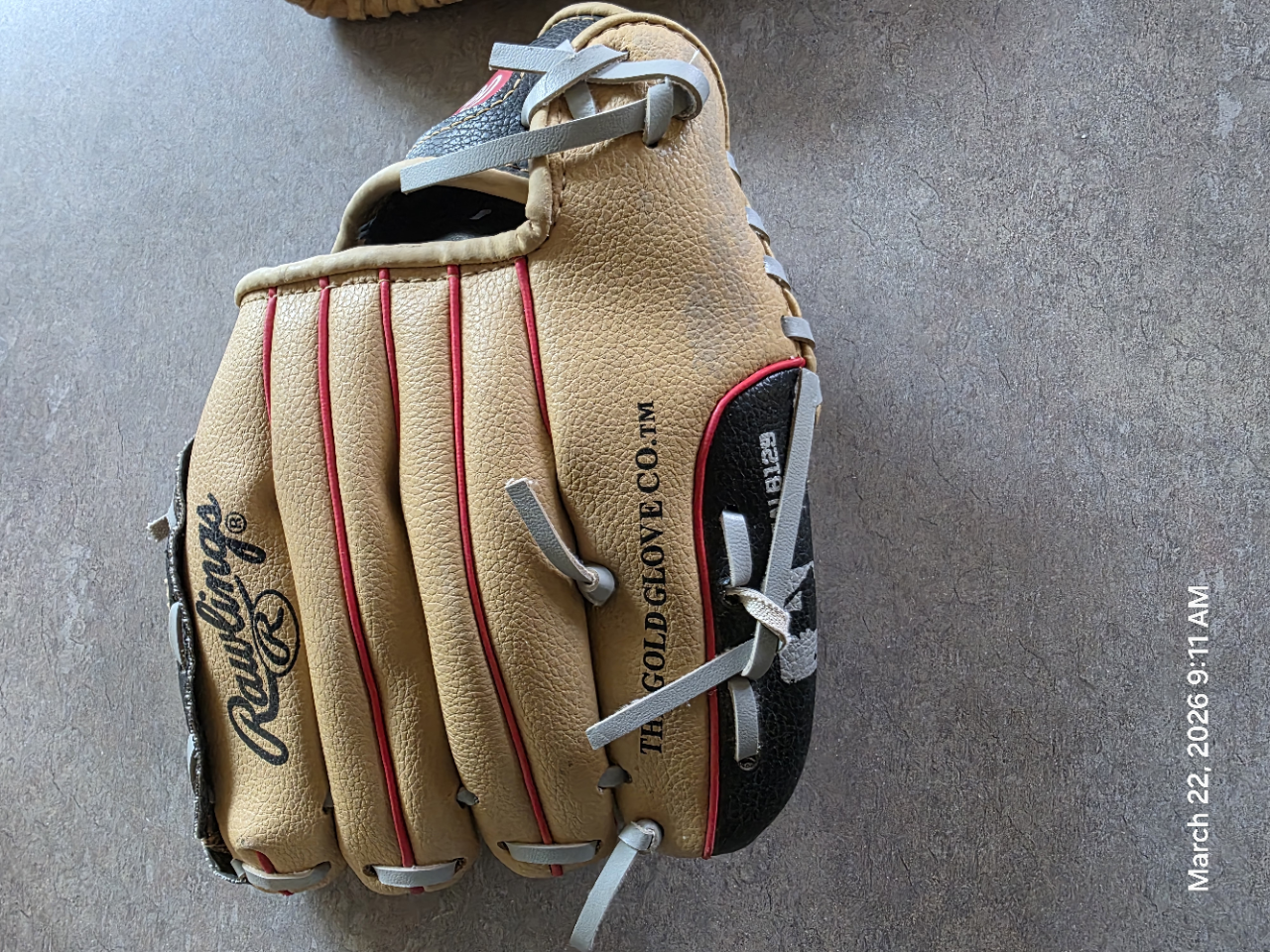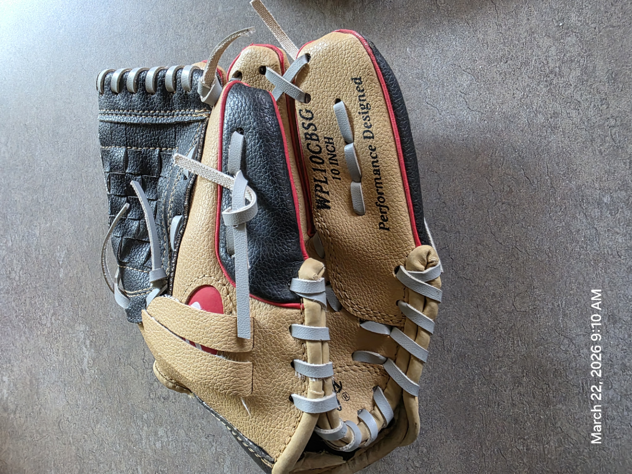 RAWLINGS 10 INCH TAN AND BLACK RH IN NEW CONDITION. The Rawlings Youth 10 inch Players Baseball Glove is a high quality, leather glove designed for all positions in baseball. This glove features a slip on cuff and a 5 finger style, perfect for beginner players. In EXCELLENT condition.