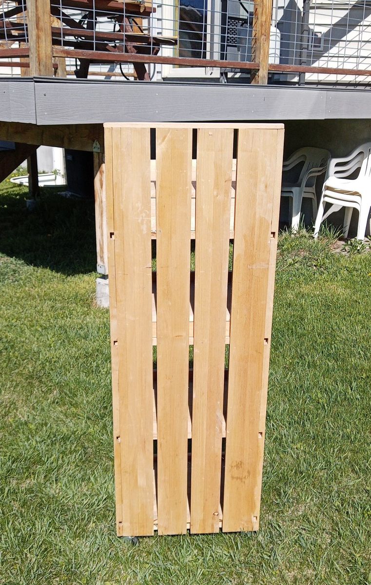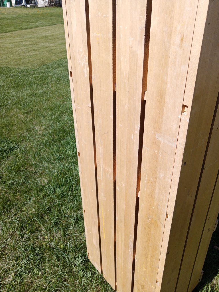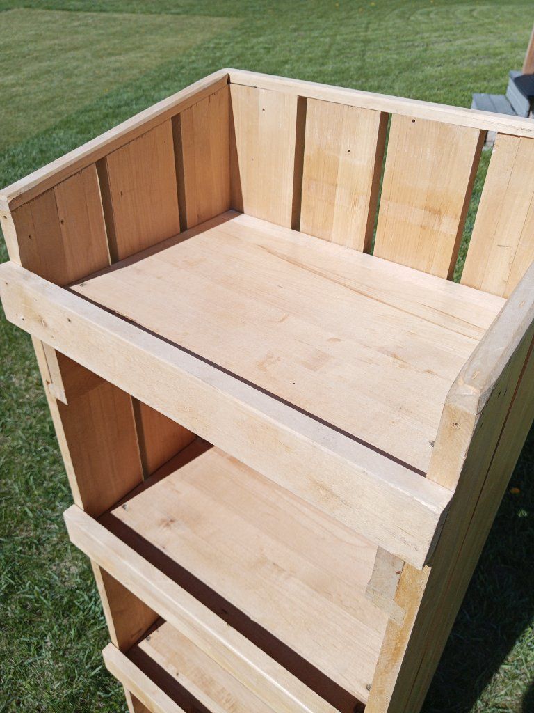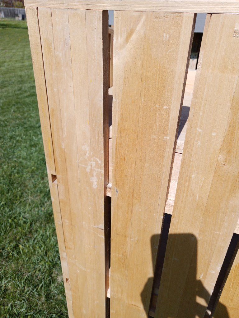 Well-built, but shows typical wear. The thin wood finish provides a natural look. Surfaces show some nicks and scuffs (see close up pictures). In addition, the wood may have slight residual odor from previous storage However, this display stand is solid and usable as is, or could be a fun upcycle project.