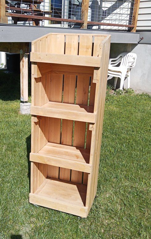 VenmoRolling Wooden Display Shelves Wheeled podium had 4 shelves to display products for sale. Ideal for small businesses, boutiques or craft fairs. Optional panel covers bottom shelf if desired.