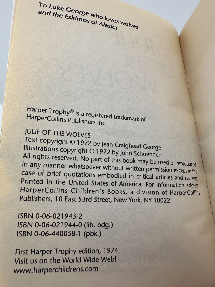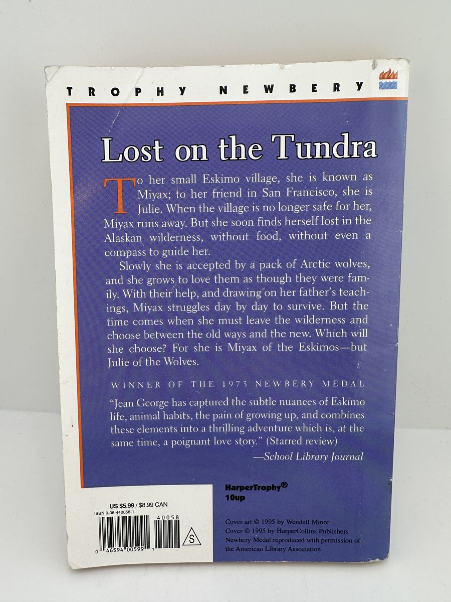 ApplePayClassic Newbery Medal-winning novel Julie of the Wolves by Jean Craighead George. This Harper Trophy paperback tells the powerful survival story of Miyax, a young girl lost in the Alaskan wilderness who forms a bond with a wolf pack.