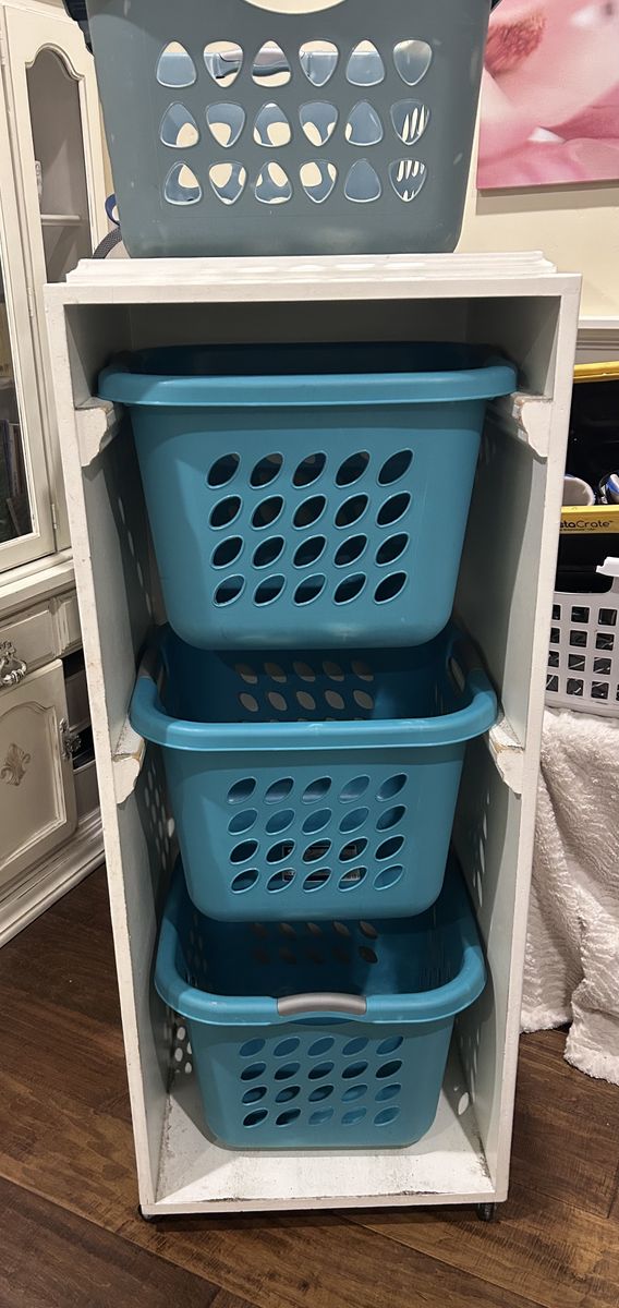 Built to last. Keeps 4 loads of laundry at once. Extra basket storage in bottom of shelf.