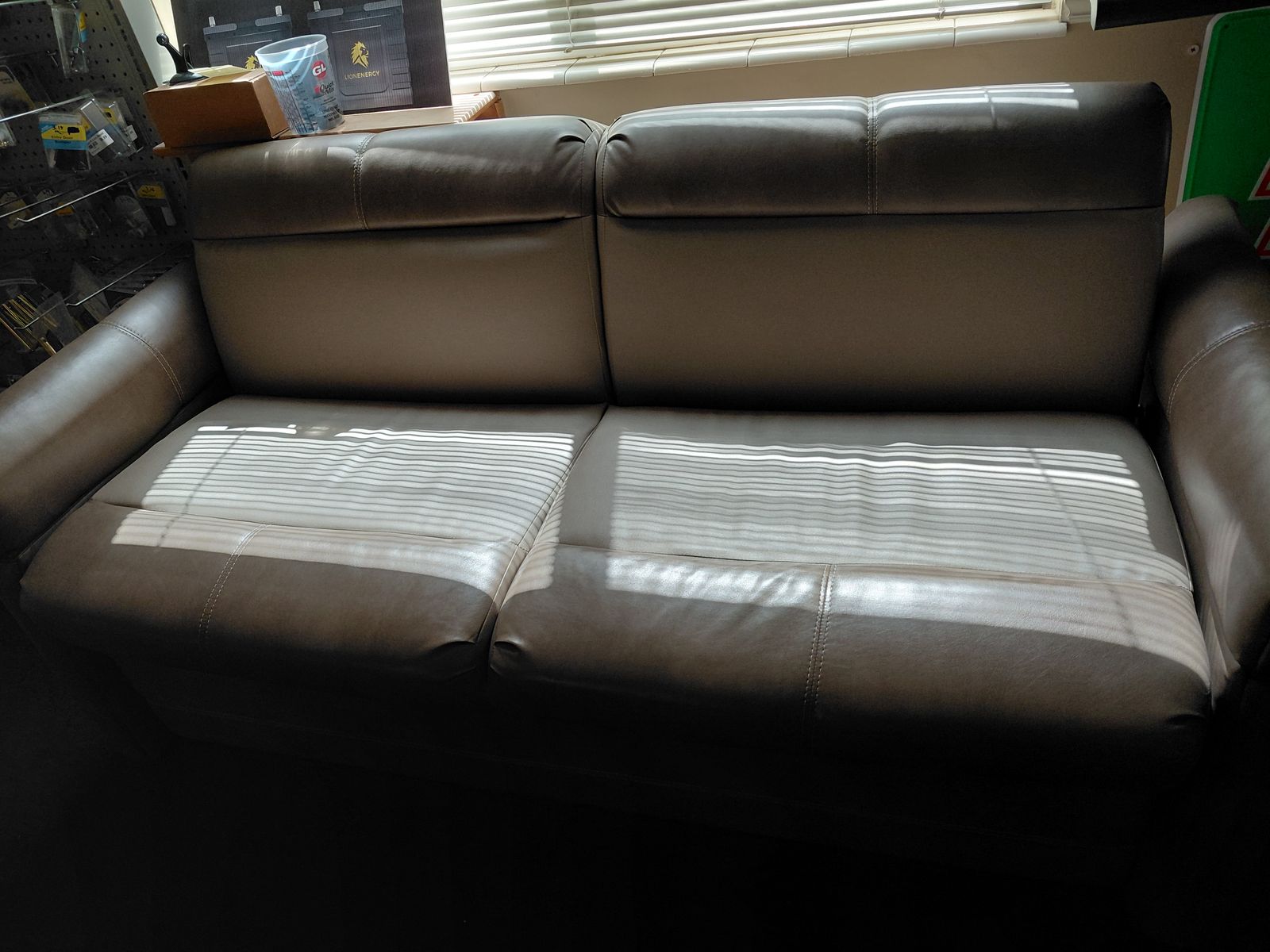 RV Jack knife sofa in excellent condition. Makes down into a bed. It's approximately 5ft long. The arms are removable. Tank and brown. Great for a van or bus remodel too.