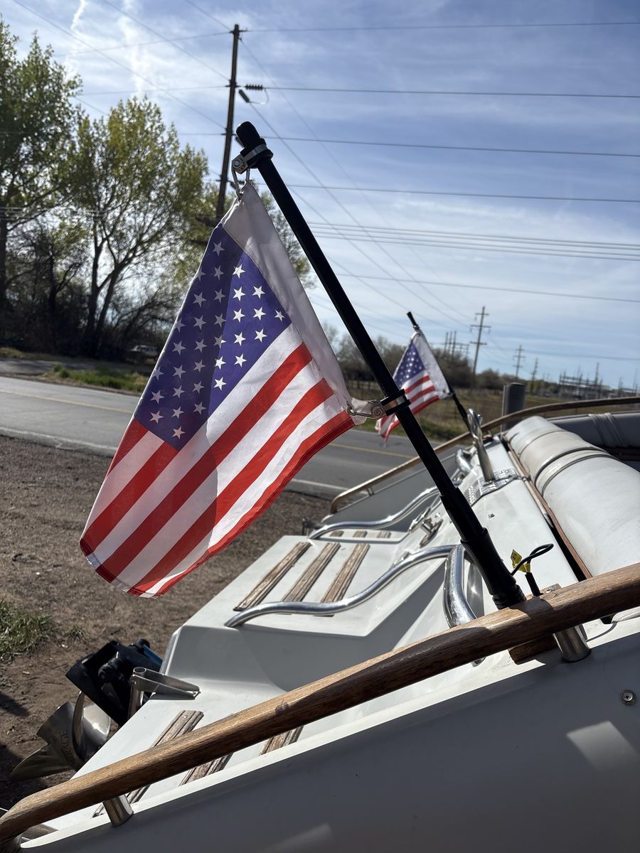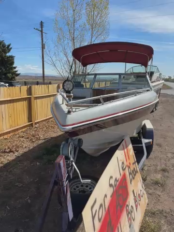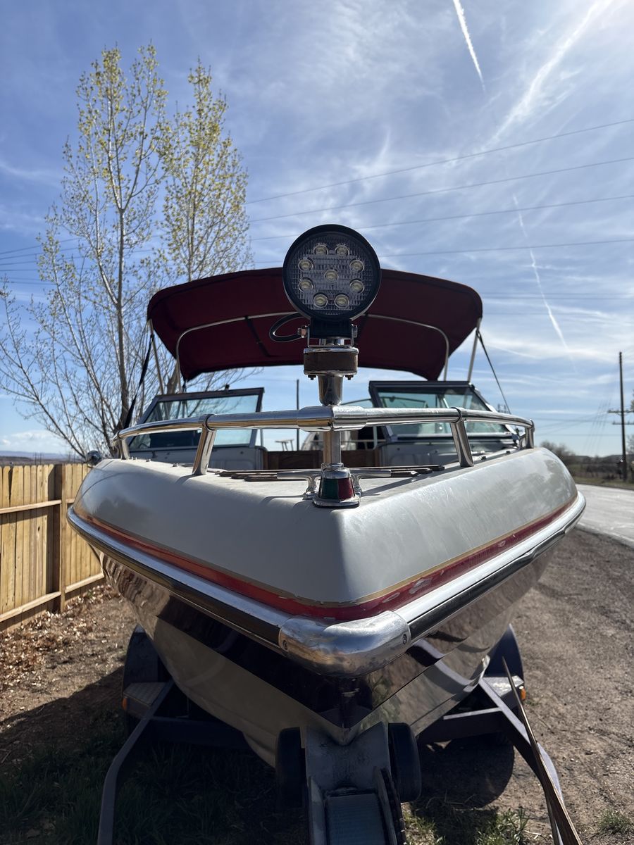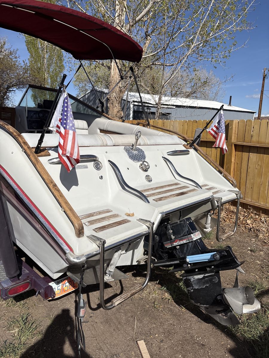 1989 celebrity 215 SE 21ft brovo one 7.4 litre 700 hours this is definitely an overpowered boat no dolphin, fin or wings needed for this outdrive and trailer is in perfect shape I also have the other set of seats for it. I took it out because really gets in the way of the coolers and having a blowup tube without having to deflate it all the time. You can get up to 50+ miles an hour the Prop spins out because I have a 21 pitch which should be perfect for a regular boat but this is not a regular boat you go to Lake Powell. You’re gonna need a 23 pitch Prop and be careful cause over 60 miles an hour get scary in a boat. I installed American flags that light up.
