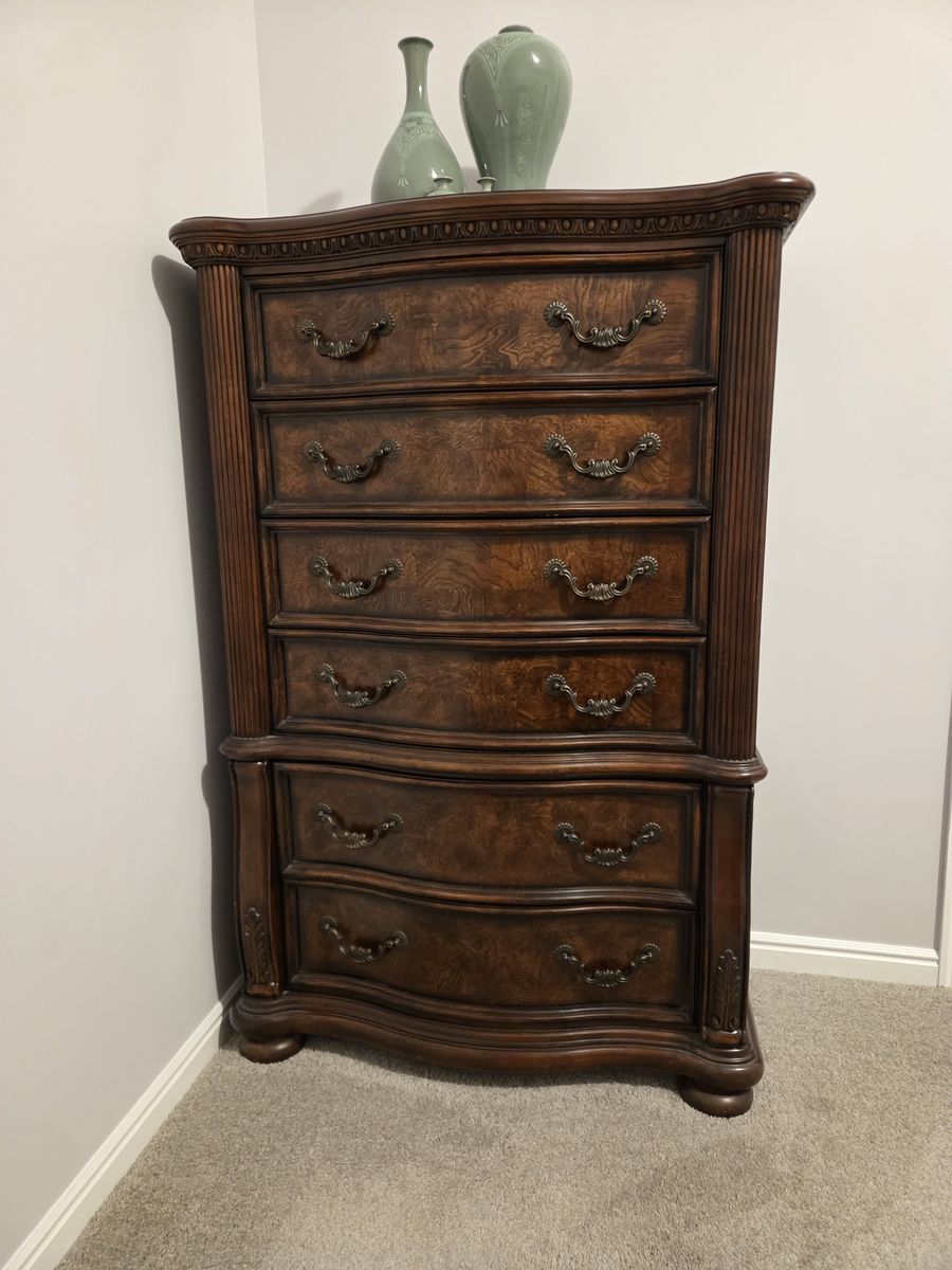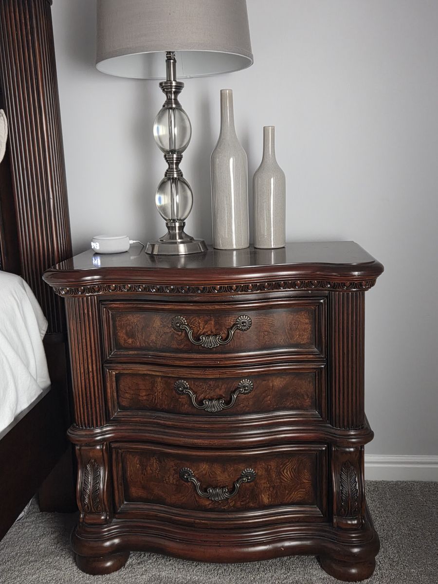 We are selling a quality bedroom set including a King Size bed with box springs (mattress not included), Two 3-drawer Night Stands, and a 6-drawer Chest of Drawers.