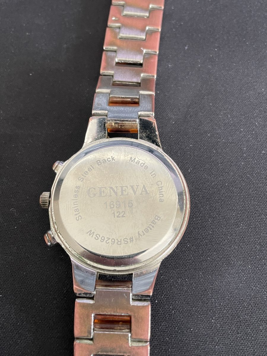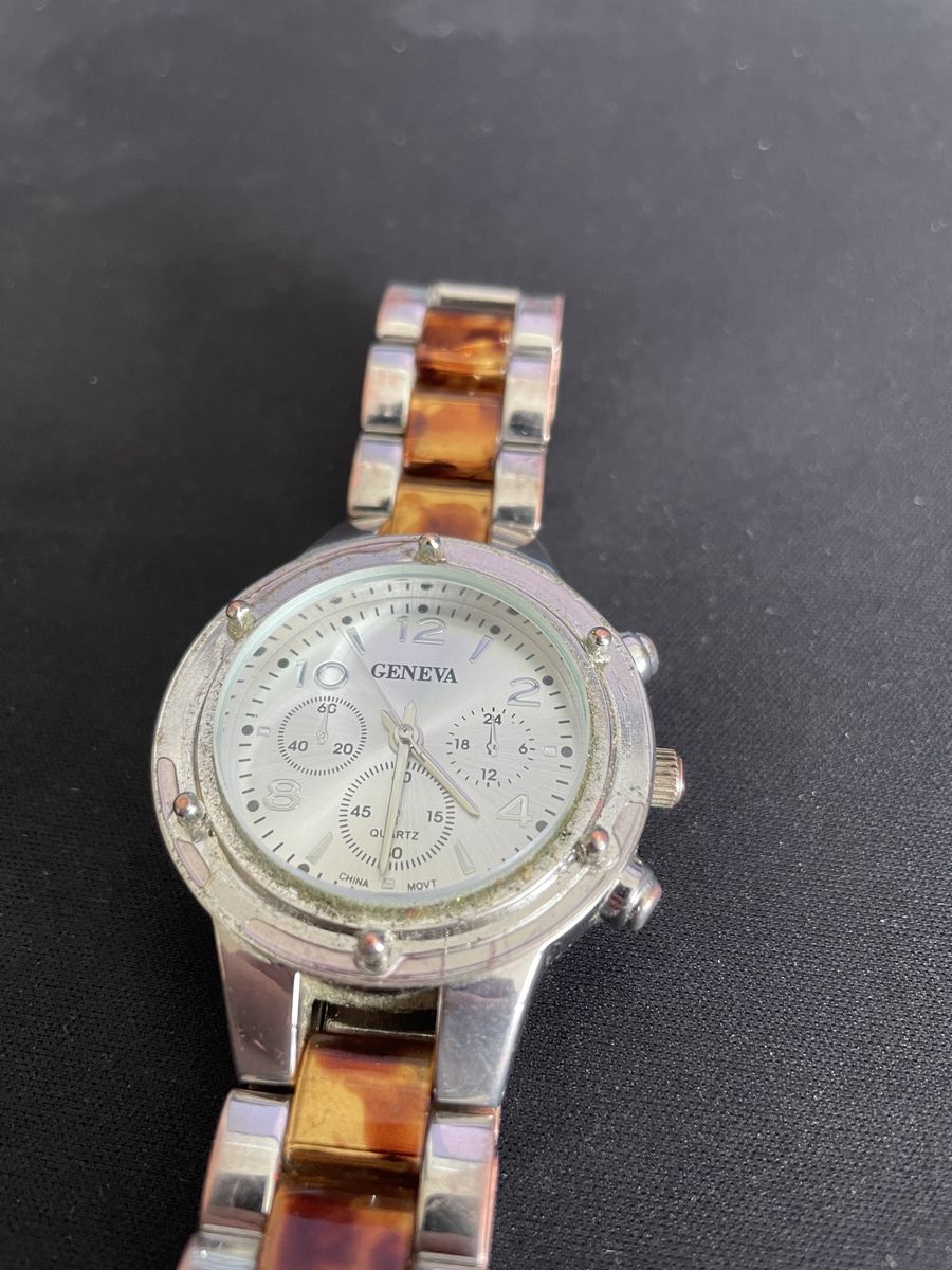 Nice Geneva watch with a tortoise-style band and silver case. It’s a simple, good-looking piece that goes with pretty much anything—casual or a little more dressed up.