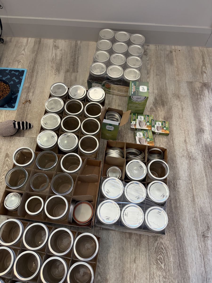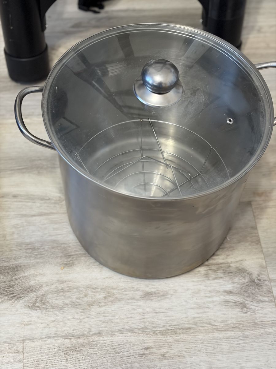 Used canning pot with lid. Includes various jars and cook