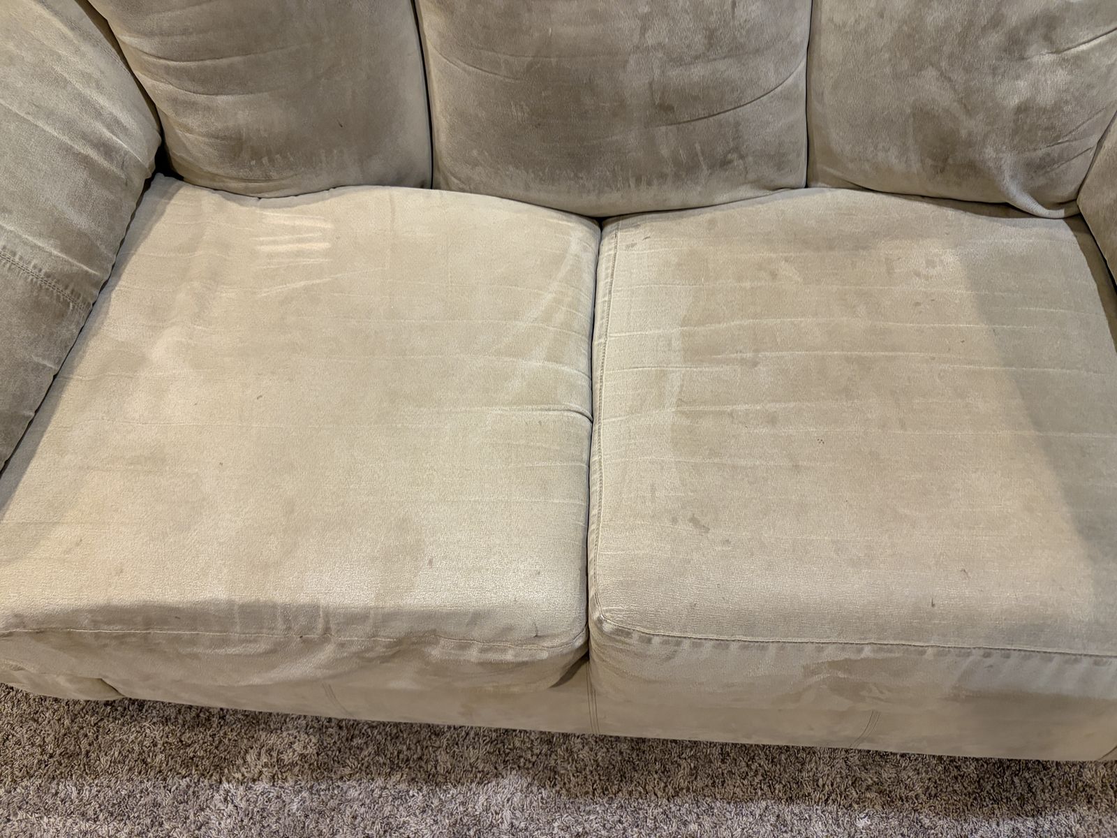 VenmoSelling a matching couch and loveseat set in a soft tan/microfiber fabric. These pieces are super comfortable with deep seats and plush cushions—perfect for relaxing, watching movies, or hosting guests. Both are sturdy and in good overall condition, with some visible wear and light staining from normal use (see photos). Comes from a smoke-free home.