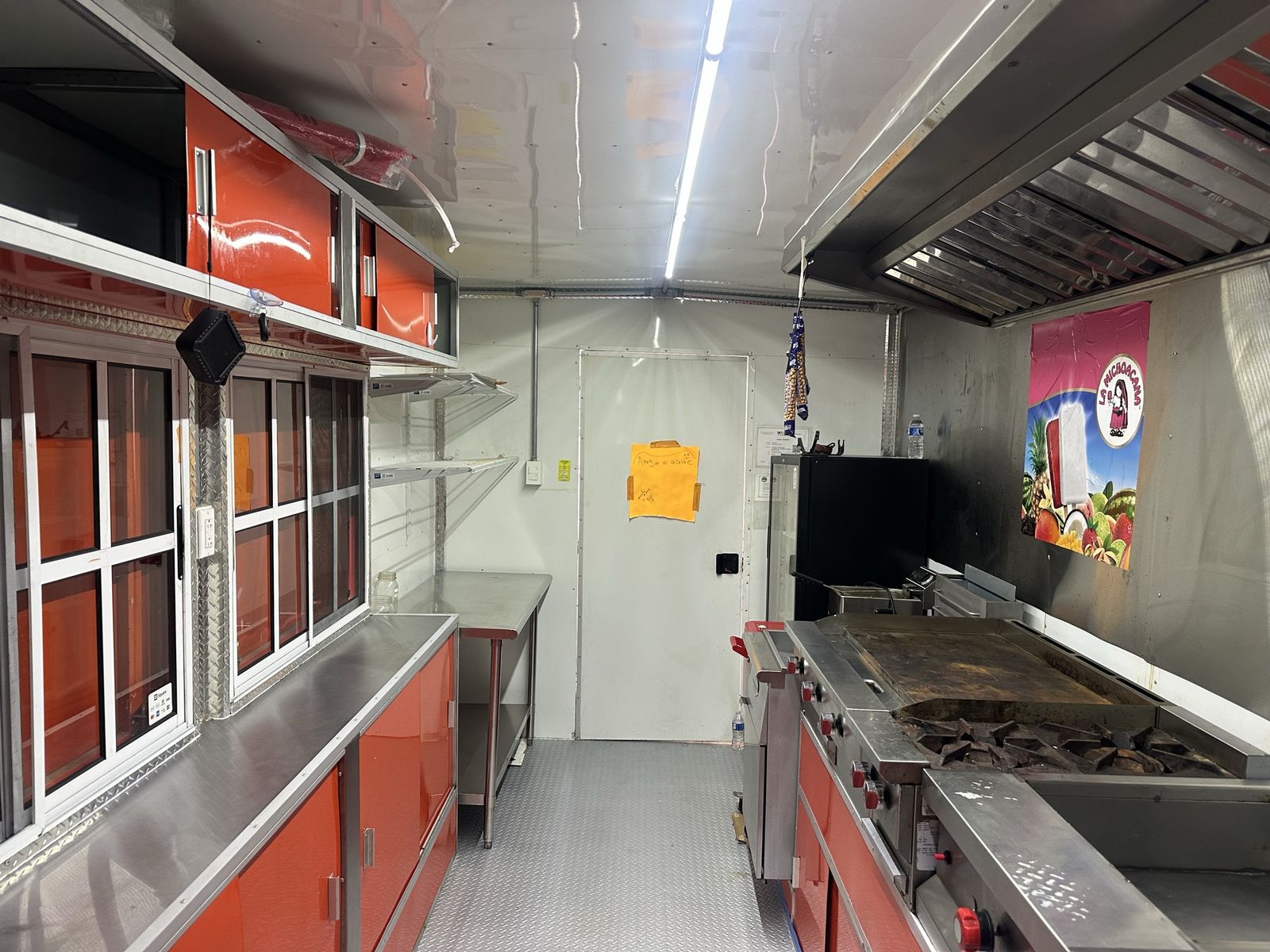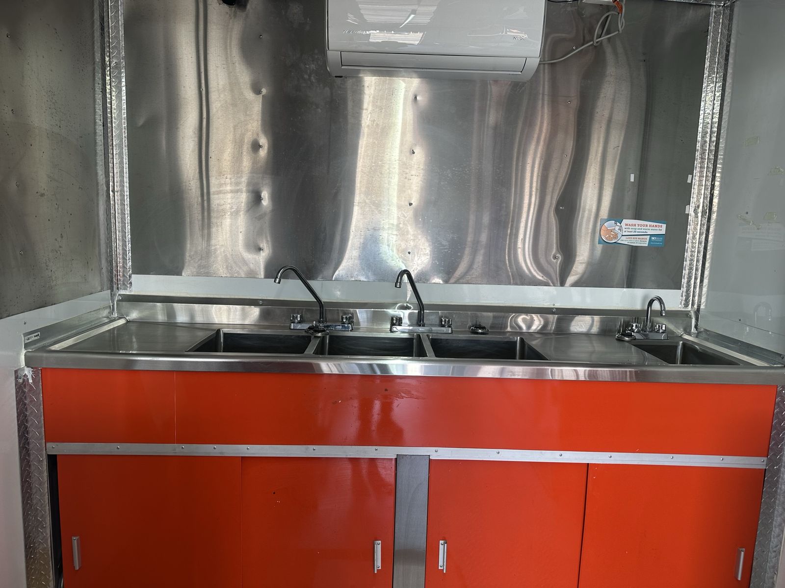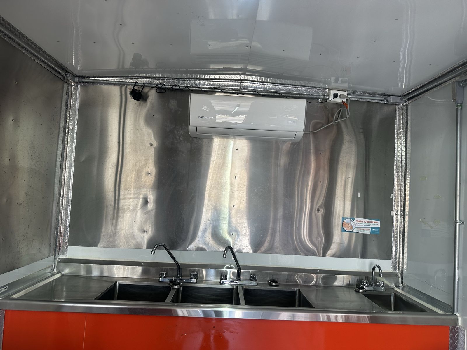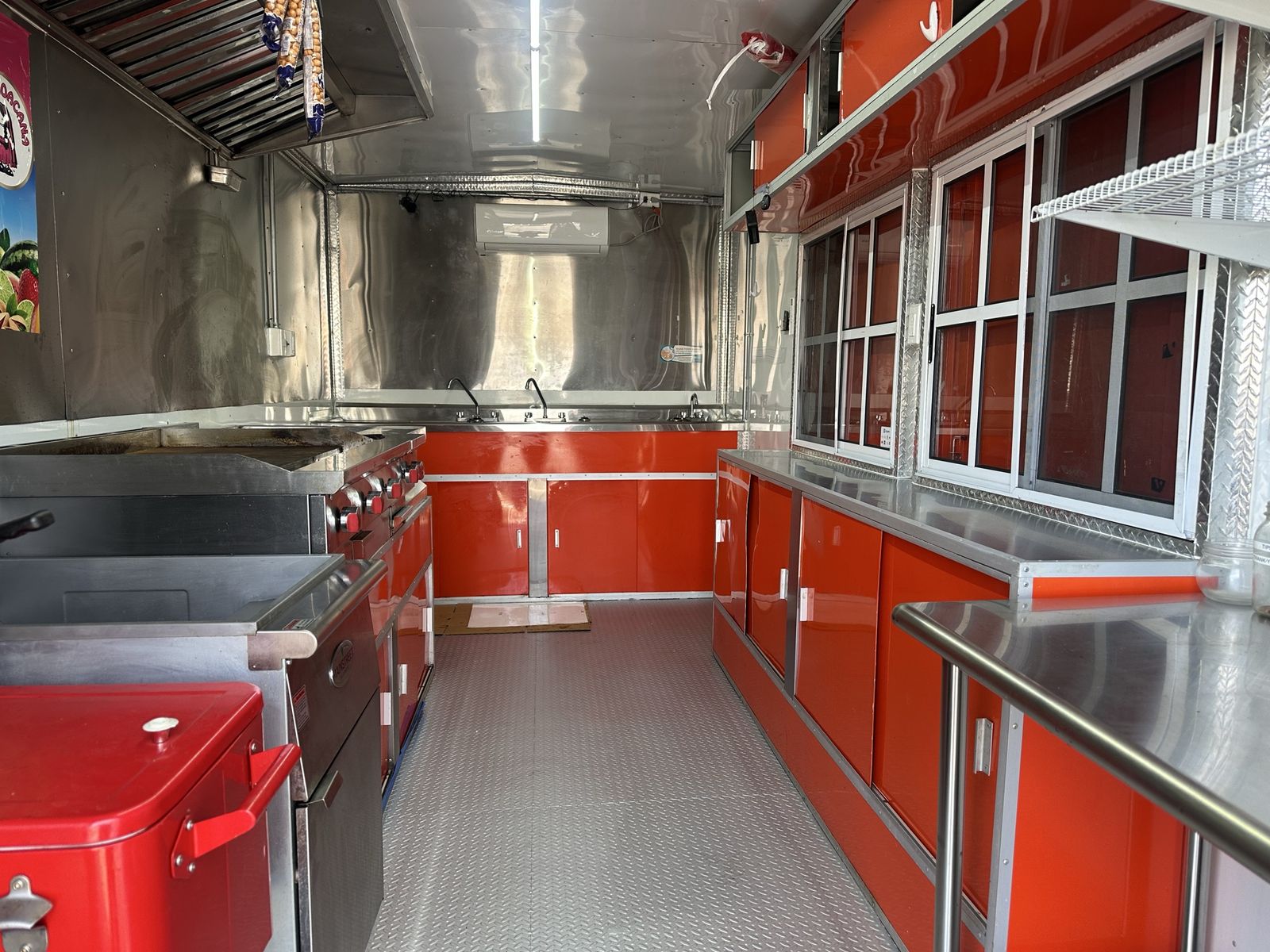 food trailer 8x18 orange color, 8 feets hood, A/C 1 ton, 3 sinks, 1 hand washer, commercial extractor, 80 pounds deep fryer, 36" grilled, 2 burners, steamer, 30 gallons clean water tank, 40 gallons grey water tank, water heater, water pump