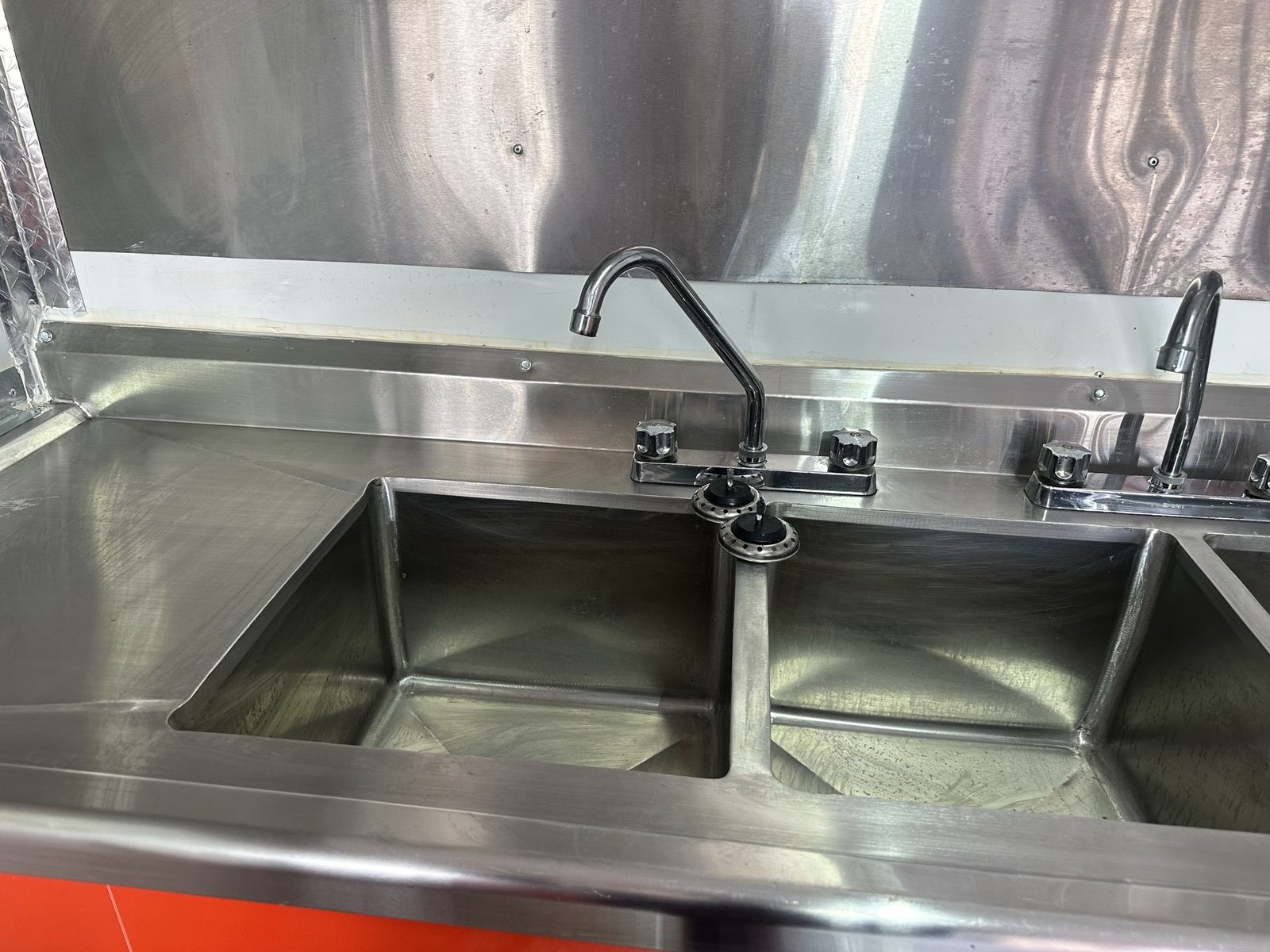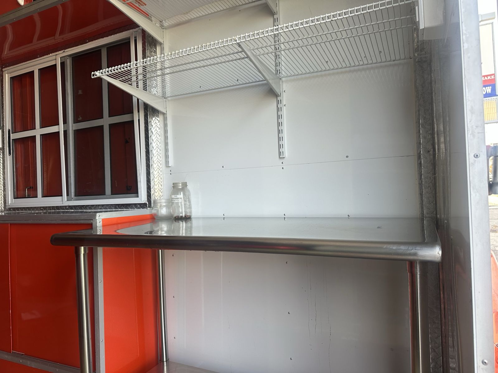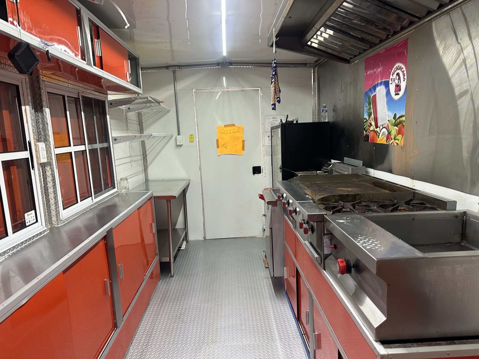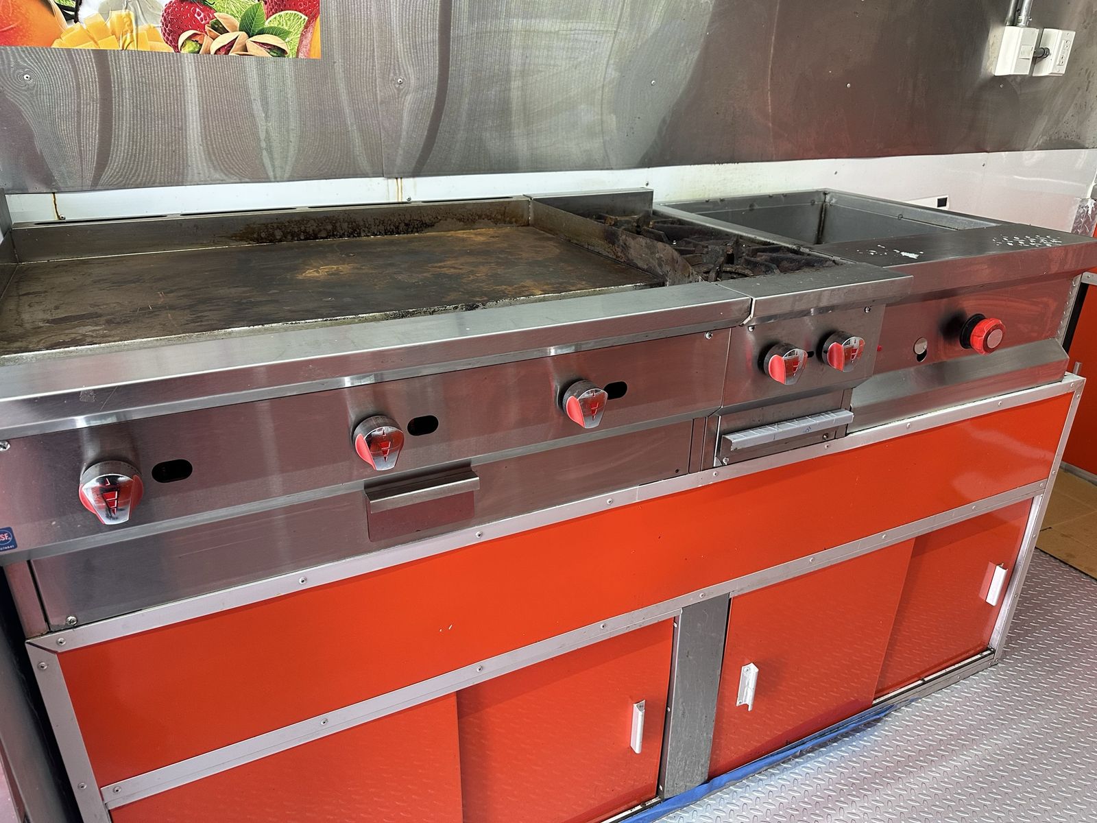 food trailer 8x18 orange color, 8 feets hood, A/C 1 ton, 3 sinks, 1 hand washer, commercial extractor, 80 pounds deep fryer, 36" grilled, 2 burners, steamer, 30 gallons clean water tank, 40 gallons grey water tank, water heater, water pump