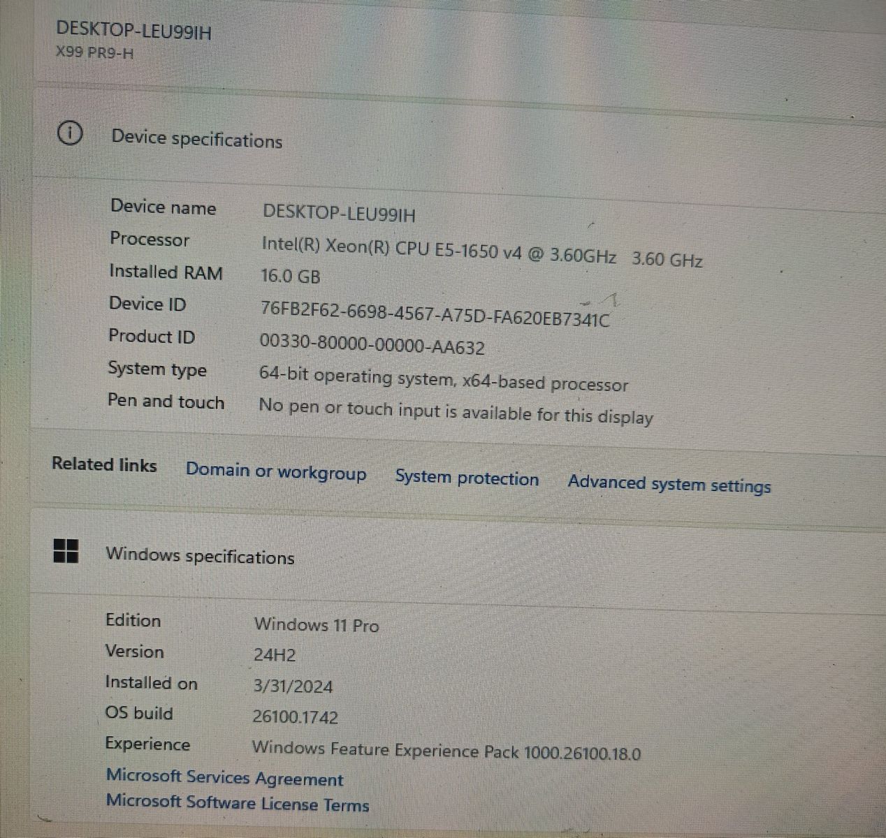 CPU:e5-1650v4 - (i7-8700) RAM:16gb DDR4 (256gb-ecc) storage: 500Gb NVME SSD GPU: RX 5700xt Wi-Fi and Bluetooth installed x99 motherboard Power: evga 510 watt psu