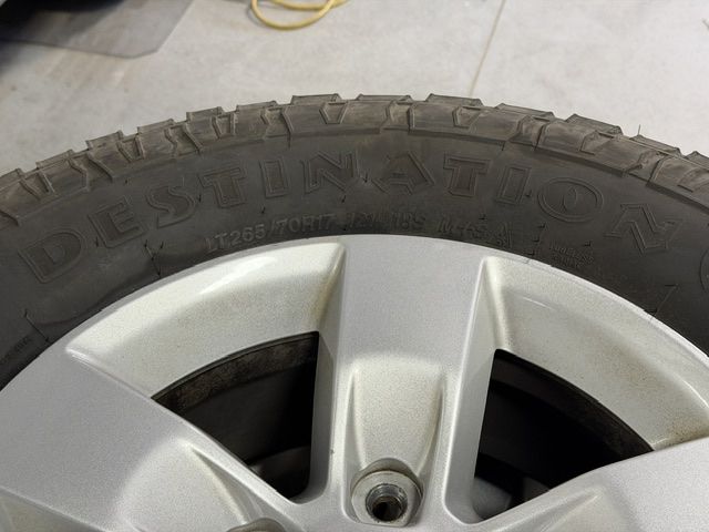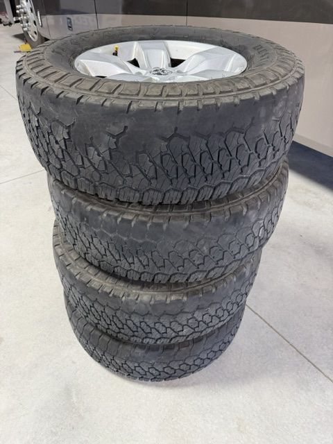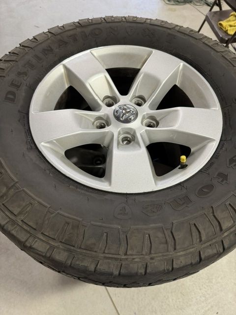 Stock wheels from a 2014 Dodge Ram 1500. In good condition. Tire pressure sensors still work. Tires are badly worn on the side due to truck alignment issues. 5x5.5” lug pattern.