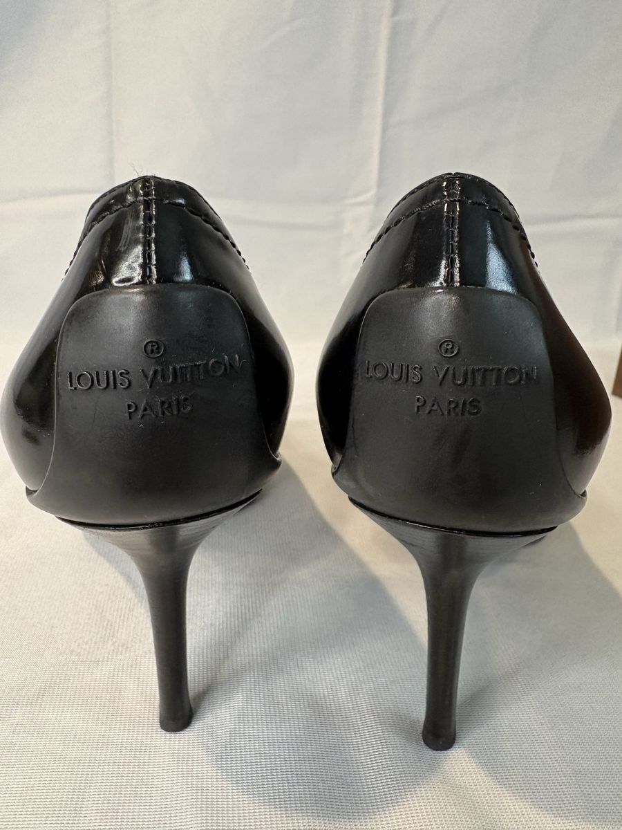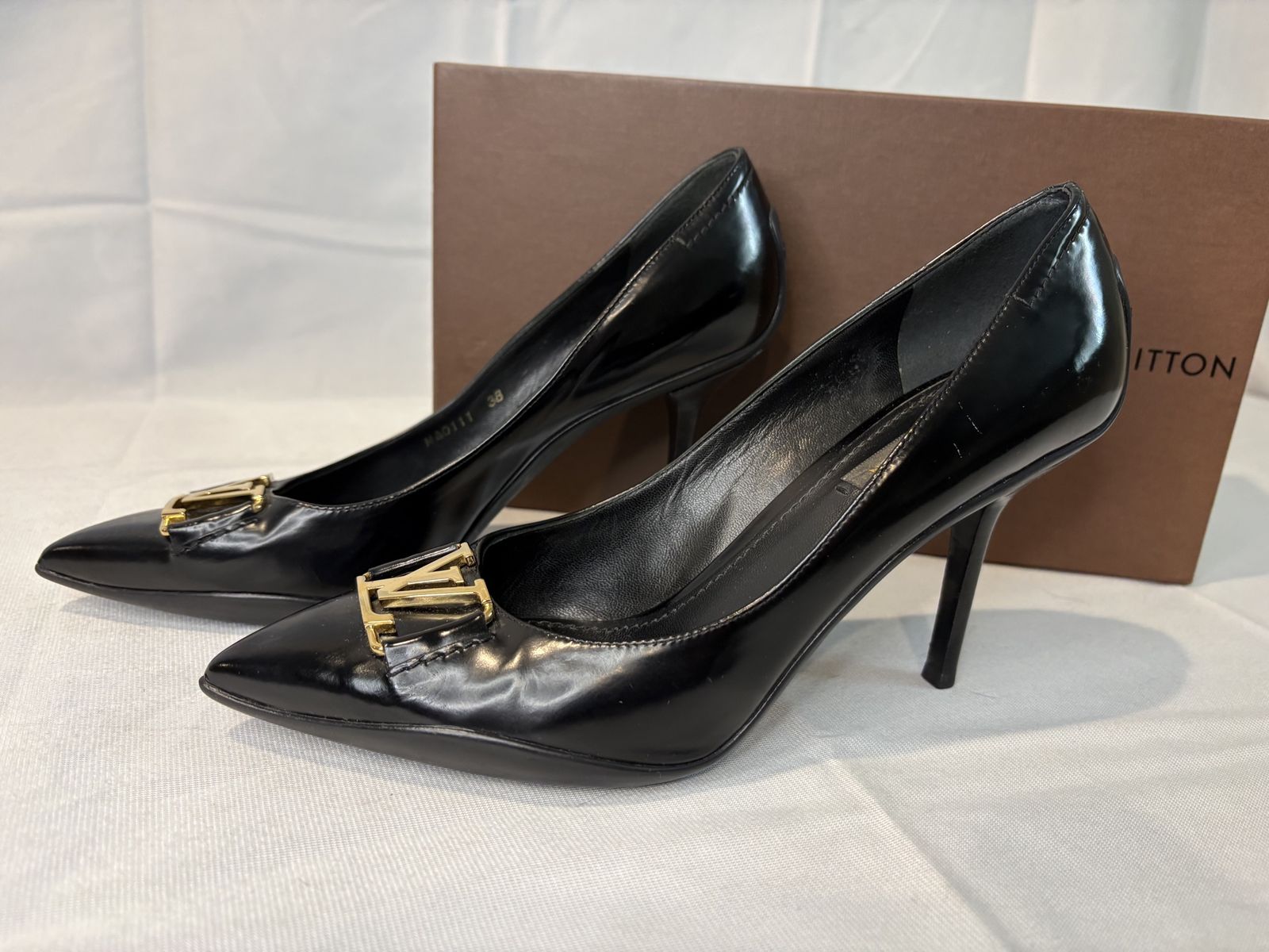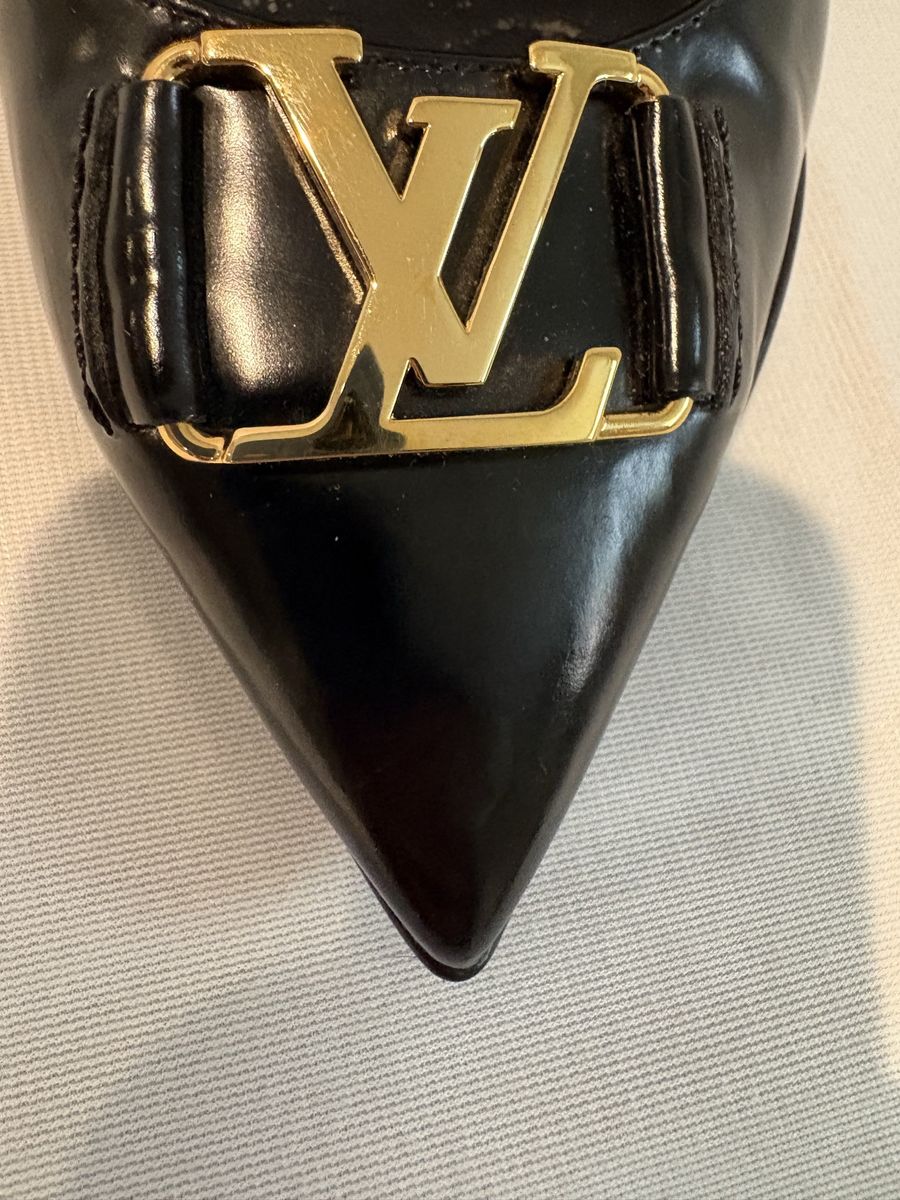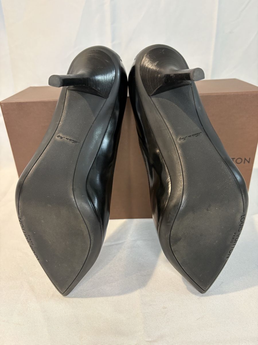 VenmoAuthentic Louis Vuitton black leather heels with iconic gold LV hardware. Elegant pointed toe design and classic stiletto heel. Includes original Louis Vuitton box and card. Previously valued by a local designer consignment boutique.