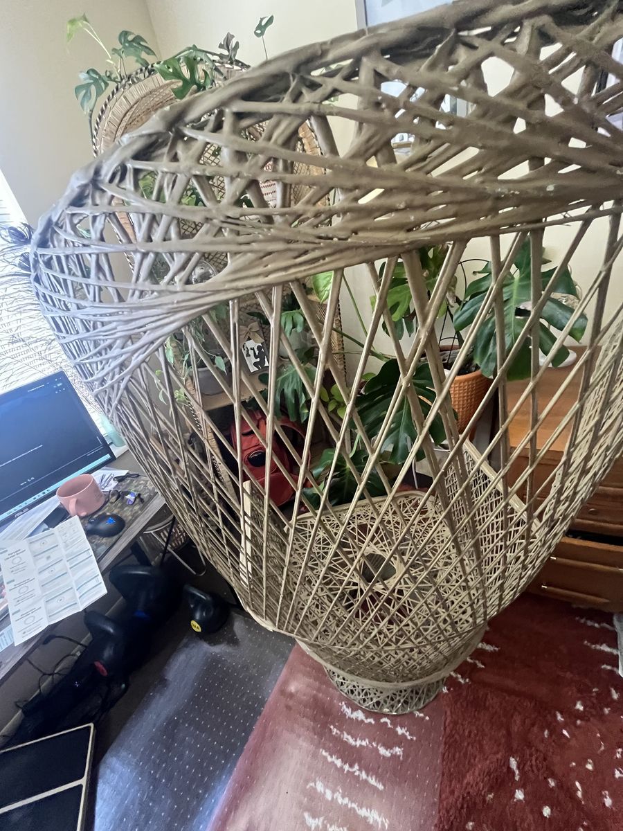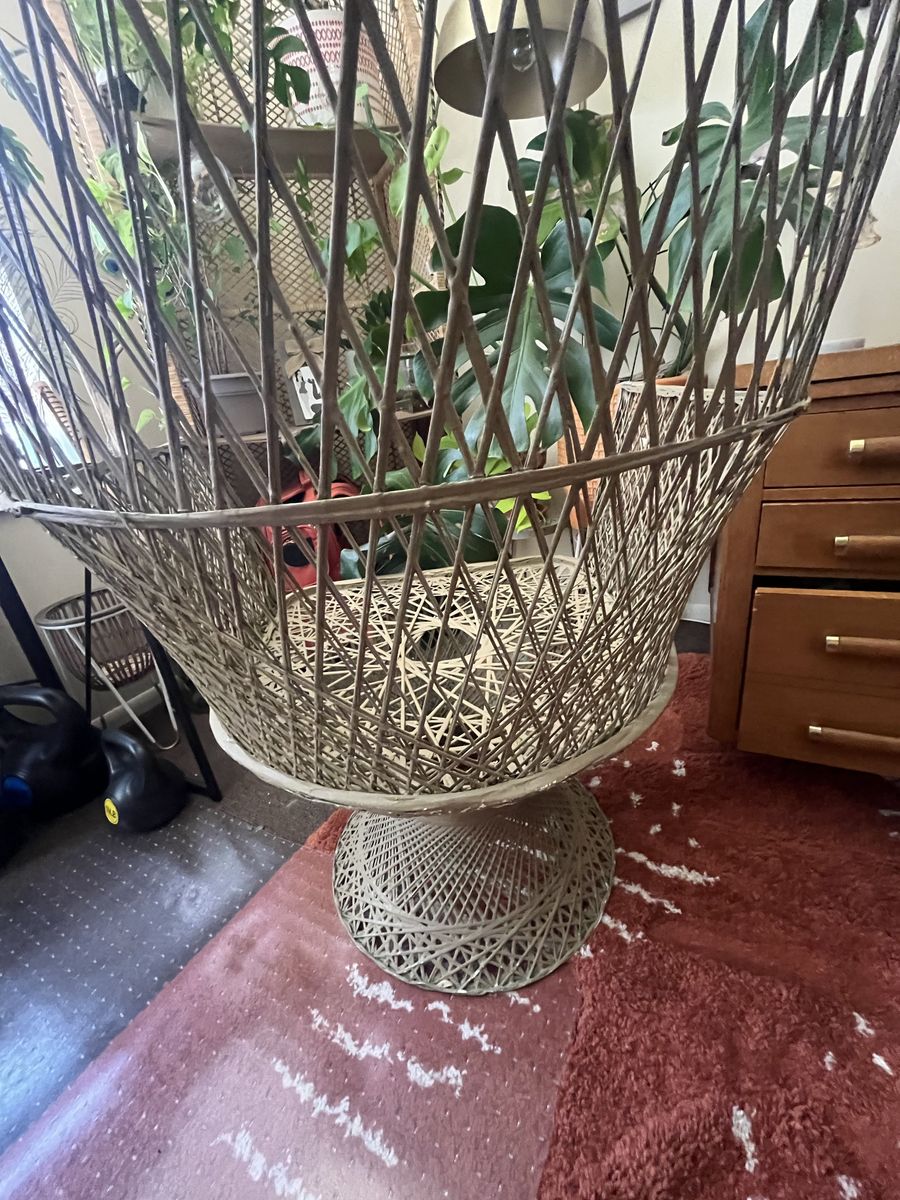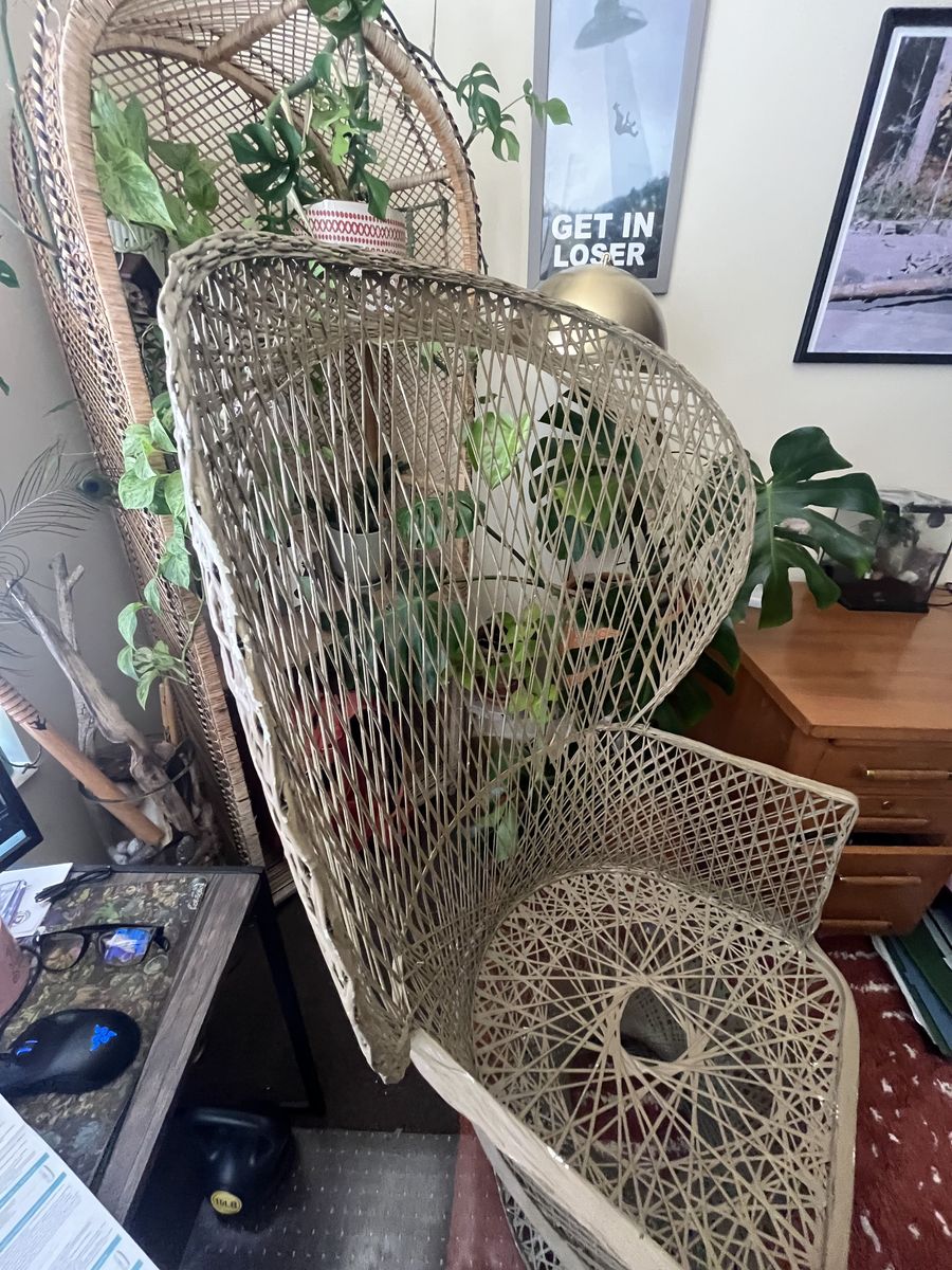 Beautiful statement chair with a tall fan back and woven rattan design.