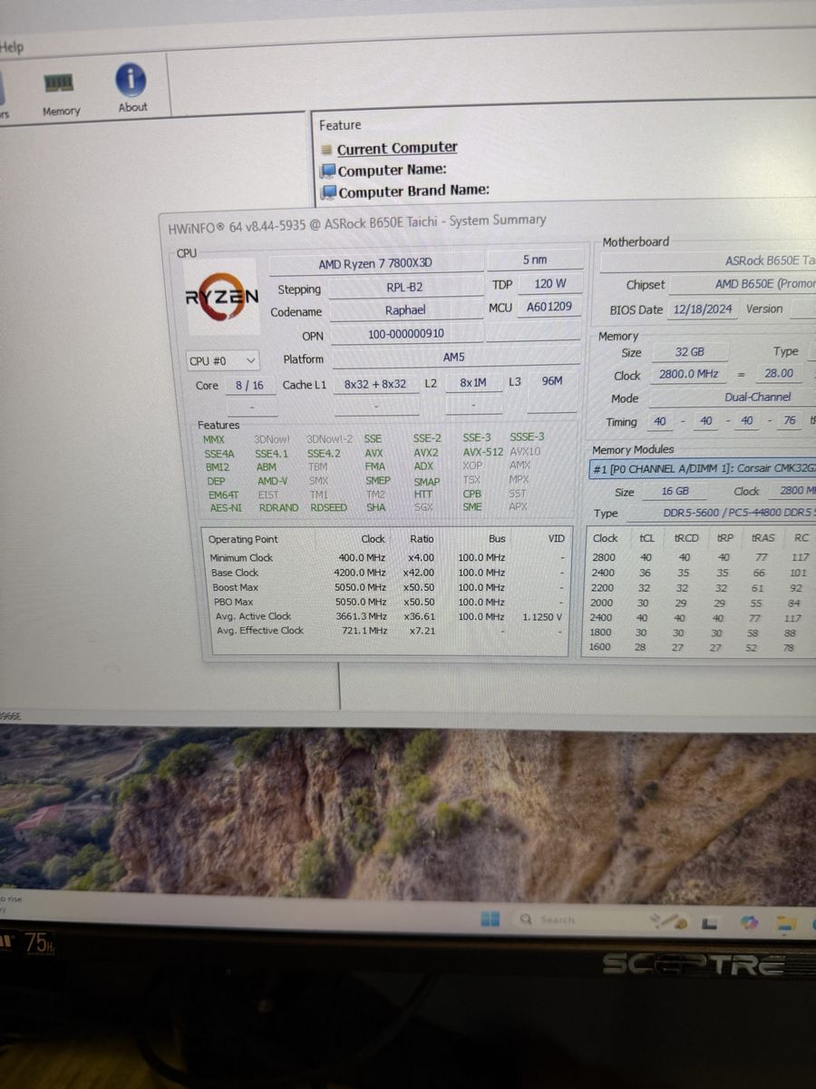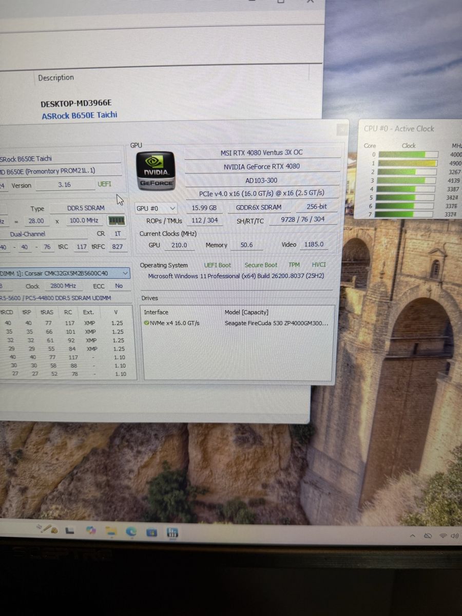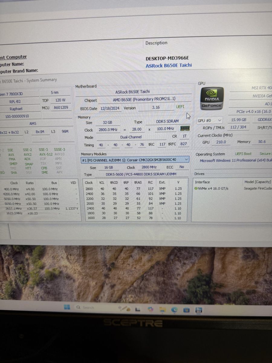 Specs: GPU: RTX 4080 16GB MSI Ventus 3X OC CPU: Ryzen 7 7800x3D RAM: 32GB DDR5 Corsair 5200MTs Storage: 2TB Seagate M.2 SSD Motherboard: AsRock B650-E Taichi PSU: MSI MAG 750W Gold Rated OS: Windows 11 Pro Activated