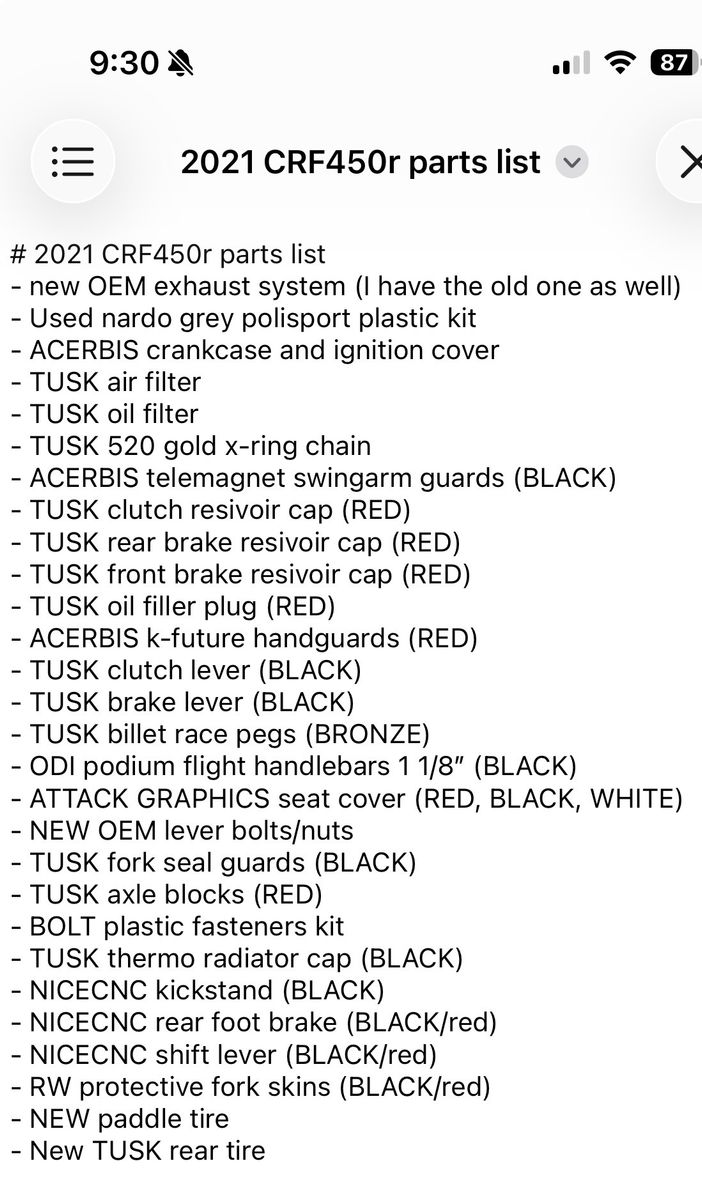 VenmoThis 2021 Honda CRF450r has low hours (around 40) and is in amazing condition. It just had over $1,000 worth of part installed on it as well. List of parts is in the pictures