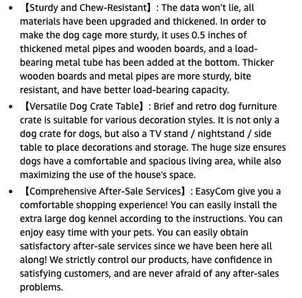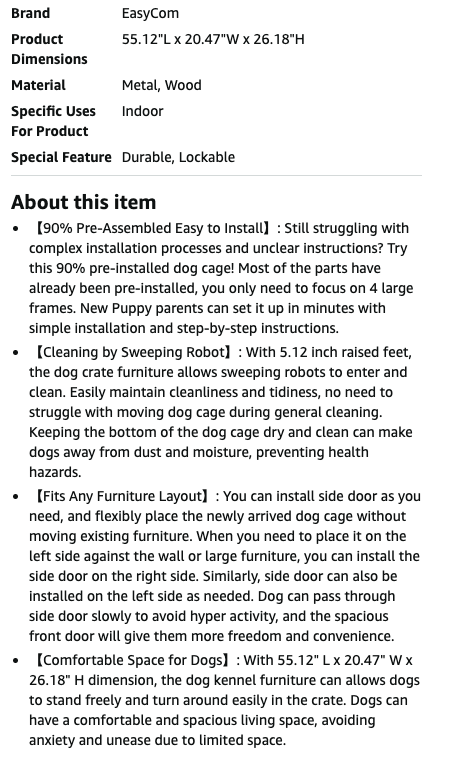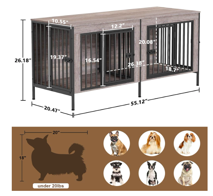 Black bars, 2 front doors, 2 end doors, removeable central divider, overall measurements are 55" long x 20.5" deep, x 26" high (with legs). For 1 to 2 dogs, 0-20 lbs. each. Assembly required.